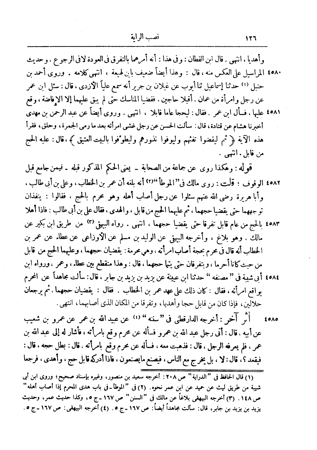 قَوْلُهُ: وَهَكَذَا رُوِيَ عَنْ جَمَاعَةٍ مِنْ الصَّحَابَةِ - يَعْنِي الْحُكْمَ الْمَذْكُورَ قَبْلَهُ - فَمَنْ جمع قَبْلَ الْوُقُوفِ، قُلْت: رَوَى مَالِكٌ فِي "الْمُوَطَّأِ" 2 أَنَّهُ بَلَغَهُ أَنَّ عُمَرَ بْنَ الْخَطَّابِ، وَعَلِيَّ بْنَ أَبِي طَالِبٍ وَأَبَا هُرَيْرَةَ رضي الله عنهم سُئِلُوا عَنْ رَجُلٍ أَصَابَ أَهْلَهُ وَهُوَ مُحْرِمٌ بِالْحَجِّ، فَقَالُوا: يُنَفِّذَانِ تَوَجُّهَهُمَا حَتَّى يَقْضِيَا حَجَّهُمَا، ثُمَّ عَلَيْهِمَا الْحَجُّ مِنْ قَابِلٍ، وَالْهَدْيُ، فَقَالَ عَلِيُّ بْنُ أَبِي طَالِبٍ: فَإِذَا أَهَلَّا بِالْحَجِّ مِنْ عَامٍ قَابِلٍ تَفَرَّقَا حَتَّى يَقْضِيَا حَجَّهُمَا، انْتَهَى. رَوَاهُ الْبَيْهَقِيُّ 3 مِنْ طَرِيقِ ابْنِ بُكَيْر عَنْ مَالِكٍ، وَهُوَ بَلَاغٌ، وَأَخْرَجَهُ الْبَيْهَقِيُّ عَنْ الْوَلِيدِ بْنِ مُسْلِمٍ عَنْ الْأَوْزَاعِيِّ عَنْ عَطَاءٍ عَنْ عُمَرَ بْنِ الْخَطَّابِ أَنَّهُ قَالَ فِي مُحْرِمٍ بِحَجَّةٍ أَصَابَ امْرَأَتَهُ، وَهُوَ مُحْرِمٌ: يَقْضِيَانِ حَجَّهُمَا، وَعَلَيْهِمَا الْحَجُّ مِنْ قَابِلٍ مِنْ حَيْثُ كَانَا أَحْرَمَا، وَيَتَفَرَّقَانِ حَتَّى يُتِمَّا حَجَّهُمَا، قَالَ: وَهَذَا مُنْقَطِعٌ بَيْنَ عَطَاءٍ، وَعُمَرَ، وَرَوَاهُ ابْنُ أَبِي شَيْبَةَ فِي "مُصَنَّفِهِ" حَدَّثَنَا ابْنُ عُيَيْنَةَ عَنْ يَزِيدَ بْنِ يَزِيدَ بْنِ جَابِرٍ، قَالَ: سَأَلْت مُجَاهِدًا عَنْ الْمُحْرِمِ يُوَاقِعُ امْرَأَتَهُ، فَقَالَ: كَانَ ذَلِكَ عَلَى عَهْدِ عُمَرَ بْنِ الْخَطَّابِ. فَقَالَ: يَقْضِيَانِ حَجَّهُمَا، ثُمَّ يَرْجِعَانِ حَلَالًا، فَإِذَا كَانَ مِنْ قَابِلٍ حَجَّا وَأَهْدَيَا، وَتَفَرَّقَا مِنْ الْمَكَانِ الَّذِي أَصَابَهُمَا، انْتَهَى.