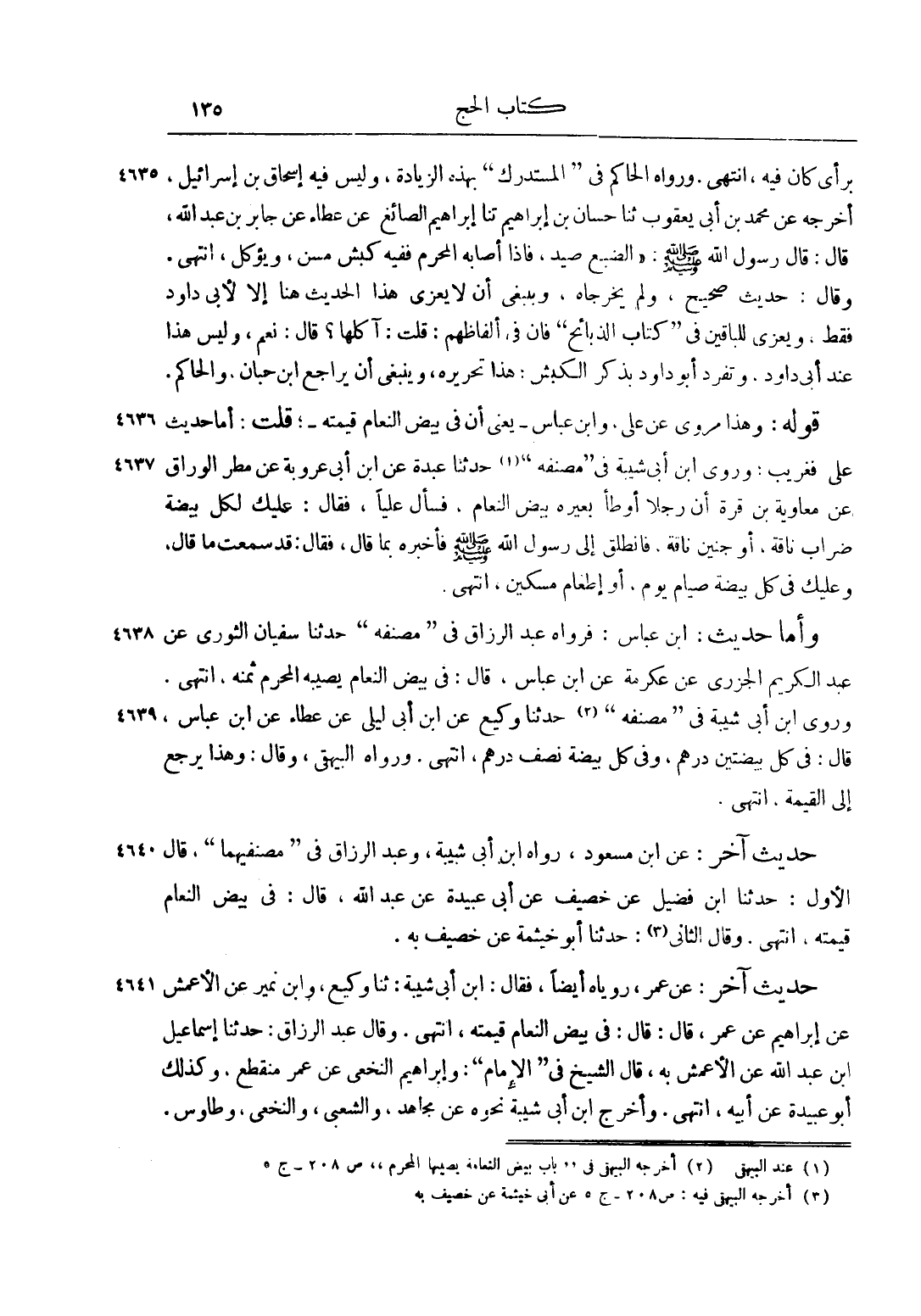 وَأَمَّا حَدِيثُ ابْنِ عَبَّاسٍ: فَرَوَاهُ عَبْدُ الرَّزَّاقِ فِي "مُصَنَّفِهِ" حَدَّثَنَا سُفْيَانُ الثَّوْرِيُّ عَنْ عَبْدِ الْكَرِيمِ الْجَزَرِيِّ عَنْ عِكْرِمَةَ عَنْ ابْنِ عَبَّاسٍ، قَالَ: فِي بَيْضِ النَّعَامِ يُصِيبُهُ الْمُحْرِمُ ثَمَنُهُ، انْتَهَى. وَرَوَى ابْنُ أَبِي شَيْبَةَ فِي "مُصَنَّفِهِ" 2 حَدَّثَنَا وَكِيعٌ عَنْ ابْنِ أَبِي لَيْلَى عَنْ عَطَاءٍ عَنْ ابْنِ عَبَّاسٍ، قَالَ: فِي كُلِّ بَيْضَتَيْنِ دِرْهَمٌ، وَفِي كُلِّ بَيْضَةٍ نِصْفُ دِرْهَمٍ، انْتَهَى. وَرَوَاهُ البيهقي، قال: وَهَذَا يَرْجِعُ إلَى الْقِيمَةِ، انْتَهَى.