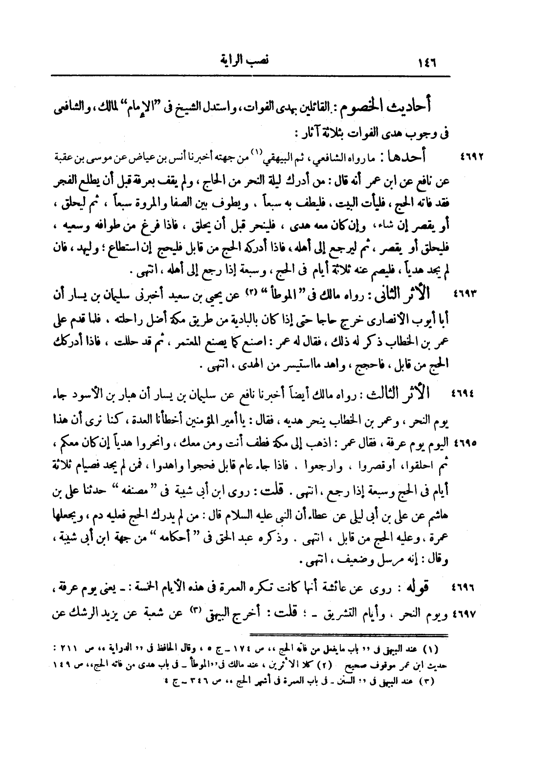 أَحَادِيثُ الْخُصُومِ: الْقَائِلِينَ بِهَدْيِ الْفَوَاتِ، وَاسْتَدَلَّ الشَّيْخُ فِي "الْإِمَامِ" لِمَالِكٍ، وَالشَّافِعِيِّ فِي وُجُوبِ هَدْيِ الْفَوَاتِ بِثَلَاثَةِ آثَارٍ: