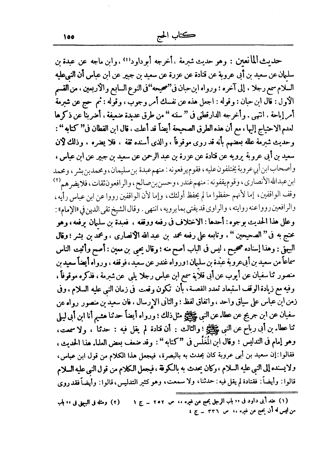 حَدِيثُ الْمَانِعِينَ: وَهُوَ حَدِيثُ شُبْرُمَةَ، أَخْرَجَهُ أَبُو دَاوُد1، وَابْنُ مَاجَهْ عَنْ عَبْدَةَ بْنِ سُلَيْمَانَ عَنْ سَعِيدِ بْنِ أَبِي عَرُوبَةَ عَنْ قَتَادَةَ عَنْ عَزْرَةَ عَنْ سَعِيدِ بْنِ جُبَيْرٍ عَنْ ابْنِ عَبَّاسٍ أَنَّ النَّبِيَّ عليه السلام سَمِعَ رَجُلًا، إلَى آخِرِهِ، وَرَوَاهُ ابْنُ حِبَّانَ فِي "صَحِيحِهِ" فِي النَّوْعِ السَّابِعِ وَالْأَرْبَعِينَ، مِنْ الْقِسْمِ الْأَوَّلِ: قَالَ ابْنُ حِبَّانَ: وَقَوْلُهُ: اجْعَلْ هَذِهِ عَنْ نَفْسِك أَمْرُ وُجُوبٍ، وَقَوْلُهُ: ثُمَّ حَجَّ عَنْ شُبْرُمَةَ أَمْرُ إبَاحَةٍ، انْتَهَى. وَأَخْرَجَهُ الدَّارَقُطْنِيُّ فِي "سُنَنِهِ" مِنْ طُرُقٍ عَدِيدَةٍ ضَعِيفَةٍ، أَضْرَبْنَا عَنْ ذِكْرِهَا لِعَدَمِ الِاحْتِيَاجِ إلَيْهَا، مَعَ أَنَّ هَذِهِ الطُّرُقَ الصَّحِيحَةَ أَيْضًا قَدْ أُعِلَّتْ، قَالَ ابْنُ الْقَطَّانِ فِي "كِتَابِهِ": وَحَدِيثُ شُبْرُمَةَ عَلَّلَهُ بَعْضُهُمْ بِأَنَّهُ قَدْ رُوِيَ مَوْقُوفًا، وَاَلَّذِي أَسْنَدَهُ ثِقَةٌ، فَلَا يَضُرُّهُ، وَذَلِكَ لِأَنَّ سَعِيدَ بْنَ أَبِي عَرُوبَةَ يَرْوِيهِ عَنْ قَتَادَةَ عَنْ عَزْرَةَ بْنِ عَبْدِ الرَّحْمَنِ عَنْ سَعِيدِ بْنِ جُبَيْرٍ عَنْ ابْنِ عَبَّاسٍ، وَأَصْحَابُ ابْنِ أَبِي عَرُوبَةَ يَخْتَلِفُونَ عَلَيْهِ، فَقَوْمٌ يَرْفَعُونَهُ: مِنْهُمْ عَبْدَةُ بْنُ سُلَيْمَانَ، وَمُحَمَّدُ بْنُ بِشْرٍ الْأَنْصَارِيُّ، وَقَوْمٌ يَقِفُونَهُ: مِنْهُمْ غُنْدَرٌ، وَحُسْنُ بْنُ صَالِحٍ، وَالرَّافِعُونَ ثِقَاتٌ، فَلَا يَضُرُّهُمْ 2 وَقْفُ الْوَاقِفِينَ، إمَّا لِأَنَّهُمْ حَفِظُوا مَا لَمْ يَحْفَظْ أُولَئِكَ، وَإِمَّا لِأَنَّ الْوَاقِفِينَ رَوَوْا عَنْ ابْنِ عَبَّاسٍ رَأْيَهُ، وَالرَّافِعِينَ رَوَوْا عَنْهُ رِوَايَتَهُ، وَالرَّاوِي قَدْ يُفْتِي بِمَا يَرْوِيهِ، انْتَهَى. وَقَالَ الشَّيْخُ تَقِيُّ الدِّينِ فِي "الْإِمَامِ": وَعَلَّلَ هَذَا الْحَدِيثَ بِوُجُوهٍ: أَحَدُهَا: الِاخْتِلَافُ فِي رَفْعِهِ وَوَقْفِهِ، فَعَبْدَةُ بْنُ سُلَيْمَانَ يَرْفَعُهُ، وَهُوَ مُحْتَجٌّ بِهِ فِي "الصَّحِيحَيْنِ"، وَتَابَعَهُ عَلَى رَفْعِهِ مُحَمَّدُ بْنُ عَبْدِ اللَّهِ الْأَنْصَارِيُّ، وَمُحَمَّدُ بْنُ بِشْرٍ، وَقَالَ الْبَيْهَقِيُّ: وَهَذَا إسْنَادُهُ صَحِيحٌ، لَيْسَ فِي الْبَابِ أَصَحُّ مِنْهُ، وَقَالَ يَحْيَى بْنُ مَعِينٍ: أَصَحُّ وَأَثْبَتُ النَّاسِ سَمَاعًا مِنْ سَعِيدِ بْنِ أَبِي عَرُوبَةَ عَبْدَةُ بْنُ سُلَيْمَانَ، وَرَوَاهُ غُنْدَرٌ عَنْ سَعِيدٍ، فَوَقَفَهُ، وَرَوَاهُ أَيْضًا سَعِيدُ بْنُ مَنْصُورٍ ثَنَا سُفْيَانُ عَنْ أَيُّوبَ عَنْ أَبِي قِلَابَةَ سَمِعَ ابْنُ عَبَّاسٍ رَجُلًا يُلَبِّي عَنْ شُبْرُمَةَ، فَذَكَرَهُ مَوْقُوفًا، وَفِيهِ مَعَ زِيَادَةِ الْوَقْفِ اسْتِبْعَادُ تَعَدُّدِ الْقَضِيَّةِ، بِأَنْ تَكُونَ وَقَعَتْ فِي زَمَانِ النَّبِيِّ عليه السلام، وَفِي زَمَنِ ابْنِ عَبَّاسٍ عَلَى سِيَاقٍ وَاحِدٍ، وَاتِّفَاقِ لَفْظٍ، وَالثَّانِي الْإِرْسَالُ، فَإِنَّ سَعِيدَ بن المنصور رَوَاهُ عَنْ سُفْيَانَ عَنْ ابْنِ جُرَيْجٍ عَنْ عَطَاءٍ عَنْ النَّبِيِّ صَلَّى اللَّهُ عَلَيْهِ وَسَلَّمَ مِثْلَ ذَلِكَ، وَرَوَاهُ أَيْضًا حَدَّثَنَا هُشَيْمِ أَنَا ابْنُ أَبِي لَيْلَى ثَنَا عَطَاءُ بْنُ أَبِي رَبَاحٍ عَنْ النَّبِيِّ صَلَّى اللَّهُ عَلَيْهِ وَسَلَّمَ، وَالثَّالِثُ: أَنَّ قَتَادَةَ لَمْ يَقُلْ فِيهِ: حَدَّثَنَا، وَلَا سَمِعْت، وَهُوَ إمَامٌ فِي التَّدْلِيسِ، وَقَالَ ابْنُ الْمُفْلِسِ فِي "كِتَابِهِ": وَقَدْ ضَعَّفَ بَعْضُ الْعُلَمَاءِ هَذَا الْحَدِيثَ، فَقَالَ: إنَّ سَعِيدَ بْنَ أَبِي عَرُوبَةَ كَانَ يُحَدِّثُ بِهِ بِالْبَصْرَةِ، فَيَجْعَلُ هَذَا الْكَلَامَ مِنْ قَوْلِ ابْنِ عَبَّاسٍ، وَل