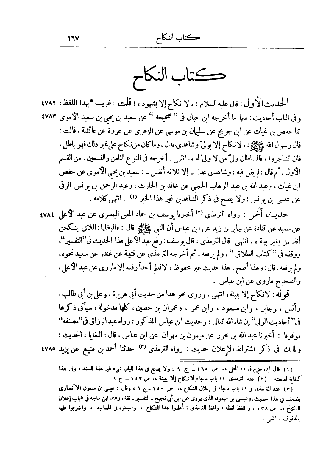 قَوْلُهُ: لَا نِكَاحَ إلَّا بِبَيِّنَةٍ، انْتَهَى. وَرُوِيَ نَحْوُ هَذَا مِنْ حَدِيثِ أَبِي هُرَيْرَةَ، وَعَلِيِّ بْنِ أَبِي طَالِبٍ، وَأَنَسٍ، وَجَابِرٍ، وَابْنِ مَسْعُودٍ، وَابْنِ عُمَرَ، وَعِمْرَانَ بْنِ حُصَيْنٍ، كُلُّهَا مَدْخُولَةٌ، سَيَأْتِي ذِكْرُهَا فِي "أَحَادِيثِ الْوَلِيِّ" إنْ شَاءَ اللَّهُ تَعَالَى، وَحَدِيثُ ابْنِ عَبَّاسٍ الْمَذْكُورُ: رَوَاهُ عَبْدُ الرَّزَّاقِ فِي "مُصَنَّفِهِ" مَوْقُوفًا: أَخْبَرَنَا عَبْدُ اللَّهِ بْنُ مُحْرِزٍ عَنْ مَيْمُونَ بْنِ مِهْرَانَ عَنْ ابْنِ عَبَّاسٍ، قَالَ: الْبَغَايَا، الْحَدِيثَ، وَلِمَالِكٍ فِي ذِكْرِ اشْتِرَاطِ الْإِعْلَانِ حَدِيثٌ: رَوَاهُ التِّرْمِذِيُّ 3 حَدَّثَنَا أَحْمَدُ بْنُ مَنِيعٍ عَنْ يَزِيدَ