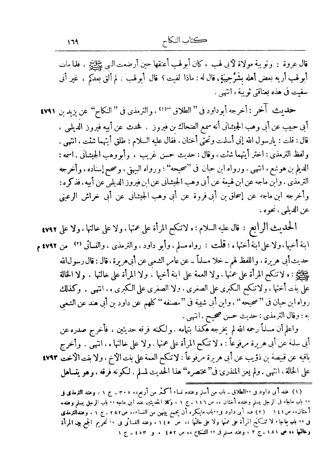 الْحَدِيثُ الرَّابِعُ: قَالَ عليه السلام: " لَا تُنْكَحُ الْمَرْأَةُ عَلَى عَمَّتِهَا، وَلَا عَلَى خَالَتِهَا، وَلَا عَلَى ابْنَةِ أَخِيهَا، وَلَا عَلَى ابْنَةِ أُخْتِهَا"، قُلْت: رَوَاهُ مُسْلِمٌ، وَأَبُو دَاوُد، وَالتِّرْمِذِيُّ، وَالنَّسَائِيُّ 2 مِنْ حَدِيثِ أَبِي هُرَيْرَةَ، وَاللَّفْظُ لَهُمْ - خَلَا مُسْلِمًا - عَنْ عَامِرٍ الشَّعْبِيِّ عَنْ أَبِي هُرَيْرَةَ، قَالَ: قَالَ رَسُولُ اللَّهِ صَلَّى اللَّهُ عَلَيْهِ وَسَلَّمَ: "لَا تُنْكَحُ الْمَرْأَةُ عَلَى عَمَّتِهَا، وَلَا الْعَمَّةُ عَلَى ابْنَةِ أَخِيهَا، وَلَا الْمَرْأَةُ عَلَى خَالَتِهَا، وَلَا الْخَالَةُ عَلَى بِنْتِ أُخْتِهَا، وَلَا تُنْكَحُ الْكُبْرَى عَلَى الصُّغْرَى، وَلَا الصُّغْرَى على الكبرى"، اتنهى. وَكَذَلِكَ رَوَاهُ ابْنُ حِبَّانَ فِي "صَحِيحِهِ"، وَابْنُ أَبِي شَيْبَةَ فِي "مُصَنَّفِهِ" كُلُّهُمْ عَنْ دَاوُد بْنِ أَبِي هِنْدٍ عَنْ الشَّعْبِيِّ بِهِ، وَقَالَ التِّرْمِذِيُّ: حَدِيثٌ حَسَنٌ صَحِيحٌ، انْتَهَى.