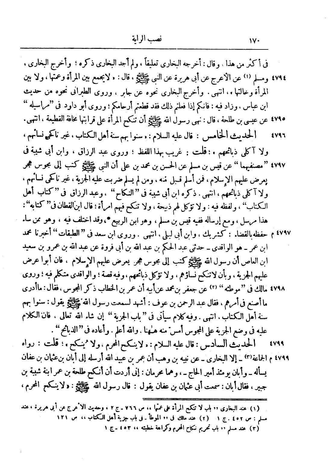 الْحَدِيثُ الْخَامِسُ: قَالَ عليه السلام: "سُنُّوا بِهِمْ سُنَّةَ أَهْلِ الْكِتَابِ، غَيْرَ نَاكِحِي نِسَائِهِمْ، وَلَا آكِلِي ذَبَائِحِهِمْ". قُلْت: غَرِيبٌ بِهَذَا اللَّفْظِ، وَرَوَى عَبْدُ الرَّزَّاقِ، وَابْنُ أَبِي شَيْبَةَ فِي "مُصَنَّفَيْهِمَا" عَنْ قَيْسِ بْنِ مُسْلِمٍ عَنْ الْحَسَنِ بْنِ مُحَمَّدِ بْنِ عَلِيٍّ أَنَّ النَّبِيَّ صَلَّى اللَّهُ عَلَيْهِ وَسَلَّمَ كَتَبَ إلَى مَجُوسِ هَجَرَ يَعْرِضُ عَلَيْهِمْ الْإِسْلَامَ، فَمَنْ أَسْلَمَ قُبِلَ مِنْهُ، وَمَنْ لَمْ يُسْلِمْ ضُرِبَتْ عَلَيْهِ الْجِزْيَةُ، غَيْرَ نَاكِحِي نِسَائِهِمْ، وَلَا آكِلِي ذَبَائِحِهِمْ، انْتَهَى. ذَكَرَهُ ابْنُ أَبِي شَيْبَةَ فِي "النِّكَاحِ"، وَعَبْدُ الرَّزَّاقِ فِي "كِتَابِ أَهْلِ الْكِتَابِ"، وَلَفْظُهُ فِيهِ: وَلَا تُؤْكَلُ لَهُمْ ذَبِيحَةٌ، وَلَا تُنْكَحُ فِيهِمْ امْرَأَةٌ، قَالَ ابْنُ الْقَطَّانِ فِي "كِتَابِهِ": هَذَا مُرْسَلٌ، وَمَعَ إرْسَالِهِ فَفِيهِ قَيْسُ بْنُ مُسْلِمٍ، وَهُوَ ابْنُ الرَّبِيعِ، وَقَدْ اُخْتُلِفَ فِيهِ، وَهُوَ مِمَّنْ سَاءَ حِفْظُهُ بِالْقَضَاءِ: كَشَرِيكٍ، وَابْنِ أَبِي لَيْلَى، انْتَهَى. وَرَوَى ابْنُ سَعْدٍ فِي "الطَّبَقَاتِ" أَخْبَرَنَا مُحَمَّدُ بْنُ عُمَرَ - هُوَ الْوَاقِدِيُّ - حَدَّثَنِي عَبْدُ الْحَكَمِ بْنُ عَبْدِ اللَّهِ بْنِ أَبِي فَرْوَةَ عَنْ عَبْدِ اللَّهِ بْنِ عَمْرِو بْنِ سَعِيدِ بْنِ الْعَاصِ أَنَّ رَسُولَ اللَّهِ صَلَّى اللَّهُ عَلَيْهِ وَسَلَّمَ كَتَبَ إلَى مَجُوسِ هَجَرَ يَعْرِضُ عَلَيْهِمْ الْإِسْلَامَ، فَإِنْ أَبَوْا عَرَضَ عَلَيْهِمْ الْجِزْيَةَ، وَبِأَنْ لَا تُنْكَحَ نِسَاؤُهُمْ، وَلَا تُؤْكَلَ ذَبَائِحُهُمْ، وَفِيهِ قِصَّةٌ، وَالْوَاقِدِيُّ مُتَكَلِّمٌ فِيهِ، وَرَوَى مَالِكٌ فِي "مُوَطَّئِهِ" 2 عَنْ جَعْفَرِ بْنِ مُحَمَّدٍ عَنْ أَبِيهِ أَنَّ عُمَرَ بْنَ الْخَطَّابِ ذَكَرَ الْمَجُوسَ، فَقَالَ: مَا أَدْرِي مَا أَصْنَعُ فِي أَمْرِهِمْ، فَقَالَ عَبْدُ الرَّحْمَنِ بْنُ عَوْفٍ: أَشْهَدُ لَسَمِعْت رَسُولَ اللَّهِ صَلَّى اللَّهُ عَلَيْهِ وَسَلَّمَ يَقُولُ: "سُنُّوا بِهِمْ سُنَّةَ أَهْلِ الْكِتَابِ"، انْتَهَى. وَفِيهِ كَلَامٌ سَيَأْتِي فِي "بَابِ الْجِزْيَةِ" إنْ شَاءَ اللَّهُ تَعَالَى، فَإِنَّ الْكَلَامَ عَلَيْهِ فِي وَضْعِ الْجِزْيَةِ عَلَى المجوس أمسّ منه ههنا، وَاَللَّهُ أَعْلَمُ. وَأَعَادَهُ فِي "الذَّبَائِحِ".