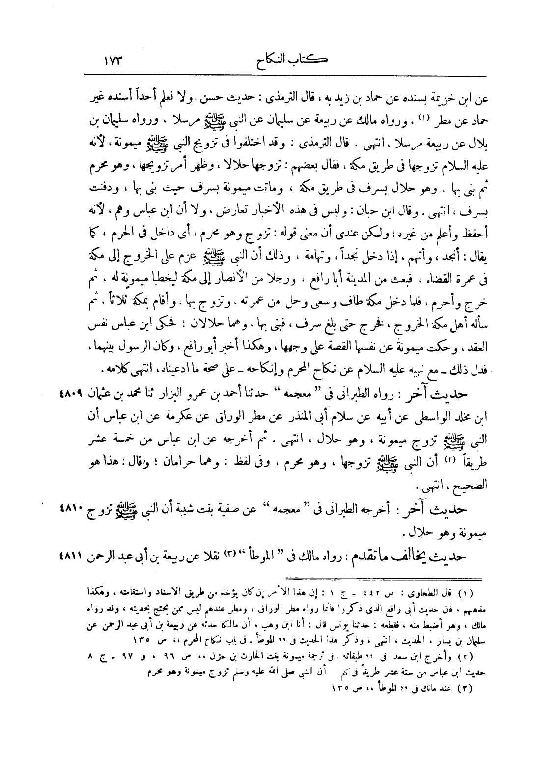 2 وأخرج ابن سعد في "طبقاته من ترجمة ميمونة بنت الحارث بن حزن" ص 96، و97 - ج 2 حديث ابن عباس من ستة عشر طريقاً في كتاب أن النبي صَلَّى اللَّهُ عَلَيْهِ وَسَلَّمَ تزوج ميمونة وهو محرم.