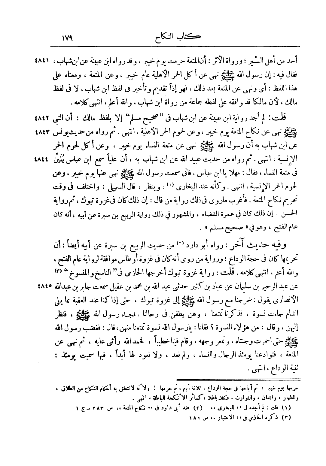 قُلْت: لَمْ أَجِدْ رِوَايَةَ ابْنِ عُيَيْنَةَ عَنْ ابْنِ شِهَابٍ فِي "صَحِيحِ مُسْلِمٍ" إلَّا بِلَفْظِ مَالِكٍ: أَنَّ النَّبِيَّ صَلَّى اللَّهُ عَلَيْهِ وَسَلَّمَ نَهَى عَنْ نِكَاحِ الْمُتْعَةِ يَوْمَ خَيْبَرَ، وَعَنْ لُحُومِ الْحُمُرِ الْأَهْلِيَّةِ، انْتَهَى. ثُمَّ رَوَاهُ مِنْ حَدِيثِ يُونُسَ عَنْ ابْنِ شِهَابٍ بِهِ أَنَّ رَسُولَ اللَّهِ صَلَّى اللَّهُ عَلَيْهِ وَسَلَّمَ نَهَى عَنْ مُتْعَةِ النِّسَاءِ يَوْمَ خَيْبَرَ، وَعَنْ أَكْلِ لُحُومِ الْحُمُرِ الْإِنْسِيَّةِ، انْتَهَى. ثُمَّ رَوَاهُ مِنْ حَدِيثِ عُبَيْدِ اللَّهِ عَنْ ابْنِ شِهَابٍ بِهِ، أَنَّ عَلِيًّا سَمِعَ ابْنَ عَبَّاسٍ يَلِينُ فِي مُتْعَةِ النِّسَاءِ، فَقَالَ: مَهْلًا يَا ابْنَ عَبَّاسٍ، فَإِنِّي سَمِعْت رَسُولَ اللَّهِ صَلَّى اللَّهُ عَلَيْهِ وَسَلَّمَ نَهَى عَنْهَا يَوْمَ خَيْبَرَ، وَعَنْ لُحُومِ الْحُمُرِ الْإِنْسِيَّةِ، انْتَهَى. وَكَأَنَّهُ عِنْدَ الْبُخَارِيِّ1، وَيُنْظَرُ، قَالَ السُّهَيْلِيُّ: وَاخْتُلِفَ فِي وَقْتِ تَحْرِيمِ نِكَاحِ الْمُتْعَةِ، فَأَغْرَبُ مَا رُوِيَ فِي ذَلِكَ رِوَايَةُ مَنْ قَالَ: إنَّ ذَلِكَ كَانَ فِي غَزْوَةِ تَبُوكَ، ثُمَّ رِوَايَةُ الْحَسَنِ: إنَّ ذَلِكَ فِي عُمْرَةِ الْقَضَاءِ، وَالْمَشْهُورُ فِي ذَلِكَ رِوَايَةُ الرَّبِيعِ بْنِ سَبْرَةَ عَنْ أَبِيهِ، أَنَّهُ كَانَ عَامَ الْفَتْحِ، وَهُوَ فِي "صَحِيحِ مُسْلِمٍ".