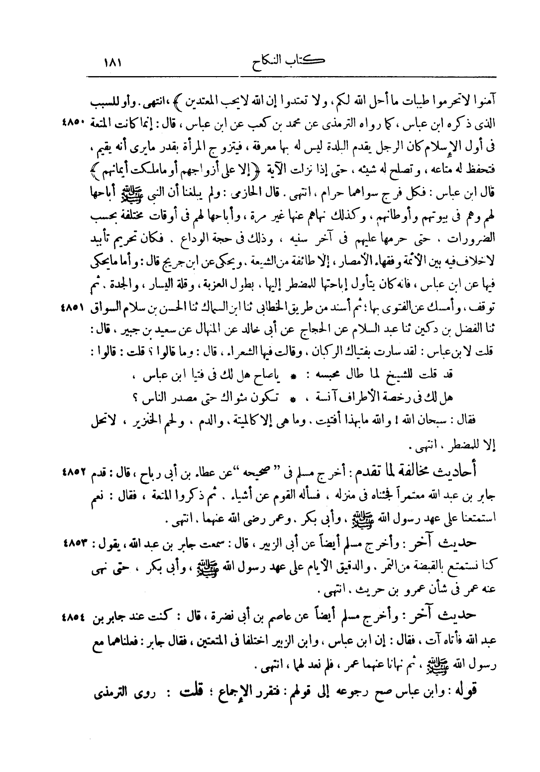آمَنُوا لَا تُحَرِّمُوا طَيِّبَاتِ مَا أَحَلَّ اللَّهُ لَكُمْ وَلَا تَعْتَدُوا إنَّ اللَّهَ لَا يُحِبُّ الْمُعْتَدِينَ} ، انْتَهَى. أَوْ لِلسَّبَبِ الَّذِي ذَكَرَهُ ابْنُ عَبَّاسٍ، كَمَا رَوَاهُ التِّرْمِذِيُّ عَنْ مُحَمَّدِ بْنِ كَعْبٍ عَنْ ابْنِ عَبَّاسٍ، قَالَ: إنَّمَا كَانَتْ الْمُتْعَةُ فِي أَوَّلِ الْإِسْلَامِ كَانَ الرَّجُلُ يَقْدَمُ الْبَلْدَةَ لَيْسَ لَهُ بِهَا مَعْرِفَةٌ، فَيَتَزَوَّجُ الْمَرْأَةَ بِقَدْرِ مَا يَرَى أَنَّهُ يُقِيمُ، فَتَحْفَظُ لَهُ مَتَاعَهُ، وَتُصْلِحُ لَهُ شَيْئَهُ، حَتَّى إذَا نَزَلَتْ الْآيَةُ {إلَّا عَلَى أَزْوَاجِهِمْ أَوْ مَا مَلَكَتْ أَيْمَانُهُمْ} قَالَ ابْنُ عَبَّاسٍ: فَكُلُّ فَرْجٍ سِوَاهُمَا حَرَامٌ، انْتَهَى. قَالَ الْحَازِمِيُّ: وَلَمْ يَبْلُغْنَا أَنَّ النَّبِيَّ صَلَّى اللَّهُ عَلَيْهِ وَسَلَّمَ أَبَاحَهَا لَهُمْ وَهُمْ فِي بُيُوتِهِمْ وَأَوْطَانِهِمْ، وَكَذَلِكَ نَهَاهُمْ عَنْهَا غَيْرَ مَرَّةٍ، وَأَبَاحَهَا لَهُمْ فِي أَوْقَاتٍ مُخْتَلِفَةٍ بِحَسَبِ الضَّرُورَاتِ، حَتَّى حَرَّمَهَا عَلَيْهِمْ فِي آخِرِ سِنِيهِ، وَذَلِكَ فِي حَجَّةِ الْوَدَاعِ، فَكَانَ تَحْرِيمَ تَأْبِيدٍ لَا خِلَافَ فِيهِ بَيْنَ الْأَئِمَّةِ وَفُقَهَاءِ الْأَمْصَارِ، إلَّا طَائِفَةً مِنْ الشِّيعَةِ، وَيُحْكَى عَنْ ابْنِ جُرَيْجٍ قَالَ: وَأَمَّا مَا يُحْكَى فِيهَا عَنْ ابْنِ عَبَّاسٍ، فَإِنَّهُ كَانَ يَتَأَوَّلُ إبَاحَتَهَا لِلْمُضْطَرِّ إلَيْهَا، بِطُولِ الْغُرْبَةِ، وَقِلَّةِ الْيَسَارِ، وَالْجُدَّةِ، ثُمَّ تَوَقَّفَ، وَأَمْسَكَ عَنْ الْفَتْوَى بِهَا، ثُمَّ أَسْنَدَ مِنْ طَرِيقِ الْخَطَّابِيِّ ثَنَا ابْنُ السَّمَّاكِ ثَنَا الْحَسَنُ بْنُ سَلَّامٍ السَّوَّاقُ ثَنَا الْفَضْلُ بْنُ دُكَيْنٍ ثَنَا عَبْدُ السَّلَامِ عَنْ الْحَجَّاجِ عَنْ أَبِي خَالِدٍ عَنْ الْمِنْهَالِ عَنْ سَعِيدِ بْنِ جُبَيْرٍ، قَالَ: قُلْت لِابْنِ عَبَّاسٍ: لَقَدْ سَارَتْ بِفُتْيَاك الرُّكْبَانُ، وَقَالَتْ فِيهَا الشُّعَرَاءُ، قَالَ: وَمَا قَالُوا؟ قُلْت: قَالُوا: