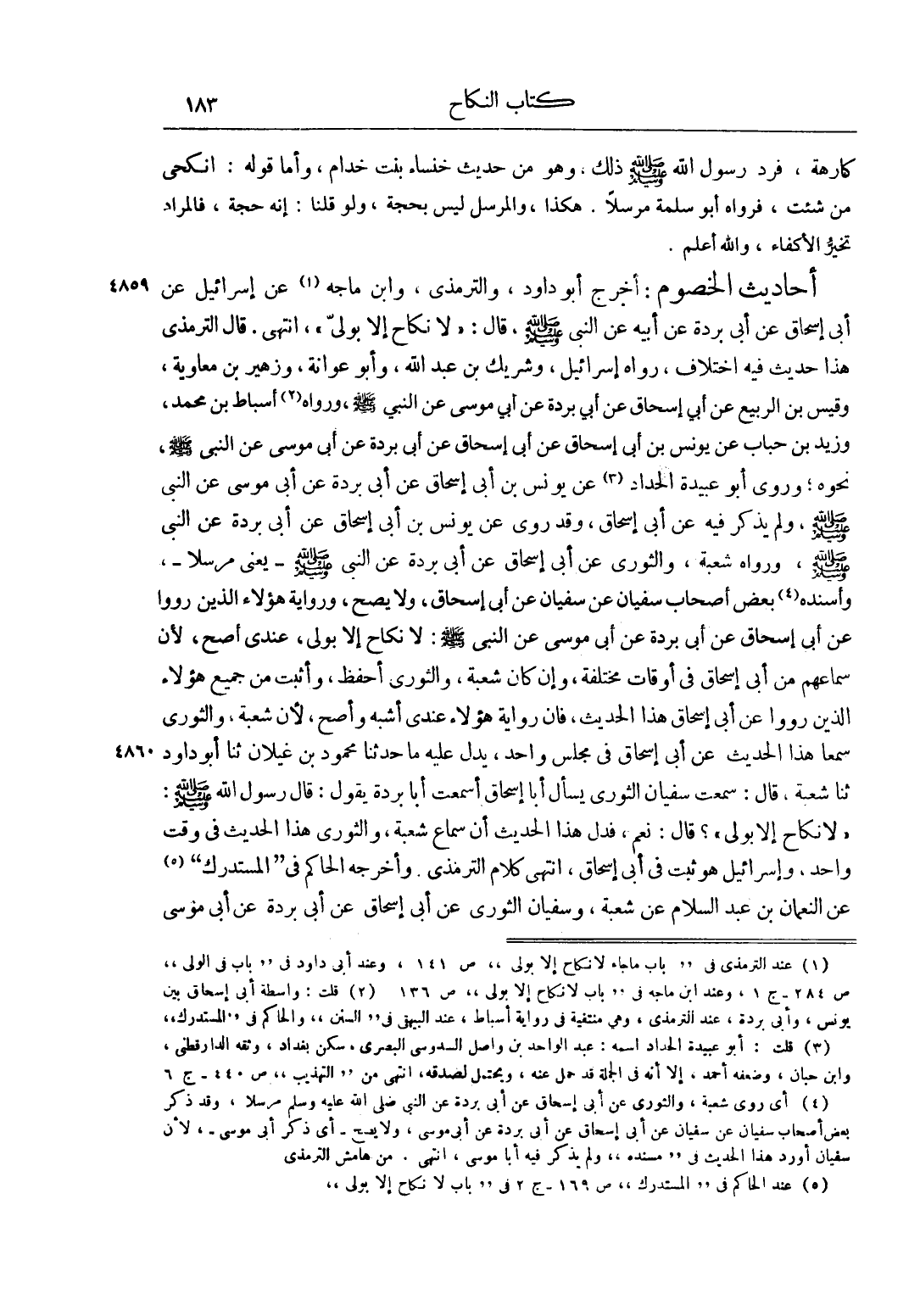 أَحَادِيثُ الْخُصُومِ: أَخْرَجَ أَبُو دَاوُد، وَالتِّرْمِذِيُّ وَابْنُ مَاجَهْ1 عَنْ إسْرَائِيلَ عَنْ أَبِي إسْحَاقَ عَنْ أَبِي بُرْدَةَ عَنْ أَبِيهِ عَنْ النَّبِيِّ صَلَّى اللَّهُ عَلَيْهِ وَسَلَّمَ، قَالَ: "لَا نِكَاحَ إلَّا بِوَلِيٍّ"، انْتَهَى. قَالَ التِّرْمِذِيُّ هَذَا حَدِيثٌ فِيهِ اخْتِلَافٌ، رَوَاهُ إسْرَائِيلُ، وَشَرِيكُ بْنُ عَبْدِ اللَّهِ، وَأَبُو عَوَانَةَ، وَزُهَيْرُ بْنُ مُعَاوِيَةَ، وَقَيْسُ بْنُ الرَّبِيعِ عَنْ أَبِي إسْحَاقَ عَنْ أَبِي بُرْدَةَ عَنْ أَبِي مُوسَى عَنْ النَّبِيِّ صَلَّى اللَّهُ عَلَيْهِ وَسَلَّمَ، وَرَوَاهُ 2 أَسْبَاطُ بْنُ مُحَمَّدٍ، وَزَيْدُ حُبَابٍ عَنْ يُونُسَ بْنِ أَبِي إسْحَاقَ عَنْ أَبِي إسْحَاقَ عَنْ أَبِي بُرْدَةَ عَنْ أَبِي مُوسَى عَنْ النَّبِيِّ صَلَّى اللَّهُ عَلَيْهِ وَسَلَّمَ، نَحْوَهُ، وَرَوَى أَبُو عُبَيْدَةَ الْحَدَّادُ 3 عَنْ يُونُسَ بْنِ أَبِي إسْحَاقَ عَنْ أَبِي بُرْدَةَ عَنْ أَبِي مُوسَى عَنْ النَّبِيِّ صَلَّى اللَّهُ عَلَيْهِ وَسَلَّمَ، وَلَمْ يَذْكُرْ فِيهِ عَنْ أَبِي إسْحَاقَ، وَقَدْ رُوِيَ عَنْ يُونُسَ بْنِ أَبِي إسْحَاقَ عَنْ أَبِي بُرْدَةَ عَنْ النَّبِيِّ صَلَّى اللَّهُ عَلَيْهِ وَسَلَّمَ، وَرَوَى شُعْبَةُ، وَالثَّوْرِيُّ عَنْ أَبِي إسْحَاقَ عَنْ أَبِي بُرْدَةَ عَنْ النَّبِيِّ صَلَّى اللَّهُ عَلَيْهِ وَسَلَّمَ - يَعْنِي مُرْسَلًا - وَأَسْنَدَهُ 4 بَعْضُ أَصْحَابِ سُفْيَانَ عَنْ أَبِي إسْحَاقَ، وَلَا يَصِحُّ، وَرِوَايَةُ هَؤُلَاءِ الَّذِينَ رَوَوْا عَنْ أَبِي إسْحَاقَ عَنْ أَبِي بُرْدَةَ عَنْ أَبِي مُوسَى عَنْ النَّبِيِّ صَلَّى اللَّهُ عَلَيْهِ وَسَلَّمَ: "لَا نِكَاحَ إلَّا بِوَلِيٍّ"، عِنْدِي أَصَحُّ، لِأَنَّ سَمَاعَهُمْ مِنْ أَبِي إسْحَاقَ فِي أَوْقَاتٍ مُخْتَلِفَةٍ، وَإِنْ كَانَ شُعْبَةُ، وَالثَّوْرِيُّ أَحْفَظَ، وَأَثْبَتَ مِنْ جَمِيعِ هَؤُلَاءِ الَّذِينَ رَوَوْا عَنْ أَبِي إسْحَاقَ هَذَا الْحَدِيثَ، فَإِنَّ رِوَايَةَ هَؤُلَاءِ عِنْدِي أَشْبَهُ وَأَصَحُّ، لِأَنَّ شُعْبَةَ، وَالثَّوْرِيَّ سَمِعَا هَذَا الْحَدِيثَ عَنْ أَبِي إسْحَاقَ فِي مَجْلِسٍ وَاحِدٍ، يَدُلُّ عَلَيْهِ مَا حَدَّثَنَا مَحْمُودُ بْنُ غَيْلَانَ ثَنَا أَبُو دَاوُد ثَنَا شُعْبَةُ، قَالَ: سَمِعْت سُفْيَانَ الثَّوْرِيَّ يَسْأَلُ أَبَا إسْحَاقَ أَسَمِعْت أَبَا بُرْدَةَ يَقُولُ: قَالَ رَسُولُ اللَّهِ صَلَّى اللَّهُ عَلَيْهِ وَسَلَّمَ: "لَا نِكَاحَ إلَّا بِوَلِيٍّ"؟ قَالَ: نَعَمْ، فَدَلَّ هَذَا الْحَدِيثُ أَنَّ سَمَاعَ شُعْبَةَ، وَالثَّوْرِيِّ هَذَا الْحَدِيثَ فِي وَقْتٍ وَاحِدٍ، وَإِسْرَائِيلُ هُوَ ثَبْتٌ فِي أَبِي إسْحَاقَ، انْتَهَى كَلَامُ التِّرْمِذِيِّ. وَأَخْرَجَهُ الْحَاكِمُ فِي "الْمُسْتَدْرَكِ" 5 عَنْ النُّعْمَانِ بْنِ عَبْدِ السَّلَامِ عَنْ شُعْبَةَ، وَسُفْيَانُ الثَّوْرِيُّ عَنْ أَبِي إسْحَاقَ عَنْ أَبِي بُرْدَةَ عَنْ أَبِي مُوسَى