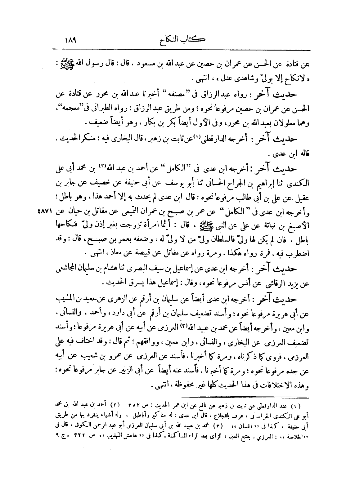 عَنْ قَتَادَةَ عَنْ الْحَسَنِ عَنْ عِمْرَانَ بْنِ حُصَيْنٍ عَنْ عَبْدِ اللَّهِ بْنِ مَسْعُودٍ، قَالَ: قَالَ رَسُولُ اللَّهِ صَلَّى اللَّهُ عَلَيْهِ وَسَلَّمَ: "لَا نِكَاحَ إلَّا بِوَلِيٍّ وَشَاهِدَيْ عَدْلٍ"، انْتَهَى.