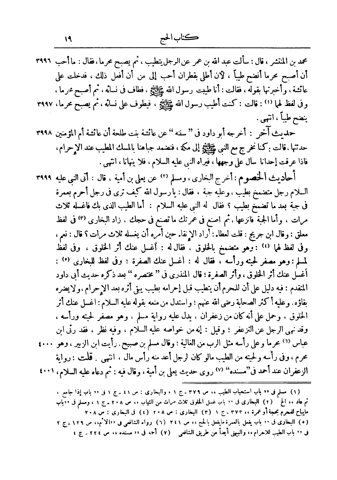 أَحَادِيثُ الْخُصُومِ: أَخْرَجَ الْبُخَارِيُّ، وَمُسْلِمٌ 2 عَنْ يَعْلَى بْنِ أُمَيَّةَ، قَالَ: أَتَى النَّبِيَّ عليه السلام رَجُلٌ مُتَضَمِّخٌ بِطِيبٍ، وَعَلَيْهِ جُبَّةٌ، فَقَالَ: يَا رَسُولَ اللَّهِ كَيْفَ تَرَى فِي رَجُلٍ أَحْرَمَ بِعُمْرَةٍ فِي جُبَّةٍ بَعْدَ مَا تَضَمَّخَ بِطِيبٍ؟ فَقَالَ لَهُ النَّبِيُّ عليه السلام: "أَمَّا الطِّيبُ الَّذِي بِك فَاغْسِلْهُ ثَلَاثَ مَرَّاتٍ، وَأَمَّا الْجُبَّةُ فَانْزِعْهَا، ثُمَّ اصْنَعْ فِي عُمْرَتِك مَا تَصْنَعُ فِي حَجِّك"، زَادَ الْبُخَارِيُّ 3 فِي لَفْظٍ مُعَلَّقٍ: وَقَالَ ابْنُ جُرَيْجٍ: قُلْت لِعَطَاءٍ: أَرَادَ الْإِنْقَاءَ حِينَ أَمَرَهُ أَنْ يَغْسِلَهُ ثَلَاثَ مَرَّاتٍ؟ قَالَ: نَعَمْ، وَفِي لَفْظٍ لَهُمَا 4 وَهُوَ مُتَضَمِّخٌ بِالْخَلُوقِ، فَقَالَ لَهُ: اغْسِلْ عَنْك أَثَرَ الْخَلُوقِ، وَفِي لَفْظٍ لِمُسْلِمٍ: وَهُوَ مُصَفِّرٌ لِحْيَتَهُ وَرَأْسَهُ، فَقَالَ لَهُ: اغْسِلْ عَنْك الصُّفْرَةَ، وَفِي لَفْظٍ لِلْبُخَارِيِّ5: اغْسِلْ عَنْك أَثَرَ الْخَلُوقِ، وَأَثَرَ الصُّفْرَةِ، قَالَ الْمُنْذِرِيُّ فِي "مُخْتَصَرِهِ" بَعْدَ ذِكْرِهِ حَدِيثَ أَبِي دَاوُد الْمُتَقَدِّمَ: فِيهِ دَلِيلٌ عَلَى أَنَّ لِلْمُحْرِمِ أَنْ يَتَطَيَّبَ قَبْلَ إحْرَامِهِ بِطِيبٍ يَبْقَى أَثَرُهُ بَعْدَ الْإِحْرَامِ، وَلَا يَضُرُّهُ بَقَاؤُهُ، وَعَلَيْهِ أَكْثَرُ الصَّحَابَةِ رضي الله عنهم، وَاسْتَدَلَّ مَنْ مَنَعَهُ بِقَوْلِهِ عليه السلام: "اغْسِلْ عَنْك أَثَرَ الْخَلُوقِ"، وَحُمِلَ عَلَى أَنَّهُ كَانَ مِنْ زَعْفَرَانٍ، يَدُلُّ عَلَيْهِ رِوَايَةُ مُسْلِمٍ، وَهُوَ مُصَفِّرٌ لِحْيَتَهُ وَرَأْسَهُ، وَقَدْ نَهَى الرَّجُلَ عَنْ التَّزَعْفُرِ، وَقِيلَ: إنَّهُ مِنْ خَوَاصِّهِ عليه السلام، وَفِيهِ نَظَرٌ، فَقَدْ رُئِيَ ابْنُ عَبَّاسٍ 6 مُحْرِمًا وَعَلَى رَأْسِهِ مِثْلُ الرُّبِّ مِنْ الْغَالِيَةِ، وَقَالَ مُسْلِمُ بْنُ صُبَيْحٍ: رَأَيْت ابْنَ الزُّبَيْرِ، وَهُوَ مُحْرِمٌ، وَفِي رَأْسِهِ وَلِحْيَتِهِ مِنْ الطِّيبِ مَا لَوْ كَانَ لِرَجُلٍ أَعَدَّ مِنْهُ رَأْسَ مَالٍ، انْتَهَى. قُلْت: رِوَايَةُ الزَّعْفَرَانِ عِنْدَ أَحْمَدَ فِي "مُسْنَدِهِ" 7 رَوَى حَدِيثَ يَعْلَى بْنِ أُمَيَّةَ، وَقَالَ فِيهِ: ثُمَّ دَعَاهُ عليه السلام،