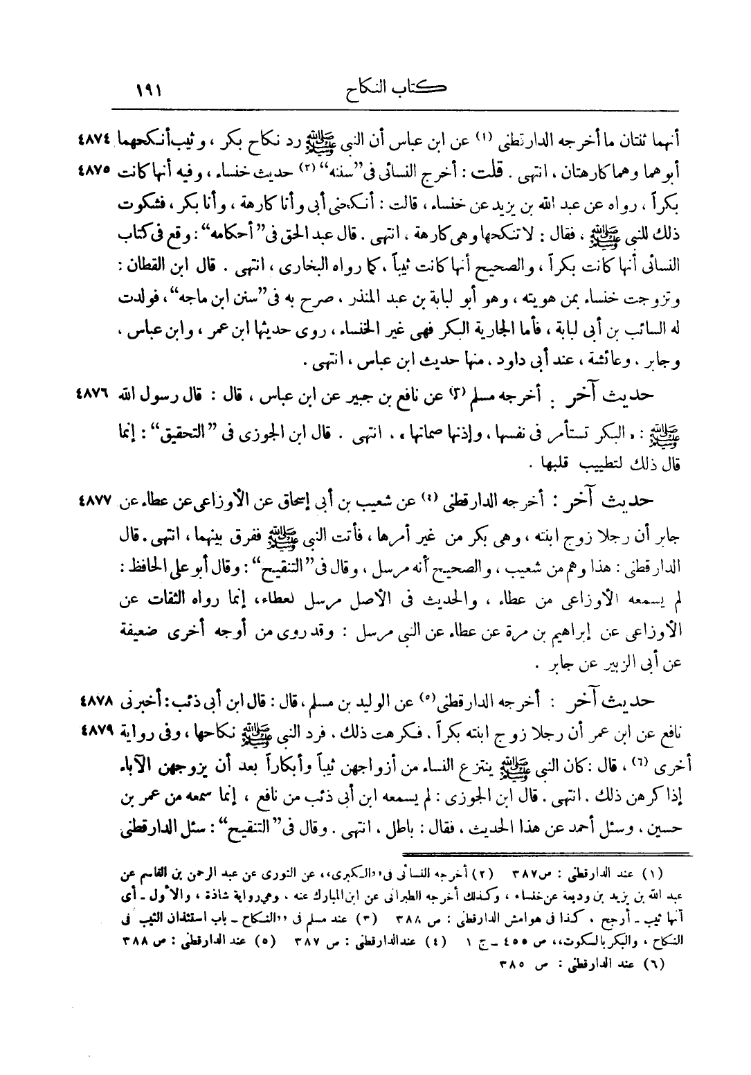 حَدِيثٌ آخَرُ: أَخْرَجَهُ الدَّارَقُطْنِيُّ 5 عَنْ الْوَلِيدِ بْنِ مُسْلِمٍ، قَالَ: قَالَ ابْنُ أَبِي ذِئْبٍ: أَخْبَرَنِي نَافِعٌ عَنْ ابْنِ عُمَرَ أَنَّ رَجُلًا زَوَّجَ ابْنَتَهُ بِكْرًا، فَكَرِهَتْ ذَلِكَ، فَرَدَّ النَّبِيُّ صَلَّى اللَّهُ عَلَيْهِ وَسَلَّمَ نِكَاحَهَا، وَفِي رِوَايَةٍ أُخْرَى6، قَالَ: كَانَ النَّبِيُّ صَلَّى اللَّهُ عَلَيْهِ وَسَلَّمَ يَنْتَزِعُ النِّسَاءَ مِنْ أَزْوَاجِهِنَّ ثَيِّبًا وَأَبْكَارًا بَعْدَ أَنْ يُزَوِّجَهُنَّ الْآبَاءُ إذَا كَرِهْنَ ذَلِكَ، انْتَهَى. قَالَ ابْنُ الْجَوْزِيِّ: لَمْ يَسْمَعْهُ ابْنُ أَبِي ذِئْبٍ مِنْ نَافِعٍ، إنَّمَا سَمِعَهُ مِنْ عُمَرَ بْنِ حُسَيْنٍ، وَسُئِلَ أَحْمَدُ عَنْ هَذَا الْحَدِيثِ، فَقَالَ: بَاطِلٌ، انْتَهَى. وَقَالَ فِي "التَّنْقِيحِ": سُئِلَ الدَّارَقُطْنِيُّ