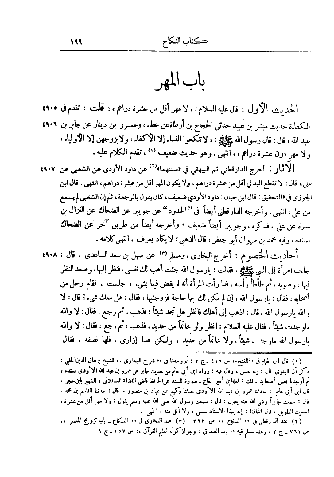 حديث الخصوم: أخرج الْبُخَارِيُّ، وَمُسْلِمٌ 3 عَنْ سَهْلِ بْنِ سَعْدٍ السَّاعِدِيِّ، قَالَ: جَاءَتْ امْرَأَةٌ إلَى النَّبِيِّ صَلَّى اللَّهُ عَلَيْهِ وَسَلَّمَ، فَقَالَتْ: يَا رَسُولَ اللَّهِ جِئْت أَهَبُ لَك نَفْسِي، فَنَظَرَ إلَيْهَا، وَصَعَّدَ النَّظَرَ فِيهَا، وَصَوَّبَهُ، ثُمَّ طَأْطَأَ رَأْسَهُ، فَلَمَّا رَأَتْ الْمَرْأَةُ أَنَّهُ لَمْ يَقْضِ فِيهَا بِشَيْءٍ، جَلَسَتْ، فَقَامَ رَجُلٌ مِنْ أَصْحَابِهِ، فَقَالَ: يَا رَسُولَ اللَّهِ، إنْ لَمْ يَكُنْ لَك بِهَا حَاجَةٌ فَزَوِّجْنِيهَا، فَقَالَ: "هَلْ مَعَك شَيْءٌ؟ " قَالَ: لَا وَاَللَّهِ يَا رَسُولَ اللَّهِ، قَالَ: " اذْهَبْ إلَى أَهْلِك فَانْظُرْ هَلْ تَجِدُ شَيْئًا"، فَذَهَبَ، ثُمَّ رَجَعَ، فَقَالَ: لَا وَاَللَّهِ مَا وَجَدْت شَيْئًا، فَقَالَ عليه السلام: "اُنْظُرْ وَلَوْ خَاتَمًا مِنْ حَدِيدٍ"، فَذَهَبَ، ثُمَّ رَجَعَ، فَقَالَ: لَا وَاَللَّهِ يَا رَسُولَ اللَّهِ مَا وَجَدْت شَيْئًا، وَلَا خَاتَمًا مِنْ حَدِيدٍ، وَلَكِنْ هَذَا إزَارِي، فَلَهَا نِصْفُهُ، فَقَالَ