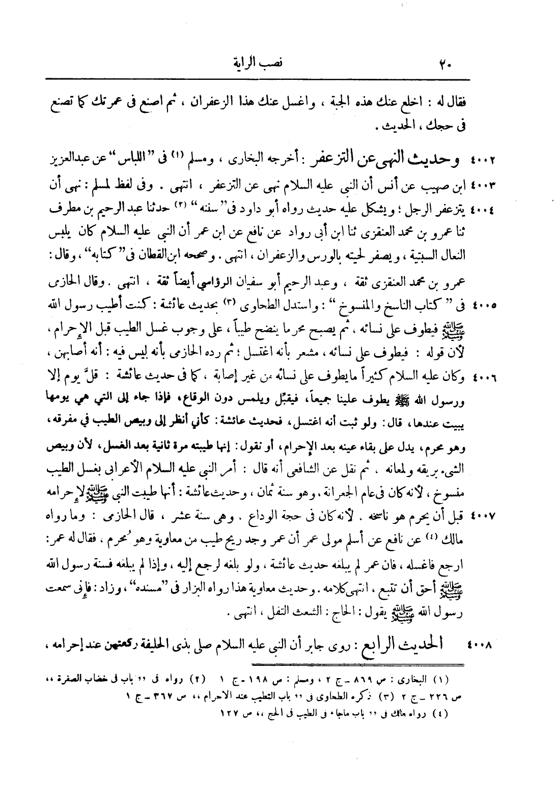 حَدِيثُ النَّهْيِ عَنْ التَّزَعْفُرِ: أَخْرَجَهُ الْبُخَارِيُّ، وَمُسْلِمٌ 1 فِي "اللِّبَاسِ" عَنْ عَبْدِ الْعَزِيزِ بْنِ صُهَيْبٍ عَنْ أَنَسٍ أن النبي عليه السلام نَهَى عَنْ التَّزَعْفُرِ، انْتَهَى. وَفِي لَفْظٍ لِمُسْلِمٍ: نَهَى أَنْ يَتَزَعْفَرَ الرَّجُلُ، وَيُشْكِلُ عَلَيْهِ حَدِيثٌ رَوَاهُ أَبُو دَاوُد فِي "سُنَنِهِ" 2 حَدَّثَنَا عَبْدُ الرَّحِيمِ بْنُ مُطَرِّفٍ ثَنَا عَمْرُو بْنُ مُحَمَّدٍ الْعَنْقَزِيُّ ثَنَا ابْنُ أَبِي رَوَّادٍ عَنْ نَافِعٍ عَنْ ابْنِ عُمَرَ أَنَّ النَّبِيَّ عليه السلام كَانَ يَلْبَسُ النِّعَالَ السِّبْتِيَّةَ، وَيُصَفِّرُ لِحْيَتَهُ بِالْوَرْسِ وَالزَّعْفَرَانِ، انْتَهَى. وَصَحَّحَهُ ابْنُ الْقَطَّانِ فِي "كِتَابِهِ"، وَقَالَ: عَمْرُو بْنُ مُحَمَّدٍ الْعَنْقَزِيُّ ثِقَةٌ، وَعَبْدُ الرَّحِيمِ أَبُو سُفْيَانَ الرُّوَاسِيُّ أَيْضًا ثِقَةٌ، انْتَهَى. وَقَالَ الْحَازِمِيُّ فِي "كِتَابِ النَّاسِخِ وَالْمَنْسُوخِ": وَاسْتَدَلَّ الطَّحَاوِيُّ 3 بِحَدِيثِ عَائِشَةَ: كُنْت أُطَيِّبُ رَسُولَ اللَّهِ صَلَّى اللَّهُ عَلَيْهِ وَسَلَّمَ فَيَطُوفُ عَلَى نِسَائِهِ، ثُمَّ يُصْبِحُ مُحْرِمًا يَنْضَحُ طِيبًا، عَلَى وُجُوبِ غَسْلِ الطِّيبِ قَبْلَ الْإِحْرَامِ، لِأَنَّ قَوْلَهُ: فَيَطُوفُ عَلَى نِسَائِهِ، مُشْعِرٌ بِأَنَّهُ اغْتَسَلَ، ثُمَّ رَدَّهُ الْحَازِمِيُّ بِأَنَّهُ لَيْسَ فِيهِ: أَنَّهُ أَصَابَهُنَّ، وَكَانَ عليه السلام كَثِيرًا مَا يَطُوفُ عَلَى نِسَائِهِ مِنْ غَيْرِ إصَابَةٍ، كَمَا فِي حَدِيثِ عائشة: قلَّ يوم وإلا رسول اللَّهِ صَلَّى اللَّهُ عَلَيْهِ وَسَلَّمَ يَطُوفُ عَلَيْنَا، فَيُقَبِّلُ وَيَلْمِسُ دُونَ الْوِقَاعِ، فَإِذَا جَاءَ إلَى الَّتِي هِيَ يَوْمُهَا يَبِيتُ عِنْدَهَا، قَالَ: وَلَوْ ثَبَتَ أَنَّهُ اغْتَسَلَ، فَحَدِيثُ عَائِشَةَ: كَأَنِّي أَنْظُرُ إلَى وَبِيصِ الطِّيبِ فِي مَفْرِقِهِ، وَهُوَ مُحْرِمٌ، يَدُلُّ عَلَى بَقَاءِ عَيْنِهِ بَعْدَ الْإِحْرَامِ، أَوْ يَقُولُ: إنَّهَا طَيَّبَتْهُ مَرَّةً ثَانِيَةً بَعْدَ الْغُسْلِ، لِأَنَّ وَبِيصَ الشَّيْءِ بَرِيقُهُ وَلَمَعَانُهُ، ثُمَّ نُقِلَ عَنْ الشَّافِعِيِّ أَنَّهُ قَالَ: أَمْرُ النَّبِيِّ عليه السلام الْأَعْرَابِيَّ بِغَسْلِ الطِّيبِ مَنْسُوخٌ، لِأَنَّهُ كَانَ فِي عَامِ الْجِعْرَانَةِ، وَهُوَ سَنَةُ ثَمَانٍ، وَحَدِيثُ عَائِشَةَ: أَنَّهَا طَيَّبَتْ النَّبِيَّ صَلَّى اللَّهُ عَلَيْهِ وَسَلَّمَ لِإِحْرَامِهِ قَبْلَ أَنْ يُحْرِمَ هُوَ نَاسِخُهُ، لِأَنَّهُ كَانَ فِي حَجَّةِ الْوَدَاعِ، وَهِيَ سَنَةُ عَشْرٍ، قَالَ الْحَازِمِيُّ: وَمَا رَوَاهُ مَالِكٌ 4 عَنْ نَافِعٍ عَنْ أَسْلَمَ مَوْلَى عُمَرَ أَنَّ عُمَرَ وَجَدَ رِيحَ طِيبٍ مِنْ مُعَاوِيَةَ وَهُوَ مُحْرِمٌ، فَقَالَ لَهُ عُمَرُ: ارْجِعْ فَاغْسِلْهُ، فَإِنَّ عُمَرَ لَمْ يَبْلُغْهُ حَدِيثُ عَائِشَةَ، وَلَوْ بَلَغَهُ لَرَجَعَ إلَيْهِ، وَإِذَا لَمْ يَبْلُغْهُ فَسُنَّةُ رَسُولِ اللَّهِ صَلَّى اللَّهُ عَلَيْهِ وَسَلَّمَ أَحَقُّ أَنْ تُتَّبَعَ، انْتَهَى كَلَامُهُ. وَحَدِيثُ مُعَاوِيَةَ هَذَا رَوَاهُ الْبَزَّارُ فِي "مُسْنَدِهِ"، وَزَادَ: فَإِنِّي سَمِعْت رَسُولَ اللَّهِ صَلَّى اللَّهُ عَلَيْهِ وَسَلَّمَ يَقُولُ: الْحَاجُّ: الشَّعِثُ التَّفِلُ، انْتَهَى.
