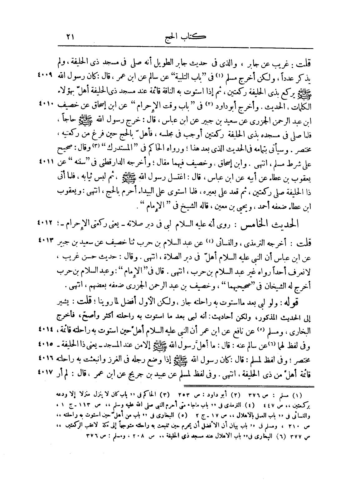قُلْت: أَخْرَجَهُ التِّرْمِذِيُّ، وَالنَّسَائِيُّ 4 عَنْ عَبْدِ السَّلَامِ بْنِ حَرْبٍ ثَنَا خَصِيفٌ عَنْ سَعِيدِ بْنِ جُبَيْرٍ عَنْ ابْنِ عَبَّاسٍ أَنَّ النَّبِيَّ عليه سلام أَهَلَّ فِي دُبُرِ الصَّلَاةِ، انتهى. وقال: حديث حسن غريب، لا نعرف أحداً رواه غير عبد السلام بن حرب، انتهى. قال فِي "الْإِمَامِ": وَعَبْدُ السَّلَامِ بْنُ حَرْبٍ أَخْرَجَ لَهُ الشَّيْخَانِ فِي "صَحِيحَيْهِمَا"، وَخُصَيْفُ بْنُ عَبْدِ الرَّحْمَنِ الْجَزَرِيُّ ضَعَّفَهُ بَعْضُهُمْ، انْتَهَى.