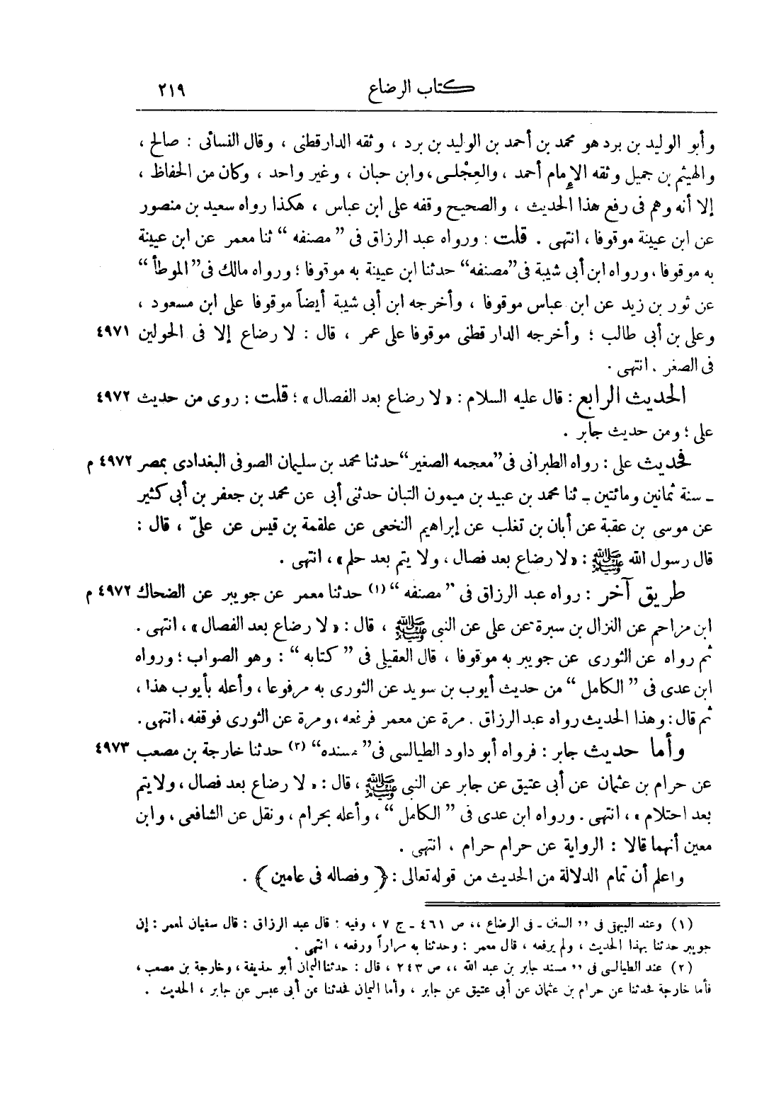 الْحَدِيثُ الرَّابِعُ: قَالَ عليه السلام: "لَا رَضَاعَ بَعْدَ الْفِصَالِ"، قُلْت: رُوِيَ مِنْ حَدِيثِ عَلِيٍّ، وَمِنْ حَدِيثِ جَابِرٍ.