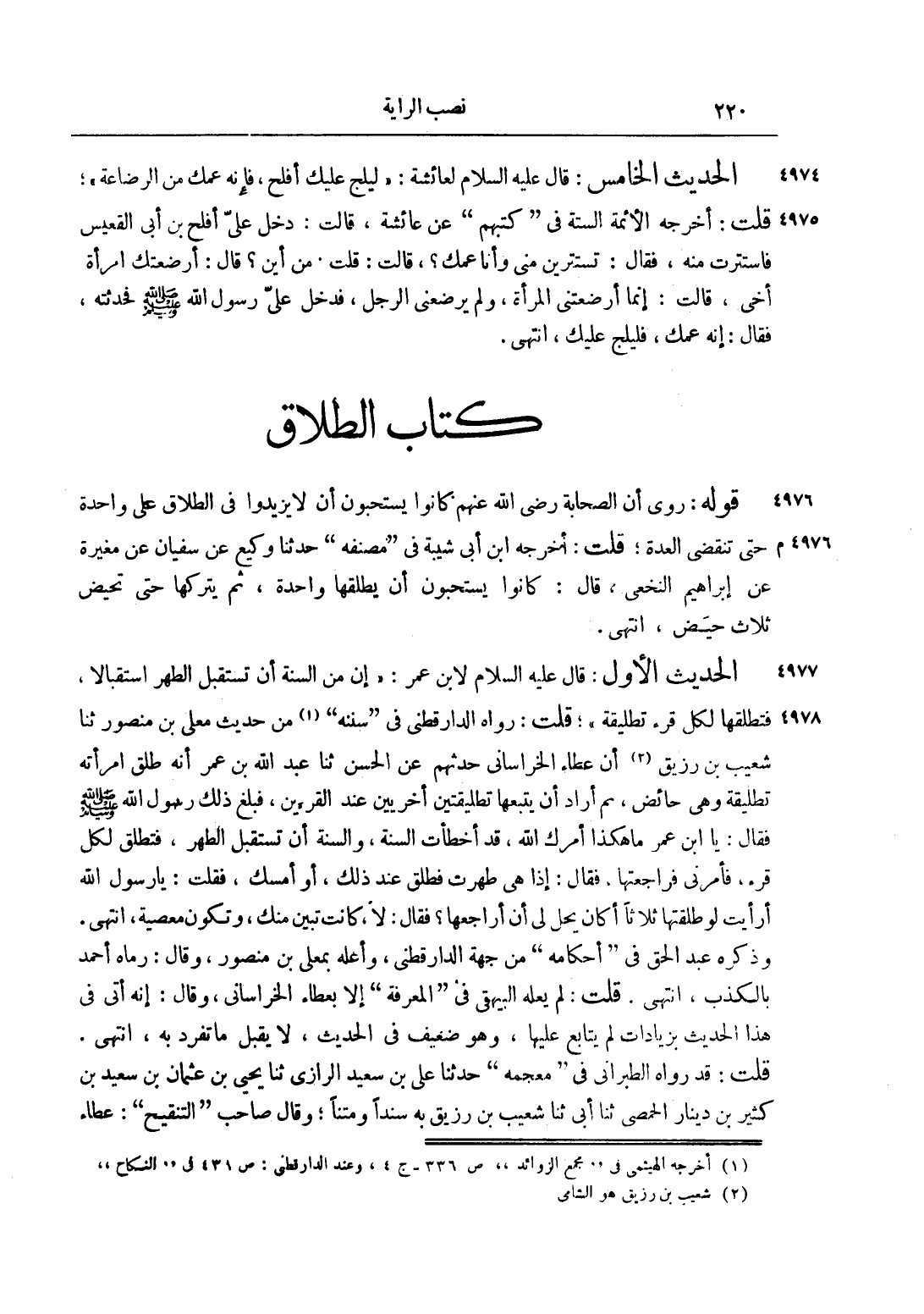 الْحَدِيثُ الْأَوَّلُ: قَالَ عليه السلام لِابْنِ عُمَرَ: "إنَّ مِنْ السُّنَّةِ أَنْ تَسْتَقْبِلَ الطُّهْرَ اسْتِقْبَالًا، فَتُطَلِّقَهَا لِكُلِّ قُرْءٍ تَطْلِيقَةً"، قُلْت: رَوَاهُ الدَّارَقُطْنِيُّ فِي "سُنَنِهِ" 1 مِنْ حَدِيثِ مُعَلَّى بْنِ مَنْصُورٍ ثَنَا شُعَيْبُ بْنُ رُزَيْقٍ 2 أَنَّ عَطَاءً الْخُرَاسَانِيَّ حَدَّثَهُمْ عَنْ الْحَسَنِ ثَنَا عَبْدُ اللَّهِ بْنُ عُمَرَ أَنَّهُ طَلَّقَ امْرَأَتَهُ تَطْلِيقَةً وَهِيَ حَائِضٌ، ثُمَّ أَرَادَ أَنْ يُتْبَعَهَا تَطْلِيقَتَيْنِ أُخْرَيَيْنِ عند القرءَين، فَبَلَغَ ذَلِكَ رَسُولَ اللَّهِ صَلَّى اللَّهُ عَلَيْهِ وَسَلَّمَ فَقَالَ: " يَا ابْنَ عُمَرَ مَا هَكَذَا أَمَرَك اللَّهُ، قَدْ أَخْطَأْت السُّنَّةَ، وَالسُّنَّةُ أن تستقبل الطهر، قتطلق لِكُلِّ قُرْءٍ"، فَأَمَرَنِي فَرَاجَعْتهَا، فَقَالَ: إذَا هِيَ طَهُرَتْ فَطَلِّقْ عِنْدَ ذَلِكَ، أَوْ أَمْسِكْ، فَقُلْت: يَا رَسُولَ اللَّهِ أَرَأَيْت لَوْ طَلَّقْتهَا ثَلَاثًا أَكَانَ يَحِلُّ لِي أَنْ أُرَاجِعَهَا؟ فَقَالَ: " لَا، كَانَتْ تَبِينُ مِنْك، وَتَكُونُ مَعْصِيَةً"، انْتَهَى. وَذَكَرَهُ عَبْدُ الْحَقِّ فِي "أَحْكَامِهِ" مِنْ جِهَةِ الدَّارَقُطْنِيِّ، وَأَعَلَّهُ بِمُعَلَّى بْنِ مَنْصُورٍ، وَقَالَ: رَمَاهُ أَحْمَدُ بِالْكَذِبِ، انْتَهَى. قُلْت: لَمْ يُعِلَّهُ الْبَيْهَقِيُّ فِي "الْمَعْرِفَةِ" إلَّا بِعَطَاءٍ الْخُرَاسَانِيِّ، وَقَالَ: إنَّهُ أَتَى فِي هَذَا الْحَدِيثِ بِزِيَادَاتٍ لَمْ يُتَابَعْ عَلَيْهَا، وَهُوَ ضَعِيفٌ فِي الْحَدِيثِ، لَا يُقْبَلُ مَا تَفَرَّدَ بِهِ، انْتَهَى. قُلْت: قَدْ رَوَاهُ الطَّبَرَانِيُّ فِي "مُعْجَمِهِ" حَدَّثَنَا عَلِيُّ بْنُ سَعِيدٍ الرَّازِيُّ ثَنَا يَحْيَى بْنُ عُثْمَانَ بْنِ سَعِيدِ بْنِ كَثِيرِ بْنِ دِينَارٍ الْحِمْصِيُّ ثَنَا أَبِي ثَنَا شُعَيْبُ بْنُ رُزَيْقٍ بِهِ سَنَدًا وَمَتْنًا، وَقَالَ صَاحِبُ "التَّنْقِيحِ": عَطَاءٌ