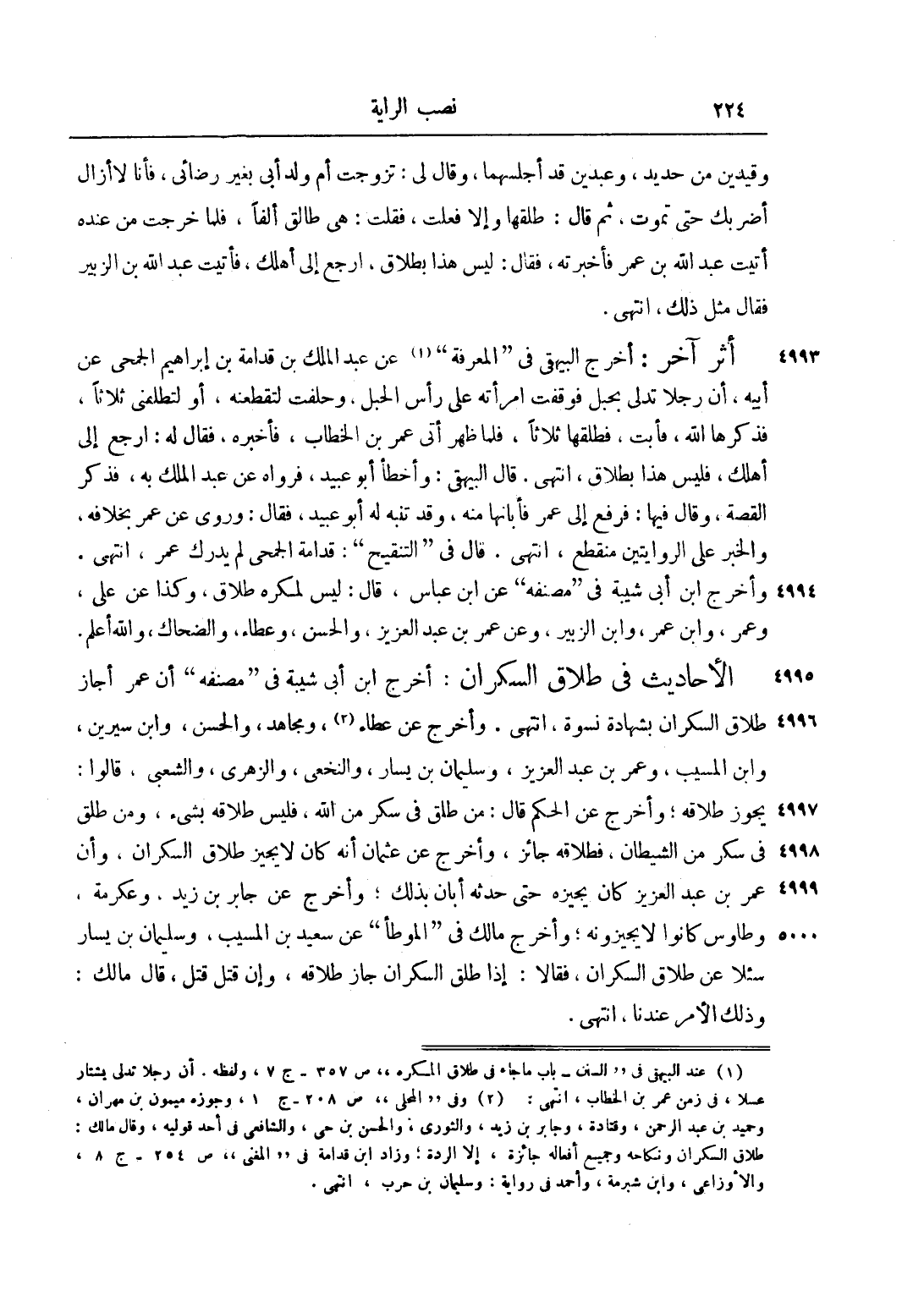 أَثَرٌ آخَرُ: أخرجه الْبَيْهَقِيُّ فِي "الْمَعْرِفَةِ" 1 عَنْ عَبْدِ الْمَلِكِ بْنِ قُدَامَةَ بْنِ إبْرَاهِيمَ الْجُمَحِيِّ عَنْ أَبِيهِ، أَنَّ رَجُلًا تَدَلَّى بِحَبْلٍ فَوَقَفَتْ امْرَأَتُهُ عَلَى رَأْسِ الْحَبْلِ، وَحَلَفَتْ لَتَقْطَعَنَّهُ، أَوْ لِتُطَلِّقْنِي ثَلَاثًا، فَذَكَّرَهَا اللَّهَ، فَأَبَتْ، فَطَلَّقَهَا ثَلَاثًا، فَلَمَّا ظَهَرَ أَتَى عُمَرَ بْنَ الْخَطَّابِ، فَأَخْبَرَهُ، فَقَالَ لَهُ: ارْجِعْ إلَى أَهْلِك، فَلَيْسَ هَذَا بِطَلَاقٍ، انْتَهَى. قَالَ الْبَيْهَقِيُّ: وَأَخْطَأَ أَبُو عُبَيْدٍ، فَرَوَاهُ عَنْ عَبْدِ الْمَلِكِ بِهِ، فَذَكَرَ الْقِصَّةَ، وَقَالَ فِيهَا: فَرَفَعَ إلَى عُمَرَ فَأَبَانَهَا مِنْهُ، وَقَدْ تَنَبَّهَ لَهُ أَبُو عُبَيْدٍ، فَقَالَ: وَرُوِيَ عَنْ عُمَرَ بِخِلَافِهِ وَالْخَبَرُ عَلَى الرِّوَايَتَيْنِ مُنْقَطِعٌ، انْتَهَى. قَالَ فِي "التَّنْقِيحِ": قُدَامَةُ الْجُمَحِيُّ لَمْ يُدْرِكْ عُمَرَ، انْتَهَى. وَأَخْرَجَ ابْنُ أَبِي شَيْبَةَ فِي "مُصَنَّفِهِ" عَنْ ابْنِ عَبَّاسٍ، قَالَ: لَيْسَ لِمُكْرَهٍ طَلَاقٌ، وَكَذَا عَنْ عَلِيٍّ، وَعُمَرَ، وَابْنِ عُمَرَ، وَابْنِ الزُّبَيْرِ، وَعَنْ عُمَرَ بْنِ عَبْدِ الْعَزِيزِ، وَالْحَسَنِ، وَعَطَاءٍ، وَالضَّحَّاكِ، وَاَللَّهُ أَعْلَمُ.