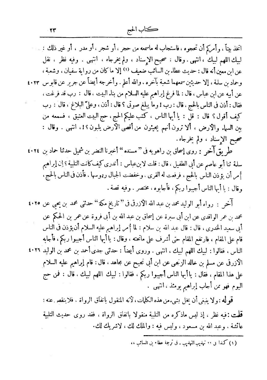 آخَرُ: رَوَاهُ أَبُو الْوَلِيدِ مُحَمَّدُ بْنُ عَبْدِ اللَّهِ الْأَزْرَقِيُّ فِي "تَارِيخِ مَكَّةَ" حَدَّثَنِي مُحَمَّدُ يَحْيَى عَنْ مُحَمَّدِ بْنِ عُمَرَ الْوَاقِدِيِّ عَنْ ابْنِ أبي إسْحَاقَ بْنِ عَبْدِ اللَّهِ بْنِ أَبِي فَرْوَةَ عَنْ عُمَرَ بْنِ الْحَكَمِ عَنْ أَبِي سَعِيدٍ الْخُدْرِيِّ، قَالَ: قَالَ عَبْدُ اللَّهِ بْنُ سَلَامٍ: لَمَّا أُمِرَ إبْرَاهِيمُ عليه السلام أَنْ يُؤَذِّنَ فِي النَّاسِ قَامَ عَلَى الْمَقَامِ، فَارْتَفَعَ الْمَقَامُ حَتَّى أَشْرَفَ عَلَى مَا تَحْتَهُ، وَقَالَ: يَا أَيُّهَا النَّاسُ أَجِيبُوا رَبَّكُمْ، فَأَجَابَهُ النَّاسُ، فَقَالُوا: لَبَّيْكَ اللَّهُمَّ لَبَّيْكَ، انْتَهَى. وَرُوِيَ أَيْضًا: حَدَّثَنِي جَدِّي أَحْمَدُ بْنُ مُحَمَّدِ بْنِ الْوَلِيدِ الْأَزْرَقِيُّ عَنْ مُسْلِمِ بْنِ خَالِدٍ الزَّنْجِيِّ عَنْ ابْنِ أَبِي نَجِيحٍ عَنْ مُجَاهِدٍ، قَالَ: قَامَ إبْرَاهِيمُ عليه السلام عَلَى هَذَا الْمَقَامِ، فَقَالَ: يَا أَيُّهَا النَّاسُ أَجِيبُوا رَبَّكُمْ، فَقَالُوا: لَبَّيْكَ اللَّهُمَّ لَبَّيْكَ، قَالَ: فَمَنْ حَجَّ الْيَوْمَ فَهُوَ مِمَّنْ أَجَابَ إبْرَاهِيمَ يَوْمَئِذٍ، انْتَهَى.