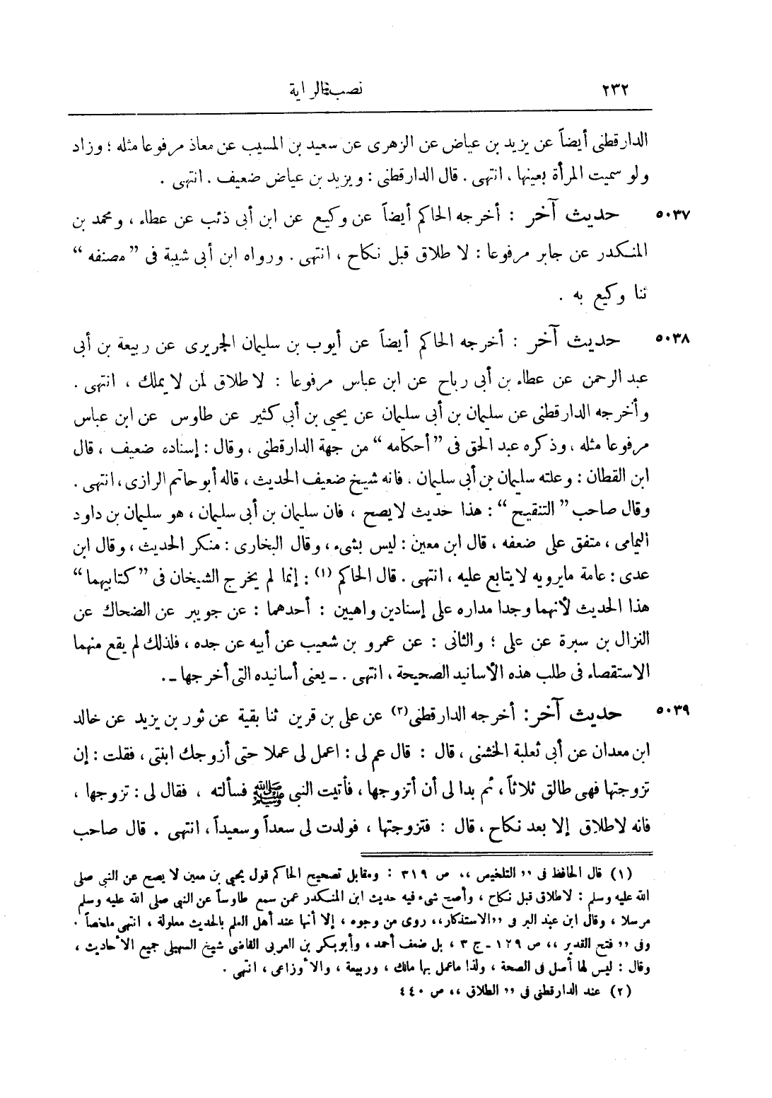 حَدِيثٌ آخَرُ: أَخْرَجَهُ الدَّارَقُطْنِيُّ 2 عَنْ عَلِيِّ بْنِ قَرِينٍ ثَنَا بَقِيَّةُ عَنْ ثَوْرِ بْنِ يَزِيدَ عَنْ خَالِدِ بْنِ مَعْدَانُ عَنْ أَبِي ثَعْلَبَةَ الْخُشَنِيِّ، قَالَ: قَالَ عَمٌّ لِي: اعْمَلْ لِي عَمَلًا حَتَّى أُزَوِّجَك ابْنَتِي، فَقُلْت: إنْ تَزَوَّجْتهَا فَهِيَ طَالِقٌ ثَلَاثًا، ثُمَّ بَدَا لِي أَنْ أَتَزَوَّجَهَا، فَأَتَيْت النَّبِيَّ صَلَّى اللَّهُ عَلَيْهِ وَسَلَّمَ فَسَأَلْته، فَقَالَ لِي: " تَزَوَّجْهَا، فَإِنَّهُ لَا طَلَاقَ إلَّا بَعْدَ نِكَاحٍ"، قَالَ: فَتَزَوَّجْتهَا، فَوَلَدَتْ لِي سَعْدًا وَسَعِيدًا، انْتَهَى. قَالَ صَاحِبُ