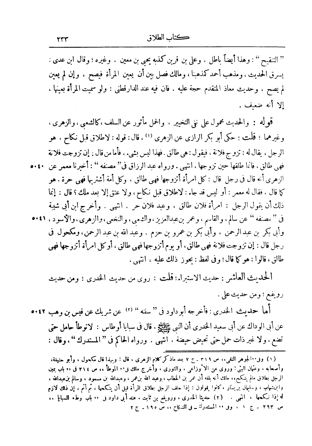 أَمَّا حَدِيثُ الْخُدْرِيِّ: فَأَخْرَجَهُ أَبُو دَاوُد فِي "سُنَنِهِ" 2 عَنْ شَرِيكٍ عَنْ قَيْسِ بْنِ وَهْبٍ عَنْ أَبِي الْوَدَّاكِ عَنْ أَبِي سَعِيدٍ الْخُدْرِيِّ أَنَّ النَّبِيَّ صَلَّى اللَّهُ عَلَيْهِ وَسَلَّمَ، قَالَ فِي سَبَايَا أَوْطَاسٍ: " لَا تُوطَأُ حَامِلٌ حَتَّى تَضَعَ، وَلَا غَيْرُ ذَاتِ حَمْلٍ حَتَّى تَحِيضَ حَيْضَةً"، انْتَهَى. ورَوَاهُ الْحَاكِمُ فِي "الْمُسْتَدْرَكِ" وَقَالَ: