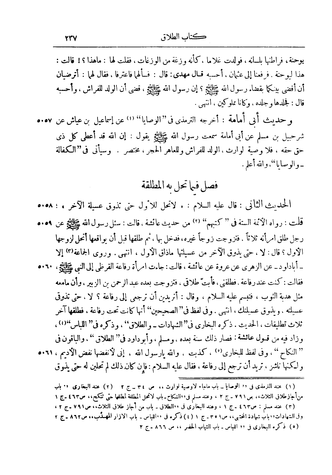 3 عند مسلم: ص 463 - ج 1، وعند البخاري في "الطلاق - باب من أجاز طلاق الثلاث" ص 791 - ج 2، وفي الشهادات "باب شهادة المختبي" ص 359 - ج 1.
