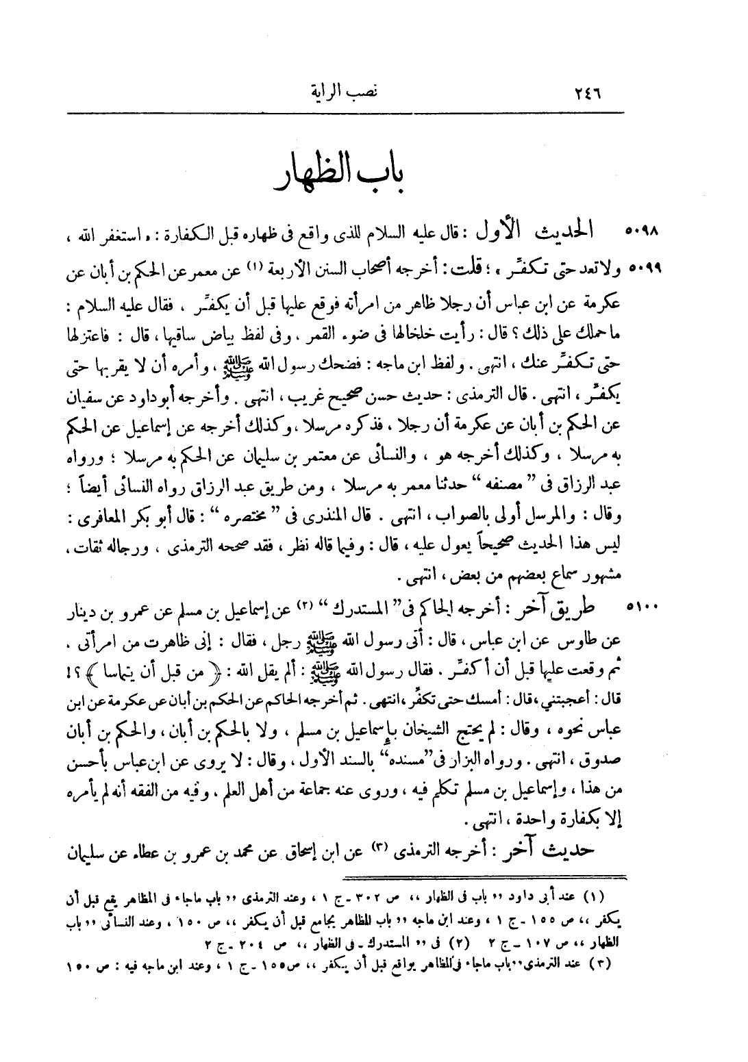 الْحَدِيثُ الْأَوَّلُ: قَالَ عليه السلام لِلَّذِي وَاقَعَ فِي ظِهَارِهِ قَبْلَ الْكَفَّارَةِ: "اسْتَغْفِرْ اللَّهَ، وَلَا تَعُدْ حَتَّى تُكَفِّرَ"، قُلْت: أَخْرَجَهُ أَصْحَابُ السُّنَنِ الْأَرْبَعَةِ 1 عَنْ مَعْمَرٍ عَنْ الْحَكَمِ بْنِ أَبَانَ عَنْ عِكْرِمَةَ عَنْ ابْنِ عَبَّاسٍ أَنَّ رَجُلًا ظَاهَرَ مِنْ امْرَأَتِهِ فَوَقَعَ عَلَيْهَا قَبْلَ أَنْ يُكَفِّرَ، فَقَالَ عليه السلام: " مَا حَمَلَك عَلَى ذَلِكَ؟ " قَالَ: رَأَيْت خَلْخَالَهَا فِي ضَوْءِ الْقَمَرِ، وَفِي لَفْظٍ: بَيَاضَ سَاقَيْهَا، قَالَ: "فَاعْتَزِلْهَا حَتَّى تُكَفِّرَ عَنْك"، انْتَهَى. وَلَفْظُ ابْنِ مَاجَهْ: فَضَحِكَ رَسُولُ اللَّهِ صَلَّى اللَّهُ عَلَيْهِ وَسَلَّمَ، وَأَمَرَهُ أَنْ لَا يَقْرَبَهَا حَتَّى يُكَفِّرَ، انْتَهَى. قَالَ التِّرْمِذِيُّ: حَدِيثٌ حَسَنٌ صَحِيحٌ غَرِيبٌ، انْتَهَى. وَأَخْرَجَهُ أَبُو دَاوُد عَنْ سُفْيَانَ عَنْ الْحَكَمِ بْنِ أَبَانَ عَنْ عِكْرِمَةَ أَنَّ رَجُلًا، فَذَكَرَهُ مُرْسَلًا، وَكَذَلِكَ أَخْرَجَهُ عَنْ إسْمَاعِيلَ عَنْ الْحَكَمِ بِهِ مُرْسَلًا، وَكَذَلِكَ أَخْرَجَهُ هُوَ، وَالنَّسَائِيُّ عَنْ مُعْتَمِرِ بْنِ سُلَيْمَانَ عَنْ الْحَكَمِ بِهِ مُرْسَلًا، وَرَوَاهُ عَبْدُ الرَّزَّاقِ فِي "مُصَنَّفِهِ" حَدَّثَنَا مَعْمَرٌ بِهِ مُرْسَلًا، وَمِنْ طَرِيقِ عَبْدِ الرَّزَّاقِ رَوَاهُ النَّسَائِيّ أَيْضًا، وَقَالَ: وَالْمُرْسَلُ أَوْلَى بِالصَّوَابِ، انْتَهَى. قَالَ الْمُنْذِرِيُّ فِي "مُخْتَصَرِهِ": قَالَ أَبُو بَكْرٍ الْمَعَافِرِيُّ: لَيْسَ هَذَا الْحَدِيثُ صَحِيحًا يُعَوَّلُ عَلَيْهِ، قَالَ: وَفِيمَا قَالَهُ نَظَرٌ، فَقَدْ صَحَّحَهُ التِّرْمِذِيُّ، وَرِجَالُهُ ثِقَاتٌ، مَشْهُورٌ سَمَاعُ بَعْضِهِمْ مِنْ بَعْضٍ، انْتَهَى.