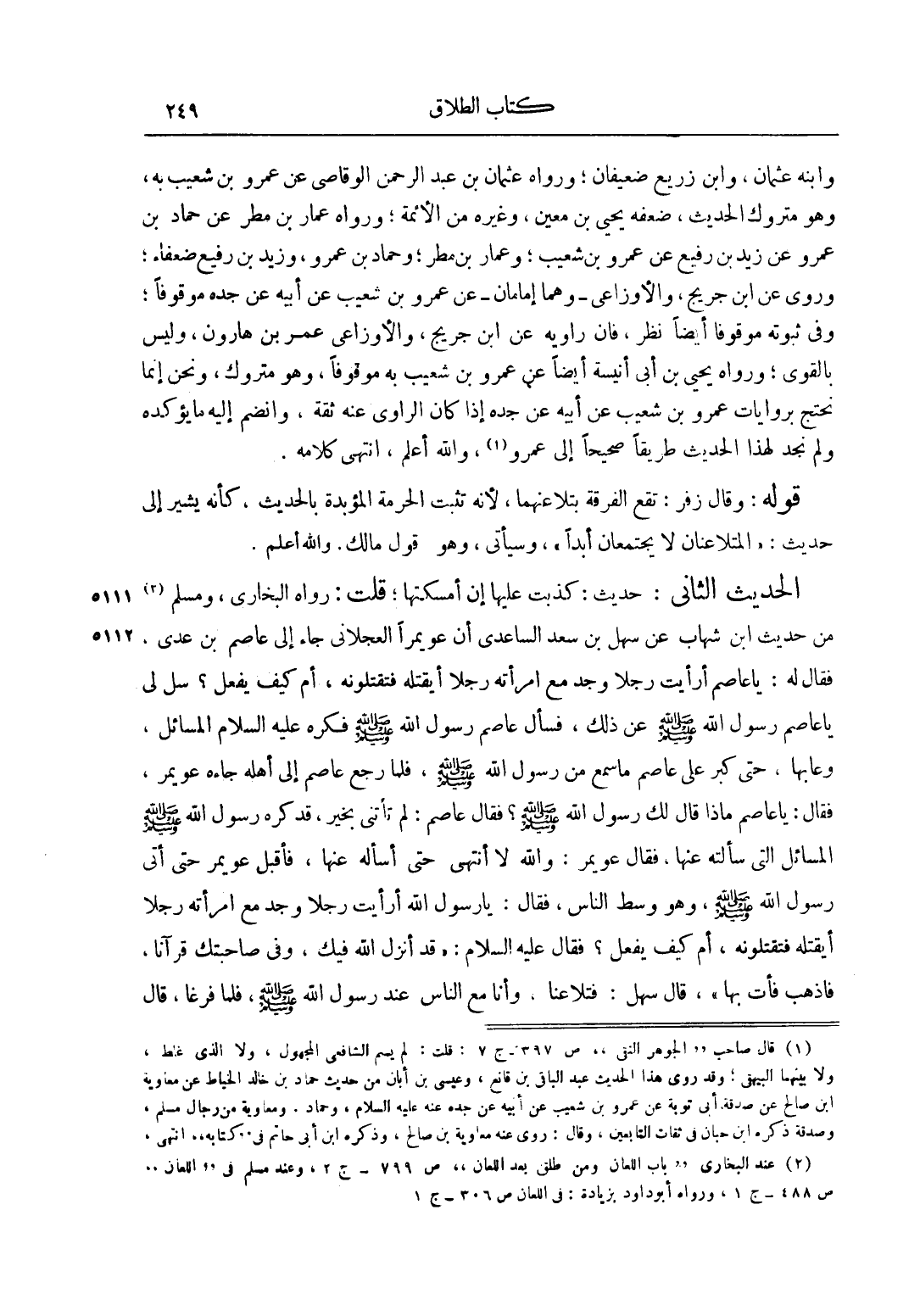 الْحَدِيثُ الثَّانِي: حَدِيثُ: كَذَبْتُ عَلَيْهَا إنْ أَمْسَكْتهَا، قُلْت: رَوَاهُ الْبُخَارِيُّ، وَمُسْلِمٌ 2 مِنْ حَدِيثِ ابْنِ شِهَابٍ عَنْ سَهْلِ بْنِ سَعْدٍ السَّاعِدِيِّ أَنَّ عُوَيْمِرًا الْعَجْلَانِيُّ جَاءَ إلَى عَاصِمِ بْنِ عَدِيٍّ، فَقَالَ لَهُ: يَا عَاصِمُ أَرَأَيْت رَجُلًا وَجَدَ مَعَ امْرَأَتِهِ رَجُلًا أَيَقْتُلُهُ فَيَقْتُلُونَهُ، أَمْ كَيْفَ يَفْعَلُ؟ سَلْ لِي يَا عَاصِمُ رَسُولَ اللَّهِ صَلَّى اللَّهُ عَلَيْهِ وَسَلَّمَ عَنْ ذَلِكَ، فَسَأَلَ عَاصِمٌ رَسُولَ اللَّهِ صَلَّى اللَّهُ عَلَيْهِ وَسَلَّمَ فَكَرِهَ عليه السلام الْمَسَائِلَ، وَعَابَهَا، حَتَّى كَبُرَ عَلَى عَاصِمٍ مَا سَمِعَ مِنْ رَسُولِ اللَّهِ صَلَّى اللَّهُ عَلَيْهِ وَسَلَّمَ، فَلَمَّا رَجَعَ عَاصِمٌ إلَى أَهْلِهِ جَاءَهُ عُوَيْمِرٌ، فَقَالَ: يَا عَاصِمُ مَاذَا قَالَ لَك رَسُولُ اللَّهِ صَلَّى اللَّهُ عَلَيْهِ وَسَلَّمَ؟ فَقَالَ عَاصِمٌ: لَمْ تَأْتِنِي بِخَيْرٍ، قَدْ كَرِهَ رَسُولُ اللَّهِ صَلَّى اللَّهُ عَلَيْهِ وَسَلَّمَ الْمَسَائِلَ الَّتِي سَأَلْته عَنْهَا، فَقَالَ عُوَيْمِرٌ: وَاَللَّهِ لَا أَنْتَهِي حَتَّى أَسْأَلَهُ عَنْهَا، فَأَقْبَلَ عُوَيْمِرٌ حَتَّى أَتَى رَسُولَ اللَّهِ صَلَّى اللَّهُ عَلَيْهِ وَسَلَّمَ، وَهُوَ وَسَطَ النَّاسِ، فَقَالَ: يَا رَسُولَ اللَّهِ أَرَأَيْت رَجُلًا وَجَدَ مَعَ امْرَأَتِهِ رَجُلًا أَيَقْتُلُهُ فَيَقْتُلُونَهُ، أَمْ كَيْفَ يَفْعَلُ؟ فَقَالَ عليه السلام: "قَدْ أَنْزَلَ اللَّهُ فِيك، وَفِي صَاحِبَتِك قُرْآنًا، فَاذْهَبْ فَأْتِ بِهَا"، قَالَ سَهْلٌ: فَتَلَاعَنَا، وَأَنَا مَعَ النَّاسِ عِنْدَ رَسُولِ اللَّهِ صَلَّى اللَّهُ عَلَيْهِ وَسَلَّمَ، فَلَمَّا فَرَغَا، قَالَ