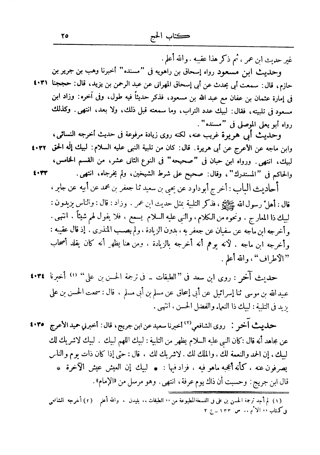 وَحَدِيثُ ابْنِ مَسْعُودٍ رَوَاهُ إسْحَاقُ بْنُ رَاهْوَيْهِ فِي "مُسْنَدِهِ" أَخْبَرَنَا وَهْبُ بْنُ جَرِيرِ بْنِ حَازِمٍ، قَالَ: سَمِعْت أَبِي يُحَدِّثُ عَنْ أَبِي إسْحَاقَ الْمِهْرَانِيِّ عَنْ عبد الرحمن بن زيد، قَالَ: حَجَجْنَا فِي إمَارَةِ عُثْمَانَ بْنِ عَفَّانَ مَعَ عَبْدِ اللَّهِ بْنِ مَسْعُودٍ، فَذَكَرَ حَدِيثًا فِيهِ طُولٌ، وَفِي آخِرِهِ: وَزَادَ ابْنُ مَسْعُودٍ فِي تَلْبِيَتِهِ، فَقَالَ: لَبَّيْكَ عَدَدَ التُّرَابِ، وَمَا سَمِعْته قَبْلَ ذَلِكَ، وَلَا بَعْدَ، انْتَهَى. وَكَذَلِكَ رَوَاهُ أَبُو يَعْلَى الْمَوْصِلِيُّ فِي "مُسْنَدِهِ".