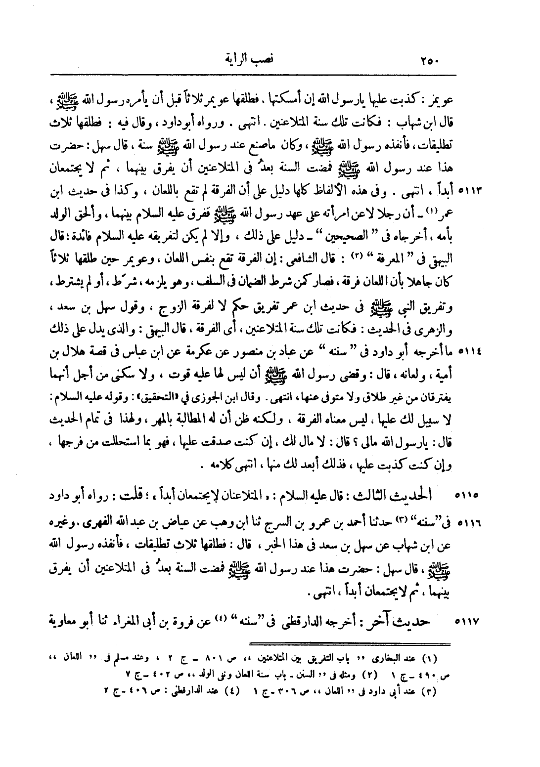 الْحَدِيثُ الثَّالِثُ: قَالَ عليه السلام: "الْمُتَلَاعِنَانِ لَا يَجْتَمِعَانِ أَبَدًا"، قُلْت: رَوَاهُ أَبُو دَاوُد فِي "سُنَنِهِ" 3 حَدَّثَنَا أَحْمَدُ بْنُ عَمْرِو بْنِ السَّرْحِ ثَنَا ابْنُ وَهْبٍ عَنْ عِيَاضِ بْنِ عَبْدِ اللَّهِ الْفِهْرِيِّ، وَغَيْرِهِ عَنْ ابْنِ شِهَابٍ عَنْ سَهْلِ بْنِ سَعْدٍ فِي هَذَا الْخَبَرِ، قَالَ: فَطَلَّقَهَا ثَلَاثَ تَطْلِيقَاتٍ، فَأَنْفَذَهُ رَسُولُ اللَّهِ صَلَّى اللَّهُ عَلَيْهِ وَسَلَّمَ، قَالَ سَهْلٌ: حَضَرْت هَذَا عِنْدَ رَسُولِ اللَّهِ صَلَّى اللَّهُ عَلَيْهِ وَسَلَّمَ فَمَضَتْ السُّنَّةُ بَعْدُ فِي الْمُتَلَاعِنَيْنِ أَنْ يُفَرَّقَ بَيْنَهُمَا، ثُمَّ لَا يَجْتَمِعَانِ أَبَدًا، انْتَهَى.