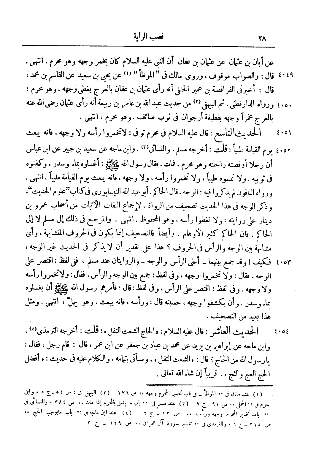 عَنْ أَبَانَ بْنِ عُثْمَانَ عَنْ عُثْمَانَ بْنِ عَفَّانَ أَنَّ النَّبِيَّ عليه السلام كَانَ يُخَمِّرُ وَجْهَهُ وَهُوَ مُحْرِمٌ، انْتَهَى. قَالَ: وَالصَّوَابُ مَوْقُوفٌ، وَرَوَى مَالِكٌ فِي "الْمُوَطَّأِ" 1 عَنْ يَحْيَى بْنِ سَعِيدٍ عَنْ الْقَاسِمِ بْنِ مُحَمَّدٍ، قَالَ: أَخْبَرَنِي الْفُرَافِصَةُ بْنُ عُمَيْرٍ الْحَنَفِيُّ أَنَّهُ رَأَى عُثْمَانَ بْنَ عَفَّانَ بِالْعَرْجِ يُغَطِّي وَجْهَهُ، وَهُوَ مُحْرِمٌ، وَرَوَاهُ الدَّارَقُطْنِيُّ، ثُمَّ الْبَيْهَقِيُّ 2 مِنْ حَدِيثِ عَبْدِ اللَّهِ بْنِ عَامِرِ بْنِ رَبِيعَةَ أَنَّهُ رَأَى عُثْمَانَ رضي الله عنه بِالْعَرْجِ مُخَمِّرًا وَجْهَهُ بِقَطِيفَةِ أُرْجُوَانٍ فِي ثَوْبٍ صَائِفٍ، وَهُوَ مُحْرِمٌ، انْتَهَى.
