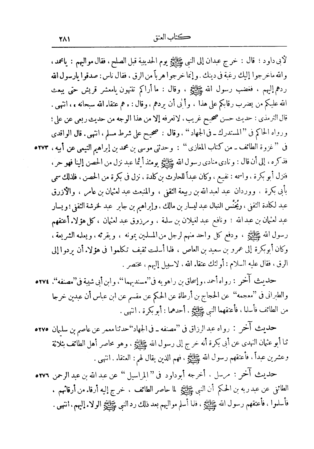 لِأَبِي دَاوُد، قَالَ: خَرَجَ عَبْدَانِ إلَى النَّبِيِّ صَلَّى اللَّهُ عَلَيْهِ وَسَلَّمَ يَوْمَ الْحُدَيْبِيَةِ قَبْلَ الصُّلْحِ، فَقَالَ مَوَالِيهِمْ: يَا مُحَمَّدُ، وَاَللَّهِ مَا خَرَجُوا إلَيْك رَغْبَةً فِي دِينِك، وَإِنَّمَا خَرَجُوا هَرَبًا مِنْ الرِّقِّ، فَقَالَ نَاسٌ: صَدَقُوا يَا رَسُولَ اللَّهِ رُدَّهُمْ إلَيْهِمْ، فَغَضِبَ رَسُولُ اللَّهِ صَلَّى اللَّهُ عَلَيْهِ وَسَلَّمَ، وَقَالَ: " مَا أَرَاكُمْ تَنْتَهُونَ يَا مَعْشَرَ قُرَيْشٍ حتى يبعث الله إليكم مَنْ يَضْرِبُ رِقَابَكُمْ عَلَى هَذَا"، وَأَبَى أَنْ يَرُدَّهُمْ، وَقَالَ: "هُمْ عُتَقَاءُ اللَّهِ سُبْحَانَهُ"، انْتَهَى. قَالَ التِّرْمِذِيُّ: حَدِيثٌ حَسَنٌ صَحِيحٌ غَرِيبٌ، لَا نَعْرِفُهُ إلَّا مِنْ هَذَا الْوَجْهِ مِنْ حَدِيثِ رِبْعِيٍّ عَنْ عَلِيٍّ، وَرَوَاهُ الْحَاكِمُ فِي "الْمُسْتَدْرَكِ - فِي الْجِهَادِ"، وَقَالَ: صَحِيحٌ عَلَى شَرْطِ مُسْلِمٍ، انْتَهَى. قَالَ الْوَاقِدِيُّ فِي "غَزْوَةِ الطَّائِفِ - من كتاب الْمَغَازِي": وَحَدَّثَنِي مُوسَى بْنُ مُحَمَّدِ بْنِ إبْرَاهِيمَ التَّيْمِيُّ عَنْ أَبِيهِ، فَذَكَرَهُ، إلَى أَنْ قَالَ: وَنَادَى مُنَادِي رَسُولِ اللَّهِ صَلَّى اللَّهُ عَلَيْهِ وَسَلَّمَ يَوْمَئِذٍ أَيُّمَا عَبْدٍ نَزَلَ مِنْ الْحِصْنِ إلَيْنَا فَهُوَ حُرٌّ، فَنَزَلَ أَبُو بَكْرَةَ، وَاسْمُهُ: نُفَيْعٌ، وَكَانَ عَبْدًا لِلْحَارِثِ بْنِ كَلَدَةَ، نَزَلَ فِي بَكْرَةٍ مِنْ الْحِصْنِ، فَلِذَلِكَ سُمِّيَ بِأَبِي بَكْرَةَ، وَوَرْدَانُ عَبْدٌ لِعَبْدِ اللَّهِ بْنِ رَبِيعَةَ الثَّقَفِيِّ، وَالْمُنْبَعِثُ عَبْدٌ لِعُثْمَانَ بْنِ عَامِرٍ، وَالْأَزْرَقُ عَبْدٌ لِكَلَدَةَ الثَّقَفِيِّ، وَيُحَنَّسُ النَّبَّالُ عَبْدٌ لِيَسَارِ بْنِ مَالِكٍ، وَإِبْرَاهِيمُ بْنُ جَابِرٍ عَبْدٌ لِخَوْشَةَ الثَّقَفِيِّ، وَيَسَارٌ عَبْدٌ لِعُثْمَانَ بْنِ عَبْدِ اللَّهِ، وَنَافِعٌ عَبْدٌ لِغَيْلَانَ بْنِ سَلَمَةَ، وَمَرْزُوقٌ عَبْدٌ لِعُثْمَانَ، كُلُّ هَؤُلَاءِ أَعْتَقَهُمْ رَسُولُ اللَّهِ صَلَّى اللَّهُ عَلَيْهِ وَسَلَّمَ، وَدَفَعَ كُلَّ وَاحِدٍ مِنْهُمْ لِرَجُلٍ مِنْ الْمُسْلِمِينَ يُمَوِّنُهُ، وَيُقْرِئُهُ، وَيُعَلِّمُهُ الشَّرِيعَةَ، وَكَانَ أَبُو بَكْرَةَ إلَى عَمْرِو بْنِ سَعِيدِ بْنِ الْعَاصِ، فَلَمَّا أَسْلَمَتْ ثَقِيفٌ تَكَلَّمُوا فِي هَؤُلَاءِ أَنْ يُرَدُّوا إلَى الرِّقِّ، فَقَالَ عليه السلام: " أُولَئِكَ عُتَقَاءُ اللَّهِ، لَا سَبِيلَ إلَيْهِمْ"، مُخْتَصَرٌ.