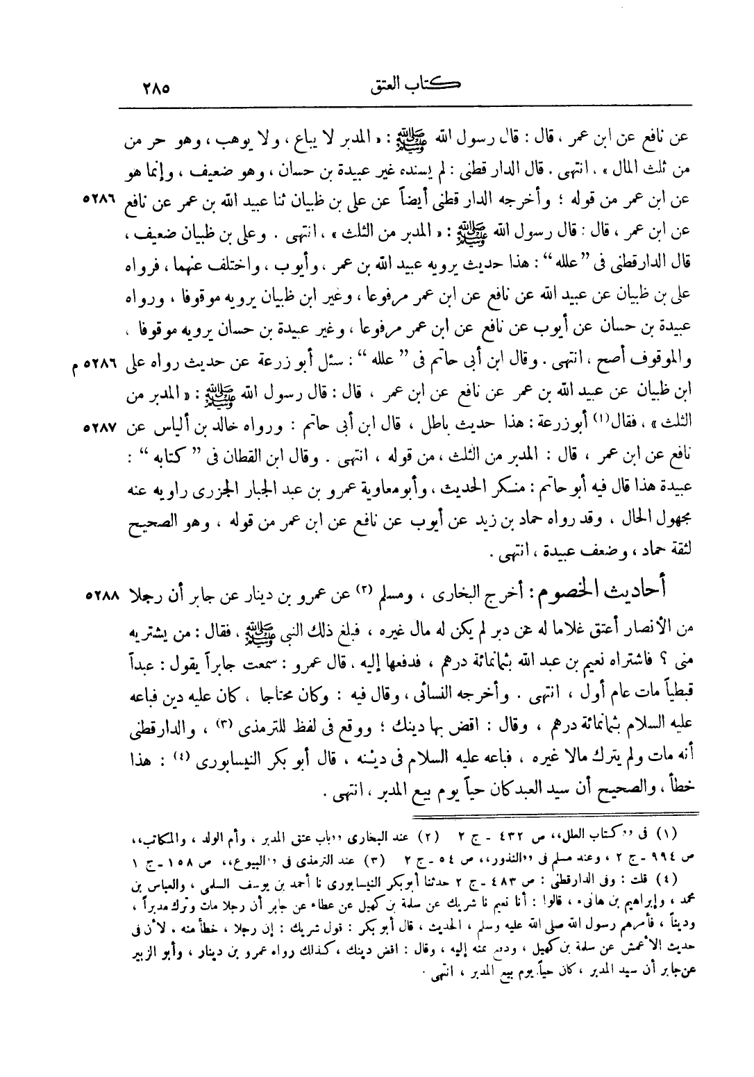أَحَادِيثُ الْخُصُومِ: أَخْرَجَ الْبُخَارِيُّ، وَمُسْلِمٌ 2 عَنْ عَمْرِو بْنِ دِينَارٍ عَنْ جَابِرٍ أَنَّ رَجُلًا مِنْ الْأَنْصَارِ أَعْتَقَ غُلَامًا لَهُ عَنْ دُبُرٍ لَمْ يَكُنْ لَهُ مَالٌ غَيْرُهُ، فَبَلَغَ ذَلِكَ النَّبِيَّ صَلَّى اللَّهُ عَلَيْهِ وَسَلَّمَ، فَقَالَ: " مَنْ يَشْتَرِيهِ مِنِّي؟ " فَاشْتَرَاهُ نُعَيْمُ بْنُ عَبْدِ اللَّهِ بِثَمَانِمِائَةِ دِرْهَمٍ، فَدَفَعَهَا إلَيْهِ، قَالَ عَمْرٌو: سَمِعْت جَابِرًا يَقُولُ: عَبْدًا قِبْطِيًّا مَاتَ عَامَ أَوَّلَ، انْتَهَى. وَأَخْرَجَهُ النَّسَائِيّ، وَقَالَ فِيهِ: وَكَانَ مُحْتَاجًا، كَانَ عَلَيْهِ دَيْنٌ فَبَاعَهُ عليه السلام بِثَمَانِمِائَةِ دِرْهَمٍ، وَقَالَ: "اقْضِ بِهَا دَيْنَك"، وَوَقَعَ فِي لَفْظٍ لِلتِّرْمِذِيِّ3، والدارقطني أَنَّهُ مَاتَ وَلَمْ يَتْرُكْ مَالًا غَيْرَهُ، فَبَاعَهُ عليه السلام فِي دَيْنِهِ، قَالَ أَبُو بَكْرٍ النَّيْسَابُورِيُّ 4: هَذَا خَطَأٌ، وَالصَّحِيحُ أَنَّ سَيِّدَ الْعَبْدِ كَانَ حَيًّا يَوْمَ بِيعَ الْمُدَبَّرُ، انْتَهَى.