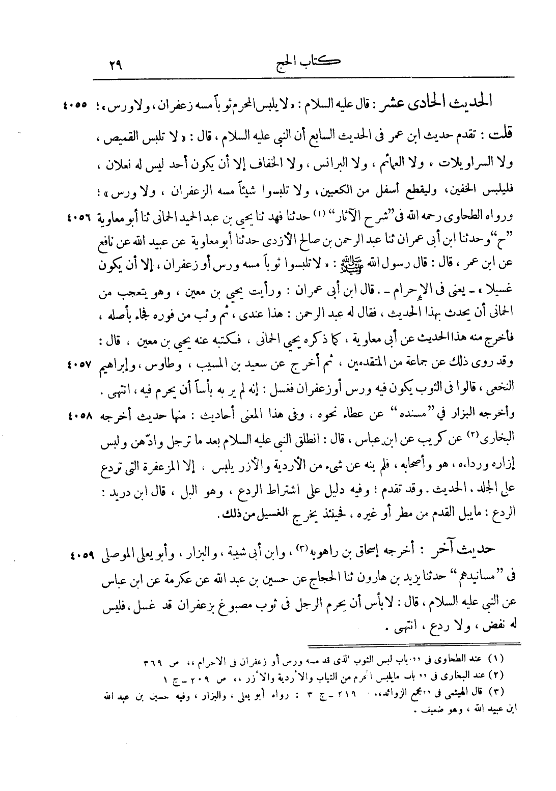 الْحَدِيثُ الْحَادِيَ عَشَرَ: قَالَ عليه السلام: " لَا يَلْبَسْ الْمُحْرِمُ ثَوْبًا مَسَّهُ زَعْفَرَانٌ، وَلَا وَرْسٌ"، قُلْت: تَقَدَّمَ حَدِيثُ ابْنِ عُمَرَ فِي الْحَدِيثِ السَّابِعِ أَنَّ النَّبِيَّ عليه السلام، قَالَ: "لَا تَلْبَسْ الْقَمِيصَ، وَلَا السَّرَاوِيلَاتِ، وَلَا الْعَمَائِمَ، وَلَا الْبَرَانِسَ، وَلَا الْخِفَافَ إلَّا أَنْ يَكُونَ أَحَدٌ لَيْسَ لَهُ نَعْلَانِ، فَيَلْبَسُ الْخُفَّيْنِ، وَلْيَقْطَعْ أَسْفَلَ مِنْ الْكَعْبَيْنِ، وَلَا تَلْبَسُوا شَيْئًا مَسَّهُ الزَّعْفَرَانُ، وَلَا وَرْسٌ "، وَرَوَاهُ الطَّحَاوِيُّ رحمه الله فِي "شَرْحِ الْآثَارِ" 1 حَدَّثَنَا فَهْدٌ ثَنَا يَحْيَى بْنُ عَبْدِ الْحَمِيدِ الْحِمَّانِيُّ ثَنَا أبو معاوية "ح" وَحَدَّثَنَا ابْنُ أَبِي عِمْرَانَ ثَنَا عَبْدُ الرَّحْمَنِ بْنُ صَالِحٍ الْأَزْدِيُّ حَدَّثَنَا أَبُو مُعَاوِيَةَ عَنْ عُبَيْدِ اللَّهِ عَنْ نَافِعٍ عَنْ ابْنِ عُمَرَ، قَالَ: قَالَ رَسُولُ اللَّهِ صَلَّى اللَّهُ عَلَيْهِ وَسَلَّمَ: " لَا تَلْبَسُوا ثَوْبًا مَسَّهُ وَرْسٌ أَوْ زَعْفَرَانٌ، إلَّا أَنْ يَكُونَ غَسِيلًا" - يَعْنِي فِي الْإِحْرَامِ - قَالَ ابْنُ أَبِي عِمْرَانَ: وَرَأَيْت يَحْيَى بْنَ مَعِينٍ، وَهُوَ يَتَعَجَّبُ مِنْ الْحِمَّانِيُّ أَنْ يُحَدِّثَ بِهَذَا الْحَدِيثِ، فَقَالَ لَهُ عَبْدُ الرَّحْمَنِ: هَذَا عِنْدِي، ثُمَّ وَثَبَ مِنْ فَوْرِهِ فَجَاءَ بِأَصْلِهِ، فَخَرَّجَ مِنْهُ هَذَا الْحَدِيثَ عَنْ أَبِي مُعَاوِيَةَ، كَمَا ذَكَرَهُ يَحْيَى الْحِمَّانِيُّ، فَكَتَبَهُ عَنْهُ يَحْيَى بْنُ مَعِينٍ، قَالَ: وَقَدْ رَوَى ذَلِكَ عَنْ جَمَاعَةٍ مِنْ الْمُتَقَدِّمِينَ، ثُمَّ أَخْرَجَ عَنْ سَعِيدِ بْنِ الْمُسَيِّبِ، وَطَاوُسٍ، وَإِبْرَاهِيمَ النَّخَعِيّ، قَالُوا فِي الثَّوْبِ يَكُونُ فِيهِ وَرْسٌ أَوْ زَعْفَرَانٌ فَغُسِلَ: إنَّهُ لَمْ يَرَ بِهِ بَأْسًا أَنْ يُحْرِمَ فِيهِ، انْتَهَى. وَأَخْرَجَ الْبَزَّارُ فِي "مُسْنَدِهِ" عَنْ عَطَاءٍ نَحْوَهُ، وَفِي هَذَا الْمَعْنَى أَحَادِيثُ: مِنْهَا حَدِيثٌ أَخْرَجَهُ الْبُخَارِيُّ 2 عَنْ كُرَيْبٌ عَنْ ابْنِ عَبَّاسٍ، قَالَ: انْطَلَقَ النَّبِيُّ عليه السلام بَعْدَ مَا تَرَجَّلَ وَادَّهَنَ وَلَبِسَ إزَارَهُ وَرِدَاءَهُ، هُوَ وَأَصْحَابُهُ، فَلَمْ يَنْهَ عَنْ شَيْءٍ مِنْ الْأَرْدِيَةِ وَالْأُزُرِ يُلْبَسُ، إلَّا الْمُزَعْفَرَةَ الَّتِي تَرْدَعُ عَلَى الْجِلْدِ، الْحَدِيثَ. وَقَدْ تَقَدَّمَ، وَفِيهِ دَلِيلٌ عَلَى اشْتِرَاطِ الرَّدْعِ، وَهُوَ الْبَلُّ، قَالَ ابْنُ دُرَيْدٍ: الرَّدْعُ: مَا يَبُلُّ الْقَدَمَ مِنْ مَطَرٍ أَوْ غَيْرِهِ، فَحِينَئِذٍ يَخْرُجُ الْغَسْلُ مِنْ ذَلِكَ.