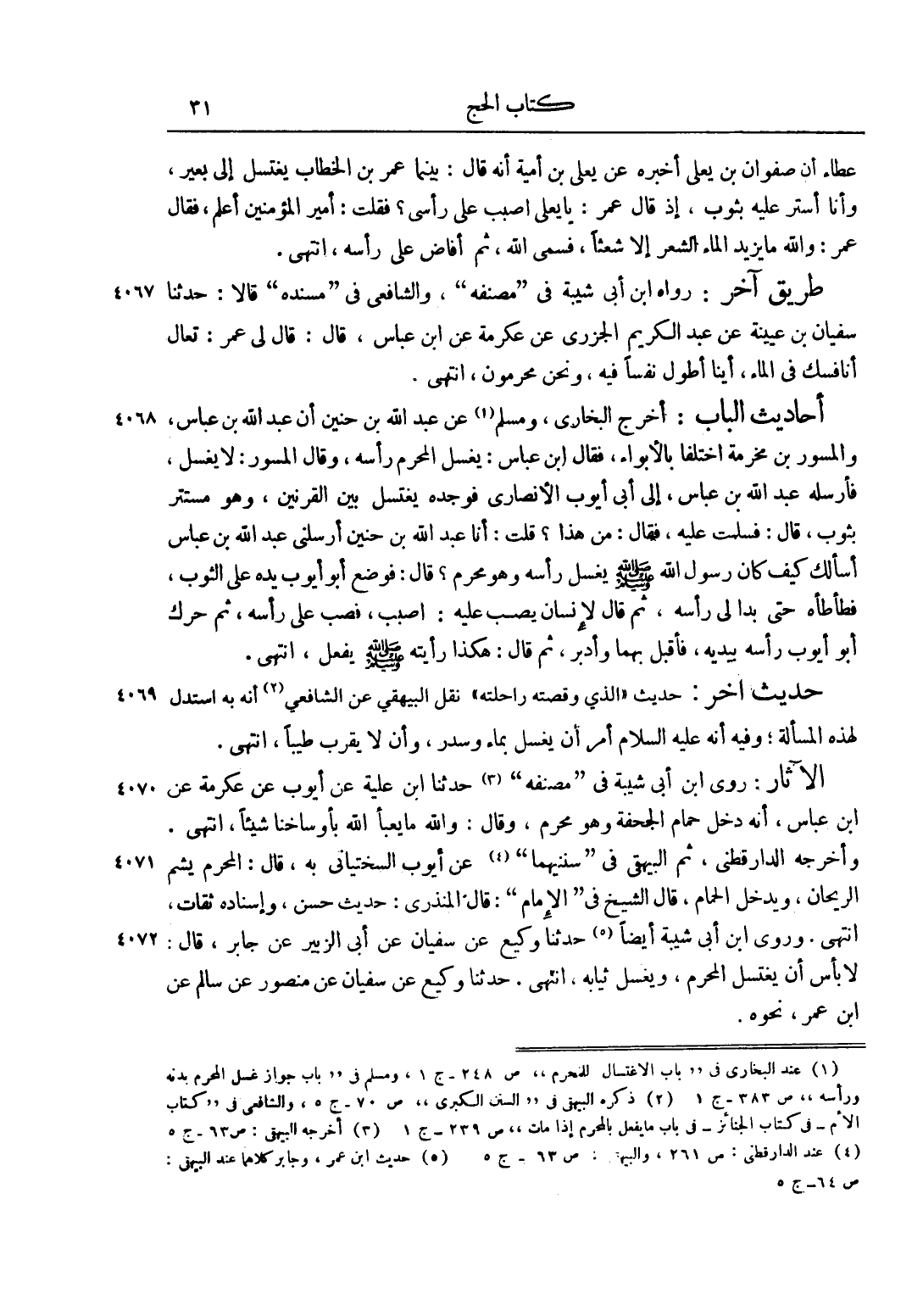 الْآثَارُ: رَوَى ابْنُ أَبِي شَيْبَةَ فِي "مُصَنَّفِهِ"3 حَدَّثَنَا ابْنُ عُلَيَّةَ عَنْ أَيُّوبَ عَنْ عِكْرِمَةَ عَنْ ابْنِ عَبَّاسٍ، أَنَّهُ دَخَلَ حَمَّامَ الْجُحْفَةِ وَهُوَ مُحْرِمٌ، وَقَالَ: وَاَللَّهِ مَا يَعْبَأُ اللَّهُ بِأَوْسَاخِنَا شَيْئًا، انْتَهَى. وَأَخْرَجَهُ الدَّارَقُطْنِيُّ، ثُمَّ الْبَيْهَقِيُّ فِي "سُنَنَيْهِمَا"4 عَنْ أَيُّوبَ السِّخْتِيَانِيُّ بِهِ، قَالَ: الْمُحْرِمُ يَشُمُّ الرَّيْحَانَ، وَيَدْخُلُ الْحَمَّامَ، قَالَ الشَّيْخُ فِي "الْإِمَامِ": قَالَ الْمُنْذِرِيُّ: حَدِيثٌ حَسَنٌ، وَأَسْنَادُهُ ثِقَاتٌ، انْتَهَى. وَرَوَى ابْنُ أَبِي شَيْبَةَ أَيْضًا 5 حَدَّثَنَا وَكِيعٌ عَنْ سُفْيَانَ عَنْ أَبِي الزُّبَيْرِ عَنْ جَابِرٍ، قَالَ: لَا بَأْسَ أَنْ يَغْتَسِلَ الْمُحْرِمُ، وَيَغْسِلَ ثِيَابَهُ، انْتَهَى. حَدَّثَنَا وَكِيعٌ عَنْ سُفْيَانَ عَنْ مَنْصُورٍ عَنْ سَالِمٍ عَنْ ابْنِ عُمَرَ، نَحْوَهُ.