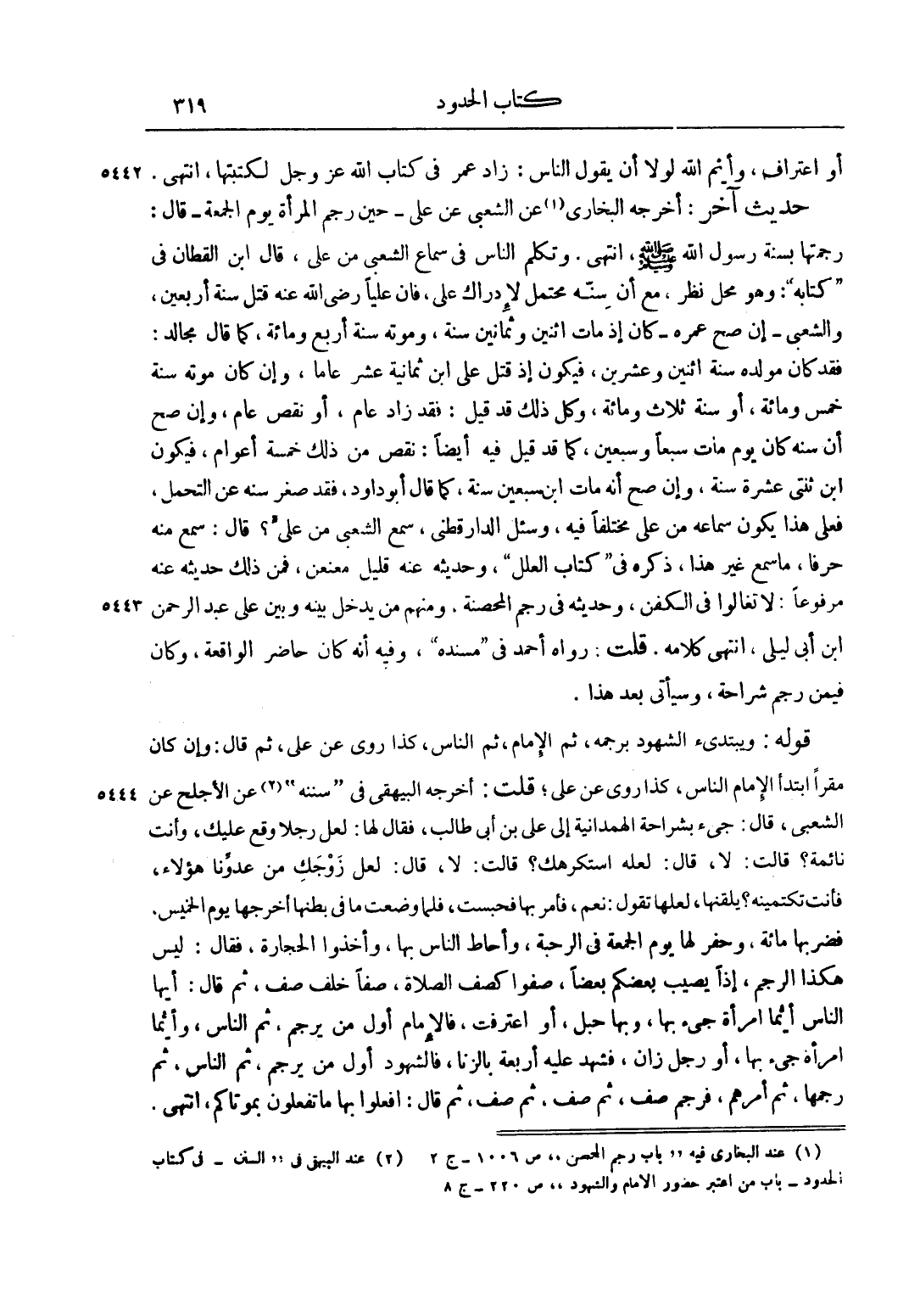 قَوْلُهُ: وَيَبْتَدِئُ الشُّهُودُ بِرَجْمِهِ، ثُمَّ الْإِمَامُ، ثُمَّ النَّاسُ، كَذَا رُوِيَ عَنْ عَلِيٍّ، ثُمَّ قَالَ: وَإِنْ كَانَ مُقِرًّا ابْتَدَأَ الْإِمَامُ النَّاسَ، كَذَا رُوِيَ عَنْ عَلِيٍّ، قُلْت: أَخْرَجَهُ الْبَيْهَقِيُّ فِي "سُنَنِهِ"2 عَنْ الْأَجْلَحِ عَنْ الشَّعْبِيِّ، قَالَ: جِيءَ بِشُرَاحَةَ الْهَمْدَانِيَّةِ إلَى عَلِيِّ بْنِ أَبِي طَالِبٍ، فَقَالَ لَهَا: لَعَلَّ رَجُلًا وَقَعَ عَلَيْك، وَأَنْتِ نَائِمَةٌ؟ قَالَتْ: لَا، قَالَ: لَعَلَّهُ اسْتَكْرَهَك؟ قَالَتْ: لَا، قَالَ: لَعَلَّ زَوْجَك مِنْ هَؤُلَاءِ، فَأَنْتِ تَكْتُمِينَهُ؟ يُلَقِّنُهَا، لَعَلَّهَا تَقُولُ: نَعَمْ، فَأَمَرَ بِهَا فَحُبِسَتْ، فَلَمَّا وَضَعَتْ مَا فِي بَطْنِهَا أَخْرَجَهَا يَوْمَ الْخَمِيسِ، فَضَرَبَهَا مِائَةً، وَحَفَرَ لَهَا يَوْمَ الْجُمُعَةِ فِي الرَّحْبَةِ، وَأَحَاطَ النَّاسُ بِهَا، وَأَخَذُوا الْحِجَارَةَ، فَقَالَ: لَيْسَ هَكَذَا الرَّجْمُ، إذًا يُصِيبُ بَعْضُكُمْ بَعْضًا، صُفُّوا كَصَفِّ الصَّلَاةِ، صَفًّا خَلْفَ صَفٍّ، ثُمَّ قَالَ: أَيُّهَا النَّاسُ أَيُّمَا امْرَأَةٍ جِيءَ بِهَا، وَبِهَا حَبَلٌ، أَوْ اعْتَرَفَتْ، فَالْإِمَامُ أَوَّلُ مَنْ يَرْجُمُ، ثُمَّ النَّاسُ، وَأَيُّمَا امْرَأَةٍ جِيءَ بِهَا، أَوْ رَجُلٍ زَانٍ، فَشَهِدَ عَلَيْهِ أَرْبَعَةٌ بِالزِّنَا، فَالشُّهُودُ أَوَّلُ مَنْ يَرْجُمُ، ثُمَّ النَّاسُ، ثُمَّ رَجَمَهَا، ثُمَّ أَمَرَهُمْ، فَرَجَمَ صَفٌّ، ثُمَّ صَفٌّ، ثُمَّ صَفٌّ، ثُمَّ قَالَ: افْعَلُوا بِهَا مَا تَفْعَلُونَ بِمَوْتَاكُمْ، انْتَهَى.