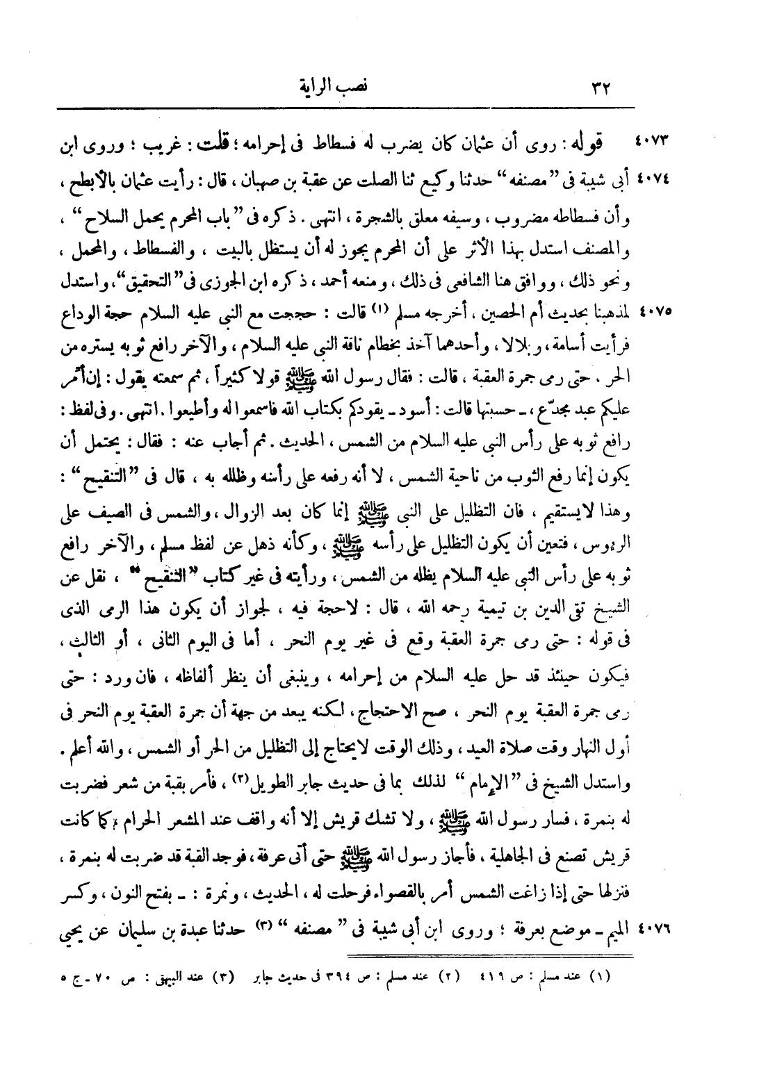 قَوْلُهُ: رُوِيَ أَنَّ عُثْمَانَ كَانَ يُضْرَبُ لَهُ فُسْطَاطٌ فِي إحْرَامِهِ، قُلْت: غَرِيبٌ، وَرَوَى ابْنُ أَبِي شَيْبَةَ فِي "مُصَنَّفِهِ" حَدَّثَنَا وَكِيعٌ ثَنَا الصَّلْتُ عَنْ عُقْبَةَ بْنِ صَهْبَانَ، قَالَ: رَأَيْت عُثْمَانَ بِالْأَبْطَحِ، وَأَنَّ فُسْطَاطَه مَضْرُوبٌ، وَسَيْفَهُ مُعَلَّقٌ بِالشَّجَرَةِ، انْتَهَى. ذَكَرَهُ فِي "بَابِ الْمُحْرِمِ يَحْمِلُ السِّلَاحَ"، وَالْمُصَنِّفُ اسْتَدَلَّ بِهَذَا الْأَثَرِ عَلَى أَنَّ الْمُحْرِمَ يَجُوزُ لَهُ أَنْ يَسْتَظِلَّ بِالْبَيْتِ، وَالْفُسْطَاطِ، وَالْمَحْمِلِ، وَنَحْوِ ذَلِكَ، وَوَافَقَ هُنَا الشَّافِعِيَّ فِي ذَلِكَ، وَمَنَعَهُ أَحْمَدُ، ذَكَرَهُ ابْنُ الْجَوْزِيِّ فِي "التَّحْقِيقِ"، وَاسْتَدَلَّ لِمَذْهَبِنَا بِحَدِيثِ أُمِّ الْحُصَيْنِ، أَخْرَجَهُ مُسْلِمٌ 1 قَالَتْ: حَجَجْت مَعَ النَّبِيِّ عليه السلام حَجَّةَ الْوَدَاعِ فَرَأَيْت أُسَامَةَ، وَبِلَالًا، وَأَحَدُهُمَا آخِذٌ بِخِطَامِ نَاقَةِ النَّبِيِّ عليه السلام، وَالْآخَرُ رَافِعٌ ثَوْبَهُ يَسْتُرُهُ مِنْ الْحَرِّ، حَتَّى رَمَى جَمْرَةَ الْعَقَبَةِ، قَالَتْ: فَقَالَ رَسُولُ اللَّهِ صَلَّى اللَّهُ عَلَيْهِ وَسَلَّمَ قَوْلًا كَثِيرًا، ثُمَّ سَمِعْته يَقُولُ: "إنْ أُمِّرَ عَلَيْكُمْ عَبْدٌ مُجَدَّعٌ، - حَسِبْتهَا قَالَتْ: أَسْوَدُ - يَقُودُكُمْ بِكِتَابِ اللَّهِ فَاسْمَعُوا لَهُ وَأَطِيعُوا"، انْتَهَى. وَفِي لَفْظٍ: رَافِعٌ ثَوْبَهُ عَلَى رَأْسِ النَّبِيِّ عليه السلام مِنْ الشَّمْسِ، الْحَدِيثَ. ثُمَّ أَجَابَ عَنْهُ: فَقَالَ: يُحْتَمَلُ أَنْ يَكُونَ إنَّمَا رَفَعَ الثَّوْبَ مِنْ نَاحِيَةِ الشَّمْسِ، لَا أَنَّهُ رَفَعَهُ عَلَى رأسنه وَظَلَّلَهُ بِهِ، قَالَ فِي "التَّنْقِيحِ": وَهَذَا لَا يَسْتَقِيمُ، فإن التظليل على رأسه صَلَّى اللَّهُ عَلَيْهِ وَسَلَّمَ، إنَّمَا كَانَ بَعْدَ الزَّوَالِ، وَالشَّمْسُ فِي الصَّيْفِ عَلَى الرؤوس، فَتَعَيَّنَ أَنْ يَكُونَ التَّظْلِيلُ عَلَى رَأْسِهِ صَلَّى اللَّهُ عَلَيْهِ وَسَلَّمَ، وَكَأَنَّهُ ذَهَلَ عَنْ لَفْظِ مُسْلِمٍ، وَالْآخَرُ رَافِعٌ ثَوْبَهُ عَلَى رَأْسِ النَّبِيِّ عليه السلام يُظِلُّهُ مِنْ الشَّمْسِ، وَرَأَيْته فِي غَيْرِ كِتَابِ "التَّنْقِيحِ"، نُقِلَ عَنْ الشَّيْخِ تَقِيِّ الدِّينِ بْنِ تَيْمِيَّةَ رحمه الله، قَالَ: لَا حُجَّةَ فِيهِ، لِجَوَازِ أَنْ يَكُونَ هَذَا الرَّمْيُ الَّذِي فِي قَوْلِهِ: حَتَّى رَمَى جَمْرَةَ الْعَقَبَةِ وَقَعَ فِي غَيْرِ يَوْمِ النَّحْرِ، أَمَّا فِي الْيَوْمِ الثَّانِي، أَوْ الثَّالِثِ، فَيَكُونُ حينثذ قَدْ حَلَّ عليه السلام مِنْ إحْرَامِهِ، وَيَنْبَغِي أَنْ يُنْظَرَ أَلْفَاظُهُ، فَإِنْ وَرَدَ: حَتَّى رَمَى جَمْرَةَ الْعَقَبَةِ يَوْمَ النَّحْرِ، صَحَّ الِاحْتِجَاجُ، لَكِنَّهُ يَبْعُدُ مِنْ جِهَةِ أَنَّ جَمْرَةَ الْعَقَبَةِ يَوْمَ النَّحْرِ فِي أَوَّلِ النَّهَارِ وَقْتَ صَلَاةِ الْعِيدِ، وَذَلِكَ الْوَقْتُ لَا يَحْتَاجُ إلَى التَّظْلِيلِ مِنْ الْحَرِّ أَوْ الشَّمْسِ، وَاَللَّهُ أَعْلَمُ. وَاسْتَدَلَّ الشَّيْخُ فِي "الْإِمَامِ" كَذَلِكَ بِمَا فِي حَدِيثِ جَابِرٍ الطَّوِيلِ، 2 فَأَمَرَ بِقُبَّةٍ مِنْ شَعَرٍ فَضُرِبَتْ لَهُ بِنَمِرَةَ، فَسَارَ رَسُولُ اللَّهِ صَلَّى اللَّهُ عَلَيْهِ وَسَلَّمَ، وَلَا تَشُكُّ قُرَيْشٌ إلَّا أَنَّهُ وَاقِفٌ عِنْدَ الْمَشْعَرِ الْحَرَامِ، كَمَا كَانَتْ قُرَيْشٌ تَصْنَعُ فِي الْجَاهِلِيَّةِ، فَأَجَازَ رَسُولُ اللَّهِ صَلَّى اللَّهُ عَلَيْهِ وَسَلَّمَ حَتَّى أَتَى عَرَفَةَ، فَوَجَدَ الْقُبَّةَ قَدْ ضُرِبَتْ لَهُ بِنَمِرَةَ، فَنَزَلَهَا حَتَّى إذَا زَاغَتْ الشَّمْسُ أَمَرَ بِالْقَصْوَاءِ فَرُحِلَتْ لَهُ، الْحَدِيثَ، وَنَمِرَةُ: - بِفَتْحِ النُّونِ، وَكَسْ