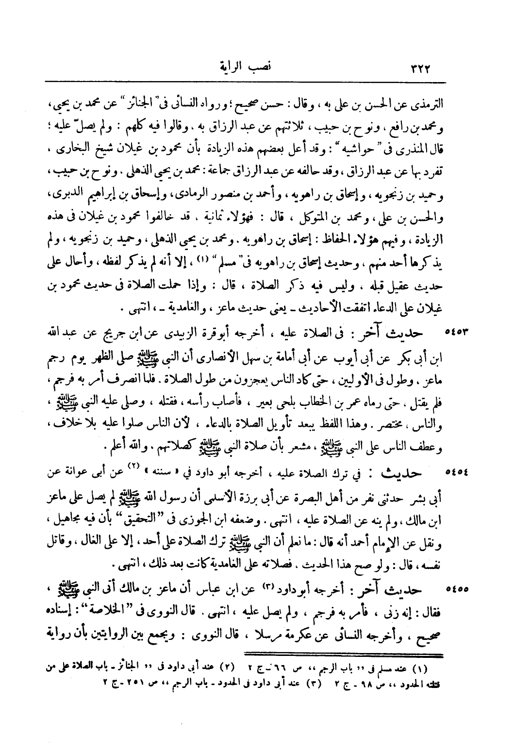 حَدِيثٌ آخَرُ: أَخْرَجَهُ أَبُو دَاوُد 3 عَنْ ابْنِ عَبَّاسٍ أَنَّ مَاعِزَ بْنَ مالك أتى رسول الله صَلَّى اللَّهُ عَلَيْهِ وَسَلَّمَ، فَقَالَ: إنَّهُ زَنَى، فَأَمَرَ بِهِ فَرُجِمَ، وَلَمْ يُصَلِّ عَلَيْهِ، انْتَهَى. قَالَ النَّوَوِيُّ فِي " الْخُلَاصَةِ ": إسْنَادُهُ صَحِيحٌ , وَأَخْرَجَهُ النَّسَائِيّ عَنْ عِكْرِمَةَ مُرْسَلًا , قَالَ النَّوَوِيُّ: وَيُجْمَعُ بَيْنَ الرِّوَايَتَيْنِ بِأَنَّ رِوَايَةَ
