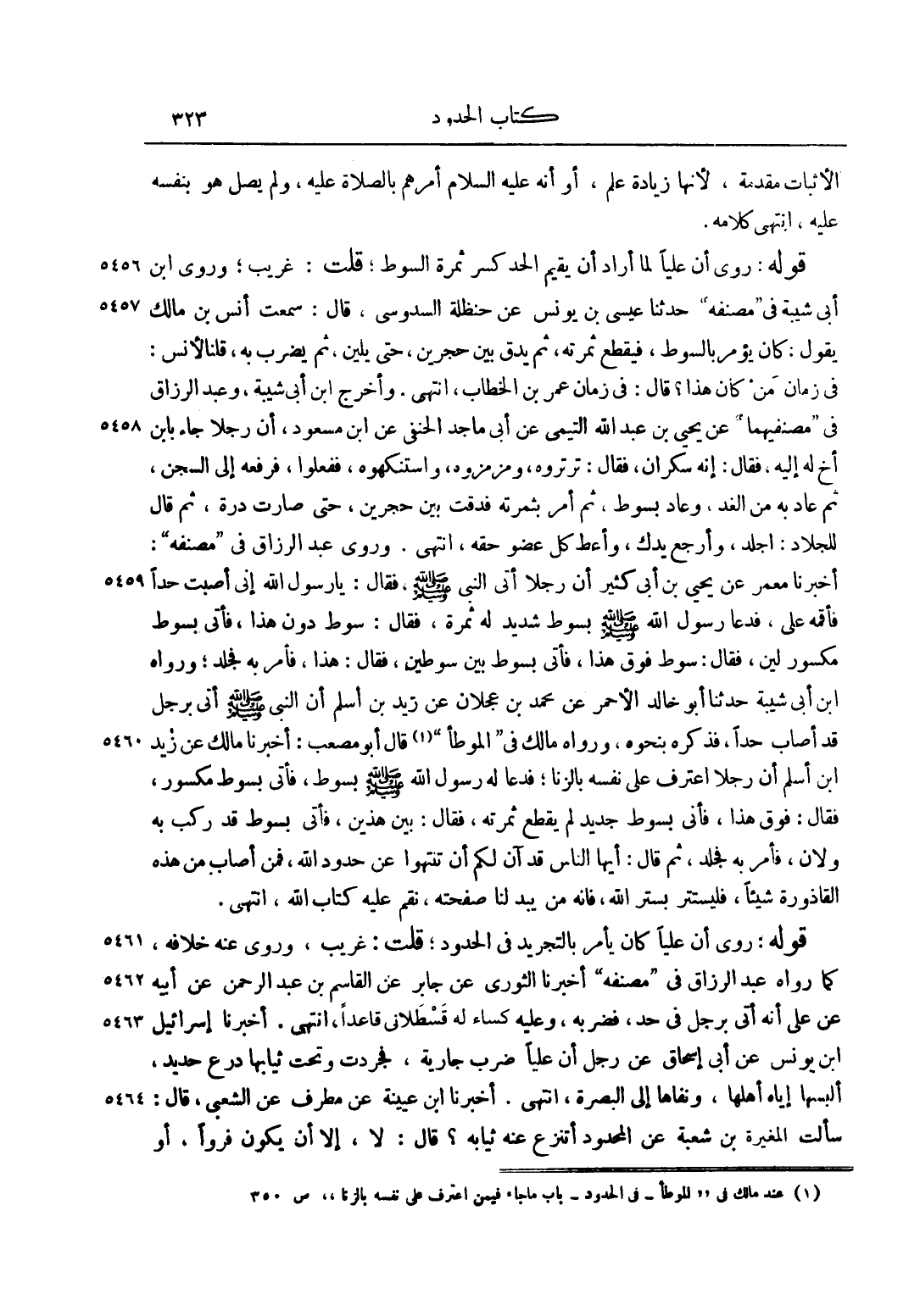 قَوْلُهُ: رُوِيَ أَنَّ عَلِيًّا لَمَّا أَرَادَ أَنْ يُقِيمَ الْحَدَّ كَسَرَ ثَمَرَةَ السَّوْطِ، قُلْت: غَرِيبٌ، وَرَوَى ابْنُ أَبِي شَيْبَةَ فِي "مُصَنَّفِهِ" حَدَّثَنَا عِيسَى بْنُ يُونُسَ عَنْ حَنْظَلَةَ السَّدُوسِيِّ، قَالَ: سَمِعْت أَنَسَ بْنَ مَالِكٍ يَقُولُ: كَانَ يُؤْمَرُ بِالسَّوْطِ، فَيُقْطَعُ ثَمَرَتُهُ، ثُمَّ يُدَقُّ بَيْنَ حَجَرَيْنِ، حَتَّى يَلِينَ، ثُمَّ يُضْرَبُ بِهِ، قُلْنَا لِأَنَسٍ: فِي زَمَانِ مَنْ كَانَ هَذَا؟ قَالَ: فِي زَمَانِ عُمَرَ بْنِ الْخَطَّابِ، انْتَهَى. وَأَخْرَجَ ابْنُ أَبِي شَيْبَةَ، وَعَبْدُ الرَّزَّاقِ فِي "مُصَنَّفَيْهِمَا" عَنْ يَحْيَى بْنِ عَبْدِ اللَّهِ التَّيْمِيِّ عَنْ أَبِي مَاجِدٍ الْحَنَفِيِّ عَنْ ابْنِ مَسْعُودٍ، أَنَّ رَجُلًا جَاءَ بِابْنِ أَخٍ لَهُ إلَيْهِ، فَقَالَ: إنَّهُ سَكْرَانُ، فَقَالَ: تَرْتِرُوهُ، وَمَزْمِزُوهُ، وَاسْتَنْكِهُوهُ، فَفَعَلُوا، فَرَفَعَهُ إلَى السِّجْنِ، ثُمَّ عَادَ بِهِ مِنْ الْغَدِ، وَعَادَ بِسَوْطٍ، ثُمَّ أَمَرَ بِثَمَرَتِهِ فَدُقَّتْ بَيْنَ حَجَرَيْنِ، حَتَّى صَارَتْ دُرَّةً، ثُمَّ قَالَ لِلْجَلَّادِ: اجْلِدْ، وَأَرْجِعْ يَدَك، وَأَعْطِ كُلَّ عُضْوٍ حَقَّهُ، انْتَهَى. وَرَوَى عَبْدُ الرَّزَّاقِ فِي "مُصَنَّفِهِ": أَخْبَرَنَا مَعْمَرٌ عَنْ يَحْيَى بْنِ أَبِي كَثِيرٍ أَنَّ رَجُلًا أَتَى النَّبِيَّ صَلَّى اللَّهُ عَلَيْهِ وَسَلَّمَ، فَقَالَ: يَا رَسُولَ اللَّهِ إنِّي أَصَبْت حَدًّا فَأَقِمْهُ عَلَيَّ، فَدَعَا رَسُولُ اللَّهِ صَلَّى اللَّهُ عَلَيْهِ وَسَلَّمَ بِسَوْطٍ شَدِيدٍ لَهُ ثَمَرَةٌ، فَقَالَ: "سَوْطٌ دُونَ هَذَا"، فَأُتِيَ بِسَوْطٍ مَكْسُورٍ لَيِّنٍ، فَقَالَ: "سَوْطٌ فَوْقَ هَذَا"، فَأُتِيَ بِسَوْطٍ بَيْنَ سَوْطَيْنِ، فَقَالَ: "هَذَا"، فَأَمَرَ بِهِ فَجُلِدَ، وَرَوَاهُ ابْنُ أَبِي شَيْبَةَ حَدَّثَنَا أَبُو خَالِدٍ الْأَحْمَرُ عَنْ مُحَمَّدِ بْنِ عَجْلَانَ عَنْ زَيْدِ بْنِ أَسْلَمَ أَنَّ النَّبِيَّ صَلَّى اللَّهُ عَلَيْهِ وَسَلَّمَ أُتِيَ بِرَجُلٍ قَدْ أَصَابَ حَدًّا، فَذَكَرَهُ بِنَحْوِهِ، وَرَوَاهُ مَالِكٌ فِي "الْمُوَطَّإِ" 1 قَالَ أَبُو مُصْعَبٍ: أَخْبَرَنَا مَالِكٌ عَنْ زَيْدِ بْنِ أَسْلَمَ أَنَّ رَجُلًا اعْتَرَفَ عَلَى نَفْسِهِ بِالزِّنَا، فَدَعَا لَهُ رَسُولُ اللَّهِ صَلَّى اللَّهُ عَلَيْهِ وَسَلَّمَ بِسَوْطٍ، فَأُتِيَ بِسَوْطٍ مَكْسُورٍ، فَقَالَ: "فَوْقَ هَذَا"، فَأُتِيَ بِسَوْطٍ جَدِيدٍ لَمْ يُقْطَعْ ثَمَرَتُهُ، فَقَالَ: "بَيْنَ هَذَيْنِ"، فَأُتِيَ بِسَوْطٍ قَدْ رُكِّبَ بِهِ وَلَانَ، فَأَمَرَ بِهِ فَجُلِدَ، ثُمَّ قَالَ: "أَيُّهَا النَّاسُ قَدْ آنَ لَكُمْ أَنْ تَنْتَهُوا عَنْ حُدُودِ اللَّهِ، فَمَنْ أَصَابَ مِنْ هَذِهِ الْقَاذُورَةِ شَيْئًا، فَلْيَسْتَتِرْ بِسَتْرِ اللَّهِ، فَإِنَّهُ مَنْ يُبْدِ لَنَا صَفْحَتَهُ، نُقِمْ عَلَيْهِ كِتَابَ اللَّهِ"، انْتَهَى.
