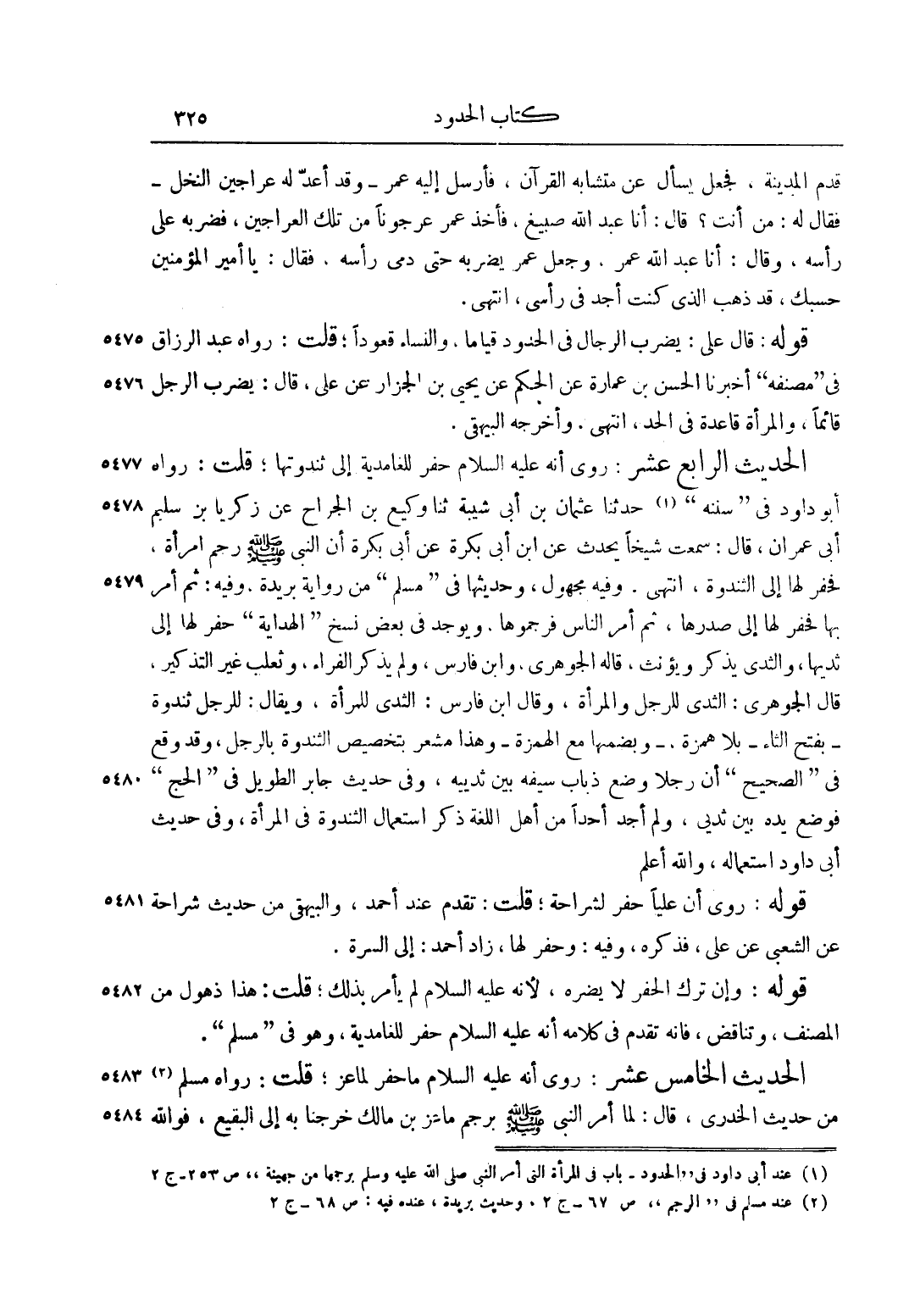 قَوْلُهُ: قَالَ عَلِيٌّ: يُضْرَبُ الرِّجَالُ فِي الْحُدُودِ قِيَامًا، وَالنِّسَاءُ قُعُودًا، قُلْت: رَوَاهُ عَبْدُ الرَّزَّاقِ فِي "مُصَنَّفِهِ" أَخْبَرَنَا الْحَسَنُ بْنُ عُمَارَةَ عَنْ الْحَكَمِ عَنْ يَحْيَى بْنِ الْجَزَّارِ عَنْ عَلِيٍّ، قَالَ: يُضْرَبُ الرَّجُلُ قَائِمًا، وَالْمَرْأَةُ قَاعِدَةً فِي الْحَدِّ، انْتَهَى. وَأَخْرَجَهُ الْبَيْهَقِيُّ.