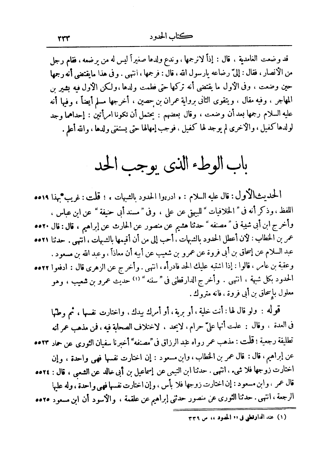 الْحَدِيثُ الْأَوَّلُ: قَالَ عليه السلام: "ادْرَءُوا الْحُدُودَ بِالشُّبُهَاتِ"، قُلْت: غَرِيبٌ بِهَذَا اللَّفْظِ، وَذَكَرَ أَنَّهُ فِي "الْخِلَافِيَّاتِ" لِلْبَيْهَقِيِّ عَنْ عَلِيٍّ، وَفِي "مُسْنَدِ أَبِي حَنِيفَةَ" عَنْ ابْنِ عَبَّاسٍ، وَأَخْرَجَ ابْنُ أَبِي شَيْبَةَ فِي "مُصَنَّفِهِ" حَدَّثَنَا هُشَيْمِ عَنْ مَنْصُورٍ عَنْ الْحَارِثِ عَنْ إبْرَاهِيمَ، قَالَ: قَالَ عُمَرُ بْنُ الْخَطَّابِ: لَأَنْ أُعَطِّلَ الْحُدُودَ بِالشُّبُهَاتِ، أَحَبُّ إلَيَّ مِنْ أَنْ أُقِيمَهَا بِالشُّبُهَاتِ، انْتَهَى. حَدَّثَنَا عَبْدُ السَّلَامِ عَنْ إسْحَاقَ بْنِ أَبِي فَرْوَةَ عَنْ عَمْرِو بْنِ شُعَيْبٍ عَنْ أَبِيهِ أَنَّ مُعَاذًا، وَعَبْدَ اللَّهِ بْنَ مَسْعُودٍ، وَعُقْبَةَ بْنَ عَامِرٍ، قَالُوا: إذَا اشْتَبَهَ عَلَيْك الْحَدُّ فَادْرَأْهُ، انْتَهَى. وَأَخْرَجَ عَنْ الزُّهْرِيِّ قَالَ: ادْفَعُوا الْحُدُودَ بِكُلِّ شُبْهَةٍ، انْتَهَى. وَأَخْرَجَ الدَّارَقُطْنِيُّ فِي "سُنَنِهِ"1 حَدِيثَ عَمْرِو بْنِ شُعَيْبٍ، وَهُوَ مَعْلُولٌ بِإِسْحَاقِ بْنِ أَبِي فَرْوَةَ، فَإِنَّهُ مَتْرُوكٌ.