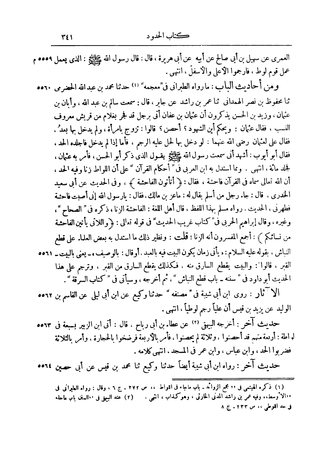 وَمِنْ أَحَادِيثِ الْبَابِ: مَا رَوَاهُ الطَّبَرَانِيُّ فِي "مُعْجَمِهِ"1 حَدَّثَنَا مُحَمَّدُ بْنُ عَبْدِ اللَّهِ الْحَضْرَمِيُّ ثَنَا مَحْفُوظُ بْنُ نصر الهمذاني ثَنَا عُمَرُ بْنُ رَاشِدٍ عَنْ جَابِرٍ، قَالَ: سَمِعْت سَالِمَ بْنَ عَبْدِ اللَّهِ، وَأَبَانَ بْنَ عُثْمَانَ، وَزَيْدَ بْنَ الْحَسَنِ يَذْكُرُونَ أَنَّ عُثْمَانَ بْنَ عَفَّانَ أُتِيَ بِرَجُلٍ قَدْ فَجَرَ بِغُلَامٍ مِنْ قُرَيْشٍ مَعْرُوفِ النَّسَبِ، فقال عثمان: ويحكم أيها الشُّهُودُ؟ أَحْصَنَ؟ قَالُوا: تَزَوَّجَ بِامْرَأَةٍ، وَلَمْ يَدْخُلْ بِهَا بَعْدُ، فَقَالَ عَلِيٌّ لِعُثْمَانَ رضي الله عنهما: لَوْ دَخَلَ بِهَا لَحَلَّ عَلَيْهِ الرَّجْمُ، فَأَمَّا إذَا لَمْ يَدْخُلْ فَاجْلِدْهُ الْحَدَّ، فَقَالَ أَبُو أَيُّوبَ: أَشْهَدُ أَنِّي سَمِعْت رَسُولَ اللَّهِ صَلَّى اللَّهُ عَلَيْهِ وَسَلَّمَ يَقُولُ: الَّذِي ذَكَرَ أَبُو الْحَسَنِ، فَأَمَرَ بِهِ عُثْمَانُ، فَجُلِدَ مِائَةً، انْتَهَى. وَمِمَّا اسْتَدَلَّ بِهِ ابْنُ الْعَرَبِيِّ فِي "أَحْكَامِ الْقُرْآنِ" عَلَى أَنَّ اللِّوَاطَ زِنًا وَفِيهِ الْحَدُّ، أَنَّ اللَّهَ تَعَالَى سَمَّاهُ فِي الْقُرْآنِ فَاحِشَةً، فَقَالَ: {أَتَأْتُونَ الْفَاحِشَةَ} ، وَفِي الْحَدِيثِ عَنْ أَبِي سَعِيدٍ الْخُدْرِيِّ، قَالَ: جَاءَ رَجُلٌ مِنْ أَسْلَمَ يُقَالُ لَهُ: مَاعِزُ بْنُ مَالِكٍ، فَقَالَ: يَا رَسُولَ اللَّهِ إنِّي أَصَبْت فَاحِشَةً فَطَهِّرْنِي، الْحَدِيثَ. رَوَاهُ مُسْلِمٌ بِهَذَا اللَّفْظِ، قَالَ أَهْلُ اللُّغَةِ: الْفَاحِشَةُ الزِّنَا، ذَكَرَهُ فِي "الصِّحَاحِ"، وَغَيْرِهِ، وَقَالَ إبْرَاهِيمُ الْحَرْبِيُّ فِي "كِتَابِ غَرِيبِ الْحَدِيثِ" فِي قوله تعالى: {وَاَللَّاتِي يَأْتِينَ الْفَاحِشَةَ مِنْ نِسَائِكُمْ} : أَجْمَعَ المفسرون أنها الزِّنَا، قُلْت: وَنَظِيرُ ذَلِكَ مَا اسْتَدَلَّ بِهِ بَعْضُ الْعُلَمَاءِ عَلَى قَطْعِ النَّبَّاشِ، بِقَوْلِهِ عليه السلام: "يَأْتِي زَمَانٌ يَكُونُ الْبَيْتُ فِيهِ بِالْعَبْدِ"، أَوْ قَالَ: "بِالْوَصِيفِ" - يَعْنِي بِالْبَيْتِ - الْقَبْرَ، قَالُوا: وَالْبَيْتُ يُقْطَعُ السَّارِقُ مِنْهُ، فَكَذَلِكَ يُقْطَعُ السَّارِقُ مِنْ الْقَبْرِ، وَتَرْجَمَ عَلَى هَذَا الْحَدِيثِ أَبُو دَاوُد فِي "سُنَنِهِ - بَابَ قَطْعِ النَّبَّاشِ"، ثُمَّ أَخْرَجَهُ، وَسَيَأْتِي فِي "كِتَابِ السَّرِقَةِ".