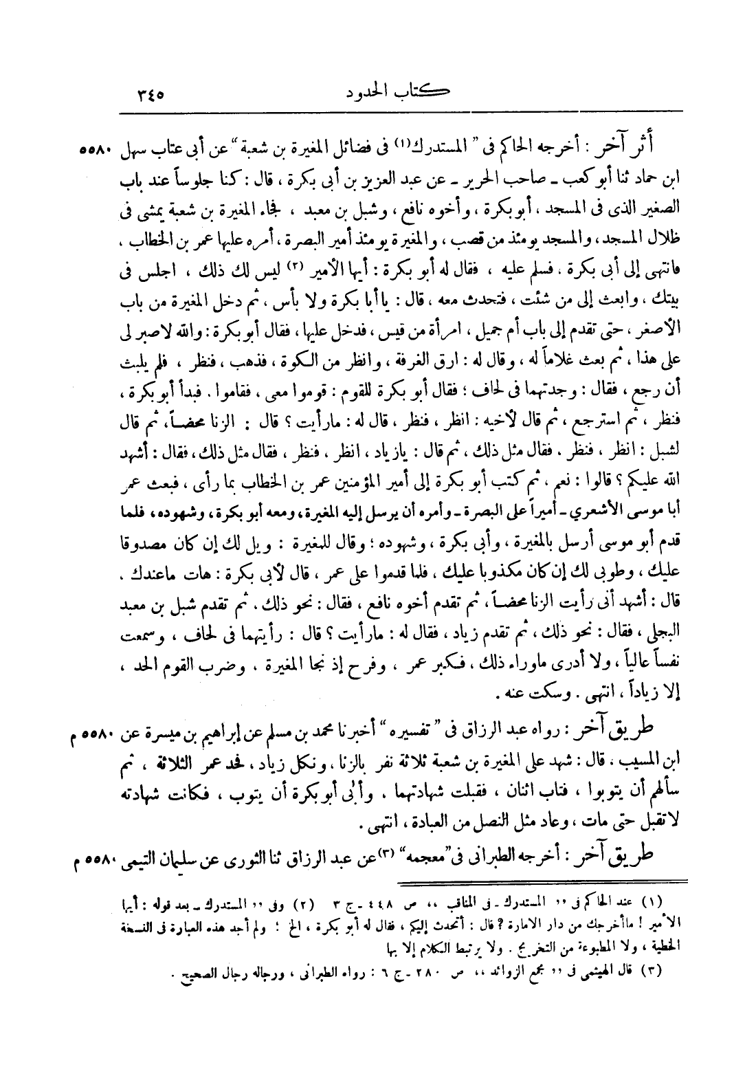 أَثَرٌ آخَرُ: أَخْرَجَهُ الْحَاكِمُ فِي "الْمُسْتَدْرَكِ 1 فِي فَضَائِلِ الْمُغِيرَةِ بْنِ شُعْبَةَ" عَنْ أَبِي عَتَّابٍ سَهْلِ بْنِ حَمَّادٍ ثَنَا أَبُو كَعْبٍ - صَاحِبُ الْحَرِيرِ - عَنْ عَبْدِ الْعَزِيزِ بْنِ أَبِي بَكْرَةَ، قَالَ: كُنَّا جُلُوسًا عِنْدَ بَابِ الصَّغِيرِ الَّذِي فِي الْمَسْجِدِ، أَبُو بَكْرَةَ، وَأَخُوهُ نَافِعٌ، وَشِبْلُ بْنُ مَعْبَدٍ، فَجَاءَ الْمُغِيرَةُ بْنُ شُعْبَةَ يَمْشِي فِي ظِلَالِ الْمَسْجِدِ، وَالْمَسْجِدُ يَوْمِئِذٍ مِنْ قَصَبٍ، وَالْمُغِيرَةُ يَوْمَئِذٍ أَمِيرُ الْبَصْرَةِ، أَمَّرَهُ عَلَيْهَا عُمَرُ بْنُ الْخَطَّابِ، فَانْتَهَى إلَى أَبِي بَكْرَةَ، فَسَلَّمَ عَلَيْهِ، فَقَالَ لَهُ أَبُو بَكْرَةَ: أَيُّهَا الْأَمِيرُ 2 لَيْسَ لَك ذَلِكَ، اجْلِسْ فِي بَيْتِك، وَابْعَثْ إلَيَّ مَنْ شِئْت، فَتَحَدَّثَ مَعَهُ، قَالَ: يَا أَبَا بَكْرَةَ وَلَا بَأْسَ، ثُمَّ دَخَلَ الْمُغِيرَةُ مِنْ بَابِ الْأَصْغَرِ، حَتَّى تَقَدَّمَ إلَى بَابِ أُمِّ جَمِيلٍ، امْرَأَةٍ مِنْ قَيْسٍ فَدَخَلَ عَلَيْهَا، فَقَالَ أَبُو بَكْرَةَ: وَاَللَّهِ لَا صَبْرَ لِي عَلَى هَذَا، ثُمَّ بَعَثَ غُلَامًا لَهُ، وَقَالَ لَهُ: ارْقَ الْغَرْفَةَ، وَانْظُرْ مِنْ الْكُوَّةِ، فَذَهَبَ، فَنَظَرَ، فَلَمْ يَلْبَثْ أَنْ رَجَعَ، فَقَالَ: وَجَدْتهمَا فِي لِحَافٍ، فَقَالَ أَبُو بَكْرَةَ لِلْقَوْمِ: قُومُوا مَعِي، فَقَامُوا، فَبَدَأَ أَبُو بَكْرَةَ، فَنَظَرَ، ثُمَّ اسْتَرْجَعَ، ثُمَّ قَالَ لِأَخِيهِ: اُنْظُرْ، فَنَظَرَ، قَالَ لَهُ: مَا رَأَيْت؟ قَالَ: الزِّنَا مُحْصَنًا، ثُمَّ قَالَ لِشِبْلٍ: اُنْظُرْ، فَنَظَرَ، فَقَالَ مِثْلَ ذَلِكَ، ثُمَّ قَالَ: يَا زِيَادُ، اُنْظُرْ، فَنَظَرَ، فَقَالَ مِثْلَ ذَلِكَ، فَقَالَ: أُشْهِدُ اللَّهَ عَلَيْكُمْ؟ قَالُوا: نَعَمْ، ثُمَّ كَتَبَ أَبُو بَكْرَةَ إلَى أَمِيرِ الْمُؤْمِنِينَ عُمَرَ بْنِ الْخَطَّابِ بِمَا رَأَى، فَبَعَثَ عُمَرُ أَبَا مُوسَى الْأَشْعَرِيَّ - أَمِيرًا عَلَى الْبَصْرَةِ - أَنْ يُرْسِلَ إلَيْهِ الْمُغِيرَةَ، وَمَعَهُ أَبُو بَكْرَةَ، وَشُهُودُهُ، فَلَمَّا قَدِمَ أَبُو مُوسَى أَرْسَلَ بِالْمُغِيرَةِ، وَأَبِي بَكْرَةَ، وَشُهُودِهِ، وَقَالَ لِلْمُغِيرَةِ: وَيْلٌ لَك إنْ كَانَ مَصْدُوقًا عَلَيْك، وَطُوبَى لَك إنْ كَانَ مَكْذُوبًا عَلَيْك، فَلَمَّا قَدِمُوا عَلَى عُمَرَ، قَالَ لِأَبِي بَكْرَةَ: هَاتِ مَا عِنْدَك، قَالَ: أَشْهَدُ أَنِّي رَأَيْت الزِّنَا مُحْصَنًا، ثُمَّ تَقَدَّمَ أَخُوهُ نَافِعٌ، فَقَالَ: نَحْوَ ذَلِكَ، ثُمَّ تَقَدَّمَ شِبْلُ بْنُ مَعْبَدٍ النجلي، فَقَالَ: نَحْوَ ذَلِكَ، ثُمَّ تَقَدَّمَ زِيَادٌ، فَقَالَ لَهُ: مَا رَأَيْت؟ قَالَ: رَأَيْتهمَا فِي لِحَافٍ، وَسَمِعْت نَفَسًا عَالِيًا، وَلَا أَدْرِي مَا وَرَاءَ ذَلِكَ، فَكَبَّرَ عُمَرُ، وَفَرِحَ إذْ نَجَا الْمُغِيرَةُ، وَضَرَبَ الْقَوْمَ الْحَدَّ، إلَّا زِيَادًا، انْتَهَى. وَسَكَتَ عَنْهُ.