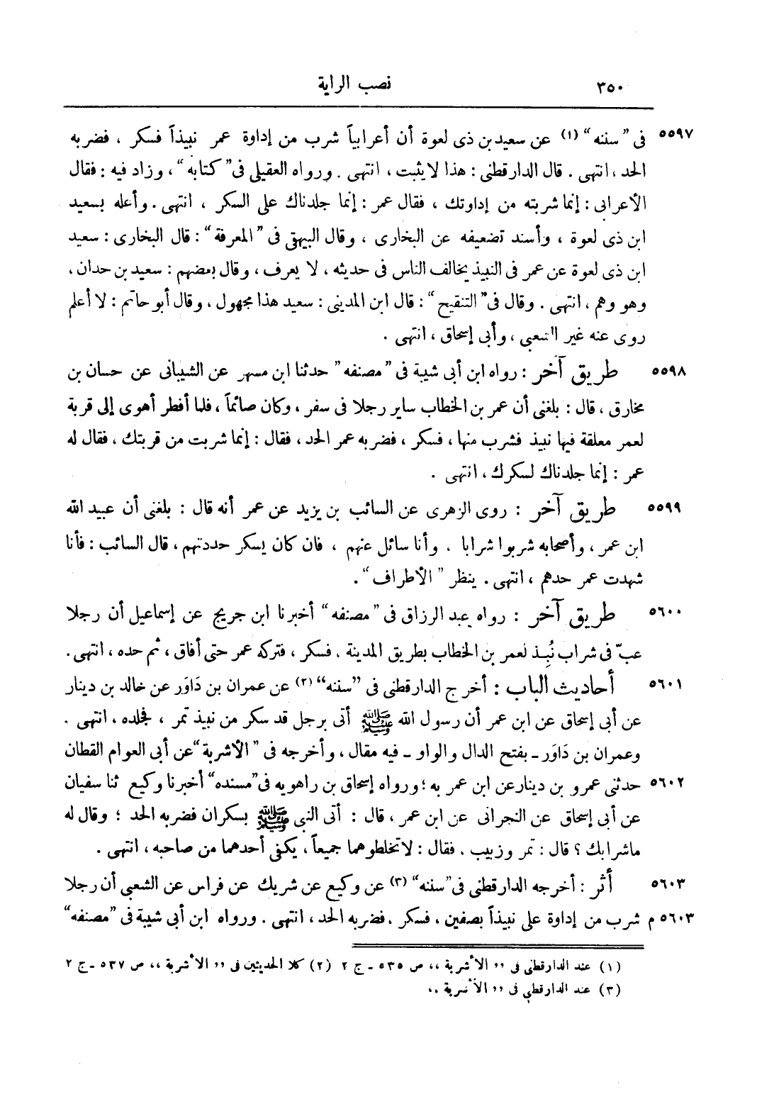 فِي "سُنَنِهِ" 1 عَنْ سَعِيدِ بْنِ ذِي لَعْوَةَ أَنَّ أَعْرَابِيًّا شَرِبَ مِنْ إدَاوَةِ عُمَرَ نَبِيذًا فَسَكِرَ، فَضَرَبَهُ الْحَدَّ، انْتَهَى. قَالَ الدَّارَقُطْنِيُّ: هَذَا لَا يَثْبُتُ، انْتَهَى. وَرَوَاهُ الْعُقَيْلِيُّ فِي "كِتَابِهِ"، وَزَادَ فِيهِ: فَقَالَ الْأَعْرَابِيُّ: إنَّمَا شَرِبْتُهُ مِنْ إدَاوَتِك، فَقَالَ عُمَرُ: إنَّمَا جَلَدْنَاك عَلَى السُّكْرِ، انْتَهَى. وَأَعَلَّهُ بِسَعِيدِ بْنِ ذِي لَعْوَةَ، وَأَسْنَدَ تَضْعِيفَهُ عَنْ الْبُخَارِيِّ، وَقَالَ الْبَيْهَقِيُّ فِي "الْمَعْرِفَةِ": قَالَ الْبُخَارِيُّ: سَعِيدُ بْنُ ذِي لَعْوَةَ عَنْ عُمَرَ فِي النَّبِيذِ يُخَالِفُ النَّاسَ فِي حَدِيثِهِ، لَا يُعْرَفُ، وَقَالَ بَعْضُهُمْ: سَعِيدُ بْنُ حَدَّانَ، وَهُوَ وَهْمٌ، انْتَهَى. وَقَالَ فِي "التَّنْقِيحِ": قَالَ ابْنُ الْمَدِينِيِّ: سَعِيدٌ هَذَا مَجْهُولٌ، وَقَالَ أَبُو حَاتِمٍ: لَا أَعْلَمُ رَوَى عَنْهُ غَيْرَ الشَّعْبِيِّ، وَأَبِي إسْحَاقَ، انْتَهَى.