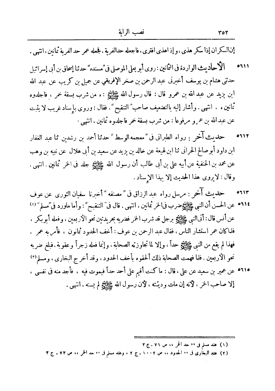 الْأَحَادِيثُ الْوَارِدَةُ فِي الثَّمَانِينَ: رَوَى أَبُو يَعْلَى الْمَوْصِلِيُّ فِي "مُسْنَدِهِ" حَدَّثَنَا إسْحَاقُ بْنُ أَبِي إسْرَائِيلَ حَدَّثَنِي هِشَامُ بْنُ يُوسُفَ أَخْبَرَنِي عَبْدُ الرَّحْمَنِ بْنُ صَخْرٍ الْأَفْرِيقِيُّ عَنْ جَمِيلِ بْنِ كُرَيْبٌ عَنْ عَبْدِ اللَّهِ بْنِ يَزِيدَ عَنْ عَبْدِ اللَّهِ بْنِ عَمْرٍو قَالَ: قَالَ رَسُولُ اللَّهِ صَلَّى اللَّهُ عَلَيْهِ وَسَلَّمَ: "مَنْ شَرِبَ بَسْقَةَ خَمْرٍ، فَاجْلِدُوهُ ثَمَانِينَ"، انْتَهَى. وَأَشَارَ إلَيْهِ بِالتَّضْعِيفِ صَاحِبُ "التَّنْقِيحِ"، فَقَالَ: وَرُوِيَ بِإِسْنَادٍ غَرِيبٍ لَا يَثْبُتُ عَنْ عَبْدِ اللَّهِ بْنِ عَمْرٍو مَرْفُوعًا: مَنْ شَرِبَ بَسْقَةَ خَمْرٍ فَاجْلِدُوهُ ثَمَانِينَ، انْتَهَى.