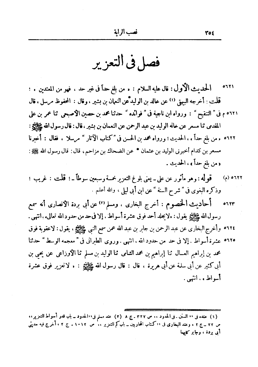 أَحَادِيثُ الْخُصُومِ: أَخْرَجَ الْبُخَارِيُّ، وَمُسْلِمٌ 2 عَنْ أَبِي بُرْدَةَ الْأَنْصَارِيِّ أَنَّهُ سَمِعَ رَسُولَ اللَّهِ صَلَّى اللَّهُ عَلَيْهِ وَسَلَّمَ يَقُولُ: " لَا يُجْلَدُ أَحَدٌ فَوْقَ عَشَرَةِ أَسْوَاطٍ، إلَّا فِي حَدٍّ مِنْ حُدُودِ اللَّهِ تَعَالَى"، انْتَهَى. وَأَخْرَجَ الْبُخَارِيُّ عَنْ عَبْدِ الرَّحْمَنِ بْنِ جَابِرِ بْنِ عَبْدِ اللَّهِ عَمَّنْ سَمِعَ النَّبِيَّ صَلَّى اللَّهُ عَلَيْهِ وَسَلَّمَ، يَقُولُ: "لَا عُقُوبَةَ فَوْقَ عَشَرَةِ أَسْوَاطٍ، إلَّا فِي حَدٍّ مِنْ حُدُودِ اللَّهِ"، انْتَهَى. وَرَوَى الطَّبَرَانِيُّ فِي "مُعْجَمِهِ الْوَسَطِ" حَدَّثَنَا مُحَمَّدُ بْنُ إبْرَاهِيمَ الْعَسَّالُ ثَنَا إبْرَاهِيمُ بْنُ مُحَمَّدٍ الشَّامِيُّ ثَنَا الْوَلِيدُ بْنُ مُسْلِمٍ ثَنَا الْأَوْزَاعِيُّ عَنْ يَحْيَى بْن أَبِي كَثِيرٍ عَنْ أَبِي سَلَمَةَ عَنْ أَبِي هُرَيْرَةَ، قَالَ: قَالَ رَسُولُ اللَّهِ صَلَّى اللَّهُ عَلَيْهِ وَسَلَّمَ: "لَا تَعْزِيرَ فَوْقَ عَشَرَةِ أَسْوَاطٍ"، انْتَهَى.