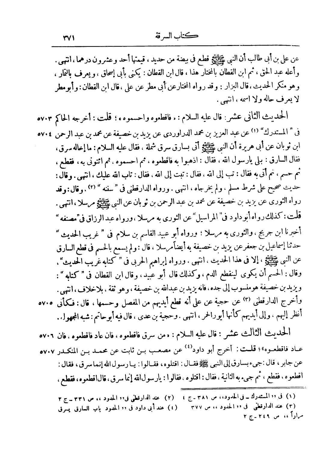 الْحَدِيثُ الثَّانِي عَشَرَ: قَالَ عليه السلام: "فَاقْطَعُوهُ وَاحْسِمُوهُ"، قُلْت: أَخْرَجَهُ الْحَاكِمُ فِي "الْمُسْتَدْرَكِ" 1 عَنْ عَبْدِ الْعَزِيزِ بْنِ مُحَمَّدٍ الدَّرَاوَرْدِيِّ عَنْ يَزِيدَ بْنِ خُصَيْفَةَ عَنْ مُحَمَّدِ بْنِ عَبْدِ الرَّحْمَنِ بْنِ ثَوْبَانَ عَنْ أَبِي هُرَيْرَةَ أَنَّ النَّبِيَّ صَلَّى اللَّهُ عَلَيْهِ وَسَلَّمَ أُتِيَ بِسَارِقٍ سَرَقَ شَمْلَةً، فَقَالَ عليه السلام: "مَا أَخَالُهُ سَرَقَ"، فَقَالَ السَّارِقُ: بَلَى يَا رَسُولَ اللَّهِ، فَقَالَ: " اذْهَبُوا بِهِ فَاقْطَعُوهُ، ثُمَّ احْسِمُوهُ، ثُمَّ ائْتُونِي بِهِ" فَقُطِعَ، ثُمَّ حُسِمَ، ثُمَّ أُتِيَ بِهِ فَقَالَ: "تُبْ إلَى اللَّهِ"، فَقَالَ: تُبْت إلَى اللَّهِ، فَقَالَ: "تَابَ اللَّهُ عَلَيْك"، انْتَهَى. وَقَالَ: حَدِيثٌ صَحِيحٌ عَلَى شَرْطِ مُسْلِمٍ، وَلَمْ يُخَرِّجَاهُ، انْتَهَى. وَرَوَاهُ الدَّارَقُطْنِيُّ فِي "سُنَنِهِ"2، وَقَالَ: وَقَدْ رَوَاهُ الثَّوْرِيُّ عَنْ يَزِيدَ بْنِ خُصَيْفَةَ عَنْ مُحَمَّدِ بْنِ عَبْدِ الرَّحْمَنِ بْنِ ثَوْبَانَ عَنْ النَّبِيِّ صَلَّى اللَّهُ عَلَيْهِ وَسَلَّمَ مُرْسَلًا، انْتَهَى. قُلْت: كَذَلِكَ رَوَاهُ أَبُو دَاوُد فِي "الْمَرَاسِيلِ" عَنْ الثَّوْرِيِّ بِهِ مُرْسَلًا، وَرَوَاهُ عَبْدُ الرَّزَّاقِ فِي "مُصَنَّفِهِ" أَخْبَرَنَا ابْنُ جُرَيْجٍ، وَالثَّوْرِيُّ بِهِ مُرْسَلًا، وَرَوَاهُ أَبُو عُبَيْدٍ الْقَاسِمُ بْنُ سَلَّامٍ فِي "غَرِيبِ الْحَدِيثِ" حَدَّثَنَا إسْمَاعِيلُ بْنُ جَعْفَرٍ عَنْ يَزِيدَ بْنِ خُصَيْفَةَ بِهِ أَيْضًا مُرْسَلًا، قَالَ: وَلَمْ يُسْمَعْ بِالْحَسْمِ فِي قَطْعِ السَّارِقِ عَنْ النَّبِيِّ صَلَّى اللَّهُ عَلَيْهِ وَسَلَّمَ، إلَّا فِي هَذَا الْحَدِيثِ، انْتَهَى. وَرَوَاهُ إبْرَاهِيمُ الْحَرْبِيُّ فِي "كِتَابِهِ غَرِيبِ الْحَدِيثِ"، وَقَالَ: الْحَسْمُ أَنْ يَكْوِيَ لِيَنْقَطِعَ الدَّمُ، وَكَذَلِكَ قَالَ أَبُو عُبَيْدٍ، وَقَالَ ابْنُ الْقَطَّانِ فِي "كِتَابِهِ": وَيَزِيدُ بْنُ خُصَيْفَةَ هُوَ مَنْسُوبٌ إلَى جَدِّهِ، فَإِنَّهُ يَزِيدُ بْنُ عَبْدِ اللَّهِ بن خصيفة، وهو ثِقَةٌ، بِلَا خِلَافٍ، انْتَهَى. وَأَخْرَجَ الدَّارَقُطْنِيُّ 3 عَنْ حُجِّيَّةَ عَنْ عَلِيٍّ أَنَّهُ قَطَعَ أَيْدِيَهُمْ مِنْ الْمَفْصِلِ وَحَسَمَهَا، قَالَ: فَكَأَنِّي أَنْظُرُ إلَيْهِمْ، وَإِلَى أَيْدِيهِمْ كَأَنَّهَا أُيُورُ الْحُمُرِ، انْتَهَى. وَحُجِّيَّةُ بْنُ عَدِيٍّ، قَالَ فِيهِ أَبُو حَاتِمٍ: شِبْهُ الْمَجْهُولِ.