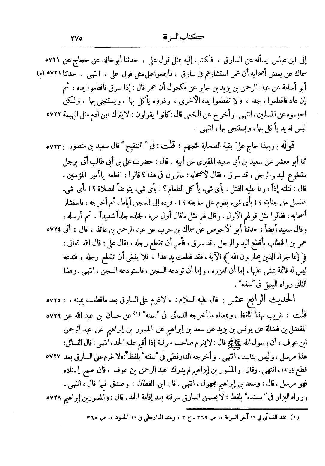 قَوْلُهُ: وَبِهَذَا حَاجَّ عَلِيٌّ بَقِيَّةَ الصَّحَابَةِ فَحَجَّهُمْ، قُلْت: فِي "التَّنْقِيحِ" قَالَ سَعِيدُ بْنُ مَنْصُورٍ: ثَنَا أَبُو مَعْشَرٍ عَنْ سَعِيدِ بْنِ أَبِي سَعِيدٍ الْمَقْبُرِيِّ عَنْ أَبِيهِ، قَالَ: حَضَرْت عَلِيَّ بْنَ أَبِي طَالِبٍ أُتِيَ بِرَجُلٍ مَقْطُوعَ الْيَدِ وَالرِّجْلِ، قَدْ سَرَقَ، فَقَالَ لِأَصْحَابِهِ: مَا تَرَوْنَ فِي هَذَا؟ قَالُوا: اقْطَعْهُ يَا أَمِيرَ الْمُؤْمِنِينَ، قَالَ: قَتَلْتُهُ إذًا، وَمَا عَلَيْهِ الْقَتْلُ، بِأَيِّ شَيْءٍ يَأْكُلُ الطَّعَامَ؟! بِأَيِّ شَيْءٍ يَتَوَضَّأُ لِلصَّلَاةِ؟! بِأَيِّ شَيْءٍ يَغْتَسِلُ مِنْ جَنَابَتِهِ؟! بِأَيِّ شَيْءٍ يَقُومُ عَلَى حَاجَتِهِ؟!، فَرَدَّهُ إلَى السِّجْنِ أَيَّامًا، ثُمَّ أَخْرَجَهُ، فَاسْتَشَارَ أَصْحَابَهُ، فَقَالُوا مِثْلَ قَوْلِهِمْ الْأَوَّلِ، وَقَالَ لَهُمْ مِثْلَ مَا قَالَ أَوَّلَ مَرَّةٍ، فَجَلَدَهُ جَلْدًا شَدِيدًا، ثُمَّ أَرْسَلَهُ، وَقَالَ سَعِيدٌ أَيْضًا: حَدَّثَنَا أَبُو الْأَحْوَصِ عَنْ سِمَاكِ بْنِ حَرْبٍ عَنْ عَبْدِ الرَّحْمَنِ بْنِ عَائِذٍ، قَالَ: أُتِيَ عُمَرُ بْنُ الْخَطَّابِ بِأَقْطَعِ الْيَدِ وَالرِّجْلِ، قَدْ سَرَقَ، فَأَمَرَ أَنْ تُقْطَعَ رِجْلُهُ، فَقَالَ عَلِيٌّ: قَالَ اللَّهُ تَعَالَى: {إنَّمَا جَزَاءُ الَّذِينَ يُحَارِبُونَ اللَّهَ} الْآيَةَ، فَقَدْ قَطَعْتَ يَدَ هَذَا، فَلَا يَنْبَغِي أَنْ تَقْطَعَ رِجْلَهُ، فَتَدَعَهُ لَيْسَ لَهُ قَائِمَةٌ يَمْشِي عَلَيْهَا، إمَّا أَنْ تُعَزِّرَهُ، وَإِمَّا أَنْ تُودِعَهُ السِّجْنَ، فَاسْتَوْدَعَهُ السِّجْنَ، انْتَهَى. وَهَذَا الثَّانِي رَوَاهُ الْبَيْهَقِيُّ فِي "سُنَنِهِ".