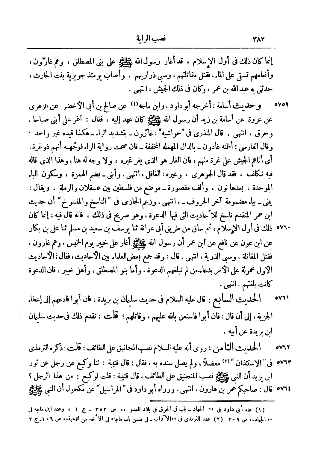 وَحَدِيثُ أُسَامَةَ: أَخْرَجَهُ أَبُو دَاوُد، وَابْنُ مَاجَهْ 1 عَنْ صَالِحِ بْنِ أَبِي الْأَخْضَرِ عَنْ الزُّهْرِيِّ عَنْ عُرْوَةَ عَنْ أُسَامَةَ بْنِ زَيْدٍ أَنَّ رَسُولَ اللَّهِ صَلَّى اللَّهُ عَلَيْهِ وَسَلَّمَ كَانَ عَهِدَ إلَيْهِ، فقال: اغز عَلَى أُبْنَى صَبَاحًا، وَحَرِّقْ، انْتَهَى. قَالَ الْمُنْذِرِيُّ فِي "حَوَاشِيهِ": غَارُّونَ - بِتَشْدِيدِ الرَّاءِ - هَكَذَا قَيَّدَهُ غَيْرُ وَاحِدٍ، وَقَالَ الْفَارِسِيُّ: أَظُنُّهُ غَادُونَ، بِالدَّالِ الْمُهْمَلَةِ الْمُخَفَّفَةِ، فَإِنْ صَحَّتْ رِوَايَةُ الرَّاءِ فَوَجْهُهُ أَنَّهُمْ ذُو غِرَّةٍ، أَيْ أَتَاهُمْ الْجَيْشُ عَلَى غِرَّةٍ مِنْهُمْ، فَإِنَّ الْغَارَّ هُوَ الَّذِي يَغُرُّ غَيْرَهُ، وَلَا وَجْهَ لَهُ هُنَا، وَهَذَا الَّذِي قَالَهُ فِيهِ تَكَلُّفٌ، فَقَدْ قَالَ الْجَوْهَرِيُّ، وَغَيْرُهُ: الْغَافِلُ، انْتَهَى. وَأُبْنَى - بِضَمِّ الْهَمْزَةِ، وَسُكُونِ الْبَاءِ الْمُوَحَّدَةِ، بَعْدَهَا نُونٌ، وَأَلِفٌ مَقْصُورَةٌ - مَوْضِعٌ مِنْ فِلَسْطِينَ بَيْنَ عَسْقَلَانَ وَالرَّمْلَةِ، وَيُقَالُ: يُبْنَى - بِيَاءٍ مَضْمُومَةٍ آخِرَ الْحُرُوفِ - انْتَهَى. وَزَعَمَ الْحَازِمِيُّ فِي "النَّاسِخِ وَالْمَنْسُوخِ" أَنَّ حَدِيثَ ابْنِ عُمَرَ الْمُتَقَدِّمَ نَاسِخٌ لِلْأَحَادِيثِ الَّتِي فِيهَا الدَّعْوَةُ، وَهُوَ صَرِيحٌ فِي ذَلِكَ، فَإِنَّهُ قَالَ فِيهِ: إنَّمَا كَانَ ذَلِكَ فِي أَوَّلِ الْإِسْلَامِ، ثُمَّ سَاقَ مِنْ طَرِيقِ أَبِي عَوَانَةَ ثَنَا يُوسُفُ بْنُ سَعِيدِ بْنِ مُسْلِمٍ ثَنَا عَلِيُّ بْنُ بَكَّارَ عَنْ ابْنِ عَوْنٍ عَنْ نَافِعٍ عَنْ ابْنِ عُمَرَ أَنَّ رَسُولَ اللَّهِ صَلَّى اللَّهُ عَلَيْهِ وَسَلَّمَ أَغَارَ عَلَى خَيْبَرٍ يَوْمَ الْخَمِيسِ، وَهُمْ غَارُّونَ، فَقَتَلَ الْمُقَاتِلَةَ، وَسَبَى الذُّرِّيَّةَ، انْتَهَى. قَالَ: وَقَدْ جَمَعَ بَعْضُ الْعُلَمَاءِ بَيْنَ الْأَحَادِيثِ، فَقَالَ: الْأَحَادِيثُ الْأُوَلُ مَحْمُولَةٌ عَلَى الْأَمْرِ بِدُعَاءِ مَنْ لَمْ تَبْلُغْهُمْ الدَّعْوَةُ، وَأَمَّا بَنُو الْمُصْطَلِقِ، وَأَهْلُ خَيْبَرَ، فَإِنَّ الدَّعْوَةَ كَانَتْ بَلَغَتْهُمْ، انْتَهَى.
