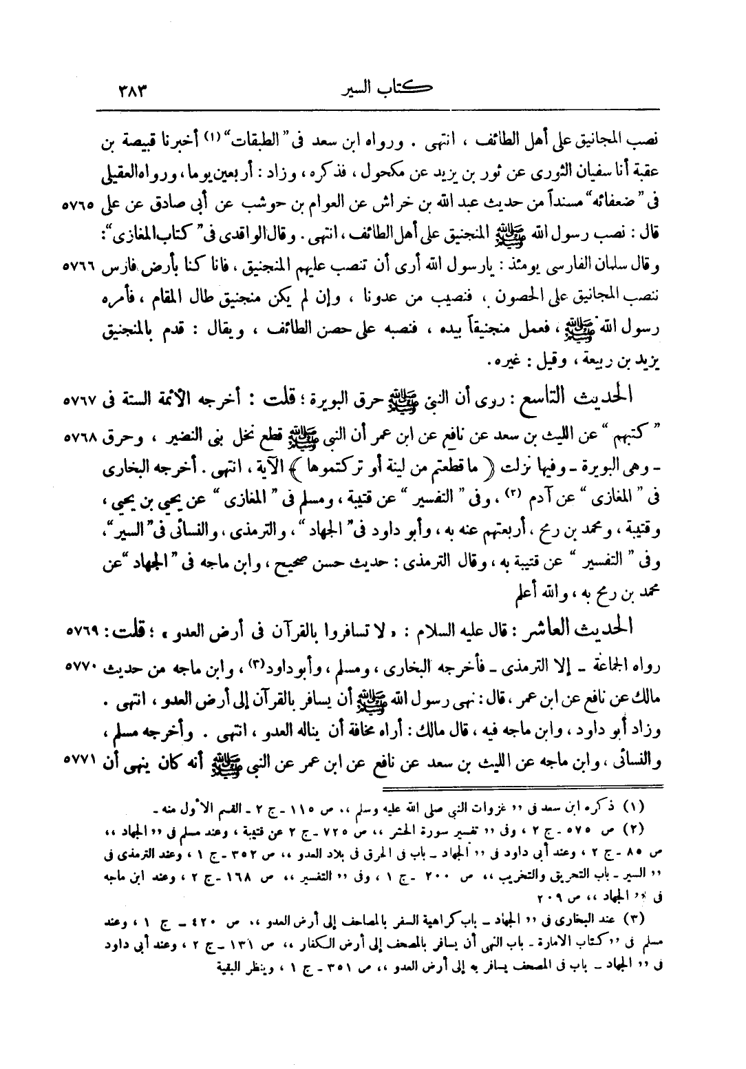 3 عند البخاري في "الجهاد - باب كراهية السفر بالمصاحف إلى أرض العدو" ص 420 - ج 1، وعند مسلم في "كتاب الامارات - باب النهي أن يسافر بالمصحف إلى أرض الكفار" ص 131 - ج 2، وعند أبي داود في "الجهاد - باب في المصحف يسافر به إلى أرض العدو" ص 351 - ج 1، وينظر البقية.