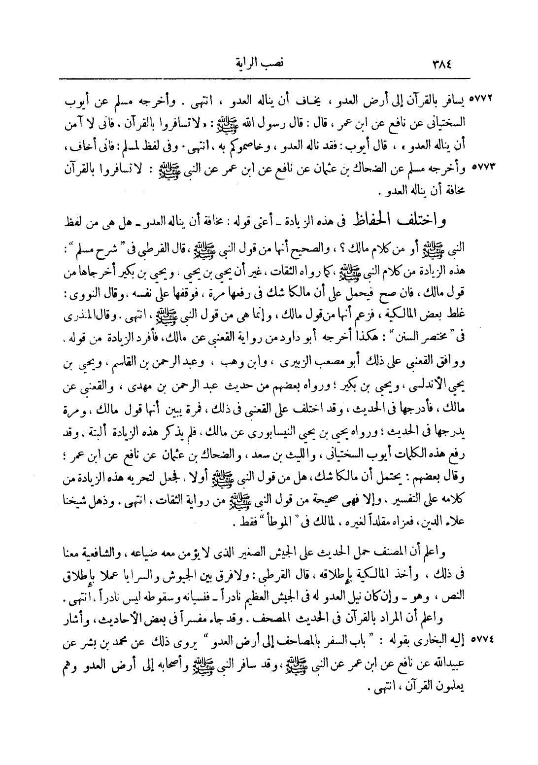 وَاعْلَمْ أَنَّ الْمُرَادَ بِالْقُرْآنِ فِي الْحَدِيثِ الْمُصْحَفُ. وَقَدْ جَاءَ مُفَسَّرًا فِي بَعْضِ الْأَحَادِيثِ، وَأَشَارَ إلَيْهِ الْبُخَارِيُّ بِقَوْلِهِ: "بَابُ السَّفَرُ بِالْمَصَاحِفِ إلَى أَرْضِ الْعَدُوِّ" يُرْوَى ذَلِكَ عَنْ مُحَمَّدِ بْنِ بِشْرٍ عَنْ عُبَيْدِ اللَّهِ عَنْ نَافِعٍ عَنْ ابْنِ عُمَرَ عَنْ النَّبِيِّ صَلَّى اللَّهُ عَلَيْهِ وَسَلَّمَ، وَقَدْ سَافَرَ النَّبِيُّ صَلَّى اللَّهُ عَلَيْهِ وَسَلَّمَ وَأَصْحَابُهُ إلَى أَرْضِ الْعَدُوِّ وَهُمْ يَعْلَمُونَ الْقُرْآنَ، انْتَهَى.