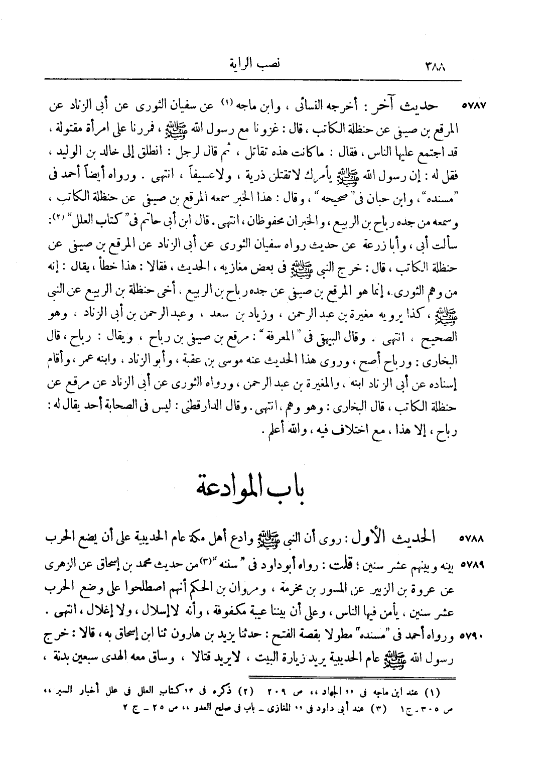 حَدِيثٌ آخَرُ: أَخْرَجَهُ النَّسَائِيُّ، وَابْنُ مَاجَهْ 1 عَنْ سُفْيَانَ الثَّوْرِيِّ عَنْ أَبِي الزِّنَادِ عَنْ الْمُرَقِّعِ بْنِ صَيْفِيٍّ عَنْ حَنْظَلَةَ الْكَاتِبِ، قَالَ: غَزَوْنَا مَعَ رَسُولِ اللَّهِ صَلَّى اللَّهُ عَلَيْهِ وَسَلَّمَ، فَمَرَرْنَا عَلَى امْرَأَةٍ مَقْتُولَةٍ، قَدْ اجْتَمَعَ عَلَيْهَا النَّاسُ، فَقَالَ: مَا كَانَتْ هَذِهِ تُقَاتِلُ، ثُمَّ قَالَ لِرَجُلٍ: " انْطَلِقْ إلَى خَالِدِ بْنِ الْوَلِيدِ، فَقُلْ لَهُ: إنَّ رَسُولَ اللَّهِ صَلَّى اللَّهُ عَلَيْهِ وَسَلَّمَ يَأْمُرُك لَا تَقْتُلَنَّ ذُرِّيَّةً، وَلَا عَسِيفًا"، انْتَهَى. وَرَوَاهُ أَيْضًا أَحْمَدُ فِي "مُسْنَدِهِ"، وَابْنُ حِبَّانَ فِي "صَحِيحِهِ"، وَقَالَ: هَذَا الْخَبَرُ سَمِعَهُ الْمُرَقِّعُ بْنُ صَيْفِيٍّ عَنْ حَنْظَلَةَ الْكَاتِبِ، وَسَمِعَهُ مِنْ جَدِّهِ رَبَاحِ بْنِ الرَّبِيعِ، وَالْخَبَرَانِ مَحْفُوظَانِ، انْتَهَى. قَالَ ابْنُ أَبِي حَاتِمٍ فِي "كِتَابِ الْعِلَلِ" 2: سَأَلْت أَبِي، وَأَبَا زُرْعَةَ عَنْ حَدِيثٍ رَوَاهُ سُفْيَانُ الثَّوْرِيُّ عَنْ أَبِي الزِّنَادِ عَنْ الْمُرَقِّعِ بْنِ صَيْفِيٍّ عَنْ حَنْظَلَةَ الْكَاتِبِ، قَالَ: خَرَجَ النَّبِيُّ صَلَّى اللَّهُ عَلَيْهِ وَسَلَّمَ فِي بَعْضِ مَغَازِيهِ، الْحَدِيثَ، فَقَالَا: هَذَا خَطَأٌ، فَقَالَ: إنَّهُ مِنْ وَهْمِ الثَّوْرِيِّ، إنَّمَا هُوَ الْمُرَقِّعُ بْنُ صَيْفِيٍّ عَنْ جَدِّهِ رَبَاحِ بْنِ الرَّبِيعِ، أَخِي حَنْظَلَةَ بْنِ الرَّبِيعِ عَنْ النَّبِيِّ صَلَّى اللَّهُ عَلَيْهِ وَسَلَّمَ، كَذَا يَرْوِيهِ مُغِيرَةُ بْنُ عَبْدِ الرَّحْمَنِ، وَزِيَادُ بْنُ سَعْدٍ، وَعَبْدُ الرَّحْمَنِ بْنُ أَبِي الزِّنَادِ، وَهُوَ الصَّحِيحُ، انْتَهَى. وَقَالَ الْبَيْهَقِيُّ فِي "الْمَعْرِفَةِ": مُرَقِّعُ بْنُ صَيْفِيِّ بْنِ رَبَاحٍ، وَيُقَالُ: رباح، قَالَ الْبُخَارِيُّ: وَرَبَاحُ أَصَحُّ، وَرَوَى هَذَا الْحَدِيثَ عَنْهُ مُوسَى بْنُ عُقْبَةَ، وَأَبُو الزِّنَادِ، وَأَبِيهِ عُمَرُ، وَأَقَامَ إسْنَادَهُ عَنْ أَبِي الزِّنَادِ أَبِيهِ، وَالْمُغِيرَةُ بْنُ عَبْدِ الرَّحْمَنِ، وَرَوَاهُ الثَّوْرِيُّ عَنْ أَبِي الزِّنَادِ عَنْ مُرَقِّعٍ عَنْ حَنْظَلَةَ الْكَاتِبِ، قَالَ الْبُخَارِيُّ: وَهُوَ وَهْمٌ، انْتَهَى. وَقَالَ الدَّارَقُطْنِيُّ: لَيْسَ فِي الصَّحَابَةِ أَحَدٌ يُقَالُ لَهُ: رَبَاحٌ، إلَّا هَذَا، مَعَ اخْتِلَافٍ فِيهِ، وَاَللَّهُ أَعْلَمُ.